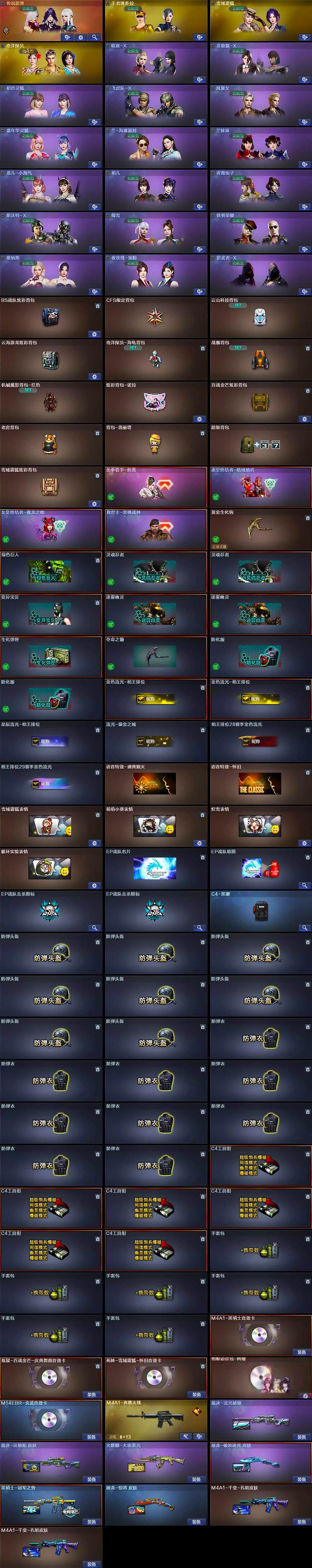 【道具】:BS战队炫彩背包,CFS限定背包,云山科技背包,云海游龙炫彩背包,奇洋探员-海龟背包,战舰背包,机械魔影背包-红色,炫彩背包-诺拉,百战金芒炫彩背包,老虎背包,背包-洛丽塔,超级背包,雪域霜狐炫彩背包,圣拳猎手-炽雪,虚空终结者-暗域熔岩,女皇终结者-魔龙之吻,救世主-黑桃战神,黄金生化钩,绿色巨人,灵魂忍者*2,变异宝贝,迷雾幽灵*2,生化弹匣,夺命之镰