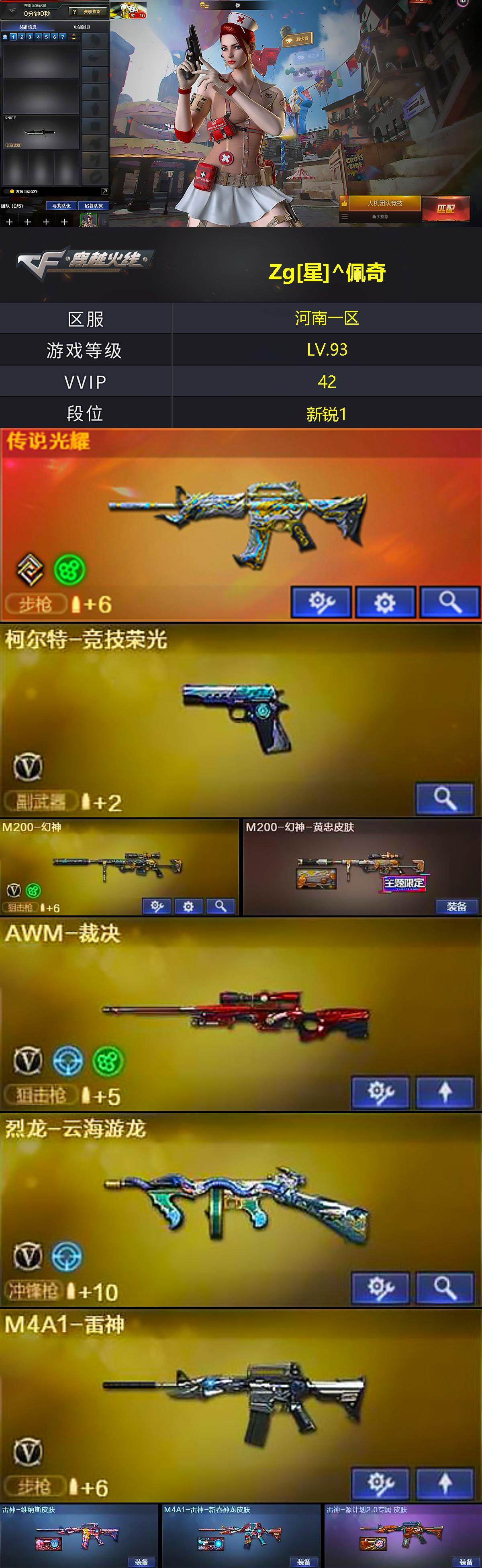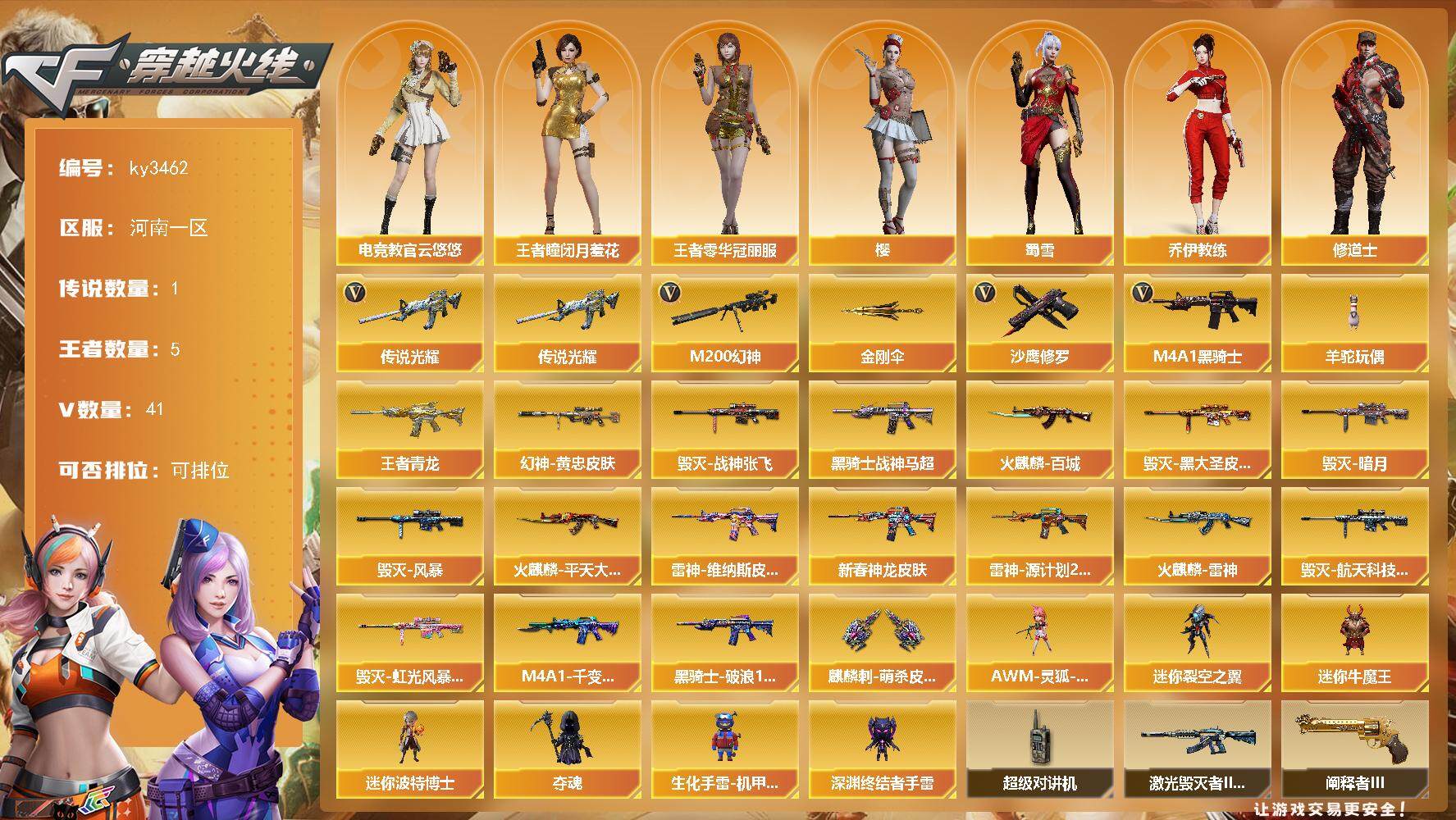[13656105]河南一区-41V-5王者-0炫金 【传说武器】:传说光耀 【热门武器】:传说光耀,M200-幻神,M4A1-黑骑士*2,羊驼玩偶,沙鹰-修罗,金刚伞 【王者炫金武器】:王者青龙 【皮肤】:M200-幻神-黄忠皮肤,雷神-维纳斯皮肤,M4A1-雷神-新春神龙皮肤,雷神-源计划2.0专属 皮肤,火麒麟-雷神,火麒麟-平天大圣,火麒麟-百城,毁灭-暗月,毁灭-战神张飞,毁灭-黑大圣皮肤,毁灭-风暴,毁灭-航天科技皮肤,毁灭-虹光风暴 皮肤,M4A1-千变-孔明皮肤,黑骑士-战神马超,黑骑士-破浪10年皮肤,麒麟刺-萌杀皮肤 【角色】:樱,电竞教官-云悠悠,王者-瞳-闭月羞花,王者零-华冠丽服,乔伊教练,修道士,云海玲珑,暗夜-X,初恋灵狐,电竞少女,风暴女,嘉年华灵狐,娟娟,兰-新年限定,猎狐者-追月,灵狐-花神,灵狐者-X,灵狐者-七夕宝贝,麻雀,曼陀罗-礼服,萌儿,潘多拉-X,斯沃特-X,蜀雪,兔囡囡,维纳斯,新娜塔莎,雪莉杨-摸金校尉,夜玫瑰-幻能朋克,樱-战斗天使,影武者-X,游珑儿 【人偶武器】:AWM-灵狐-15周年嘉年华,迷你裂空之翼*2,迷你牛魔王,迷你波特博士,夺魂,生化手雷-机甲核心*3,深渊终结者手雷 【暴走生化】:超级对讲机 【挑战大师】:激光毁灭者III-白马银枪,阐释者III*2 【英雄级武器】:AK47-火麒麟,M4A1-雷神,M4A1-黑骑士*2,AK12-天启,AK47-机械迷城,无影-神兵利器,黑武士-锦绣游龙,M4A1-玫瑰精灵,烈火-动感闪耀,M4A1-雷霆王者-觉醒版,Barrett-毁灭,AWM-裁决,M200-幻神,烈龙-云海游龙,沙鹰-修罗,柯尔特-竞技荣光,天神-动感闪耀,麒麟刺,擎天-竞技荣光*2,屠龙-动感闪耀,擎天-云海游龙,屠龙-云海游龙,高爆手雷-竞技荣光*5,手雷-动感闪耀,手雷-云海游龙,闪光弹-竞技荣光*2,闪光弹-雷霆王者-觉醒版,烟雾弹-竞技荣光*4 【道具】:云海游龙炫彩背包,全能枪王背包,炫彩背包,哔哩哔哩名片,夺命之镰,防化服,金色流光-枪王排位*2,星辰流光-枪王排位,枪王排位29赛季金色流光,动感闪耀表情,云海游龙表情,防弹头盔*2,防弹衣*2,C4工具钳*2,手雷包*2 【特殊枪械】:2黑骑士