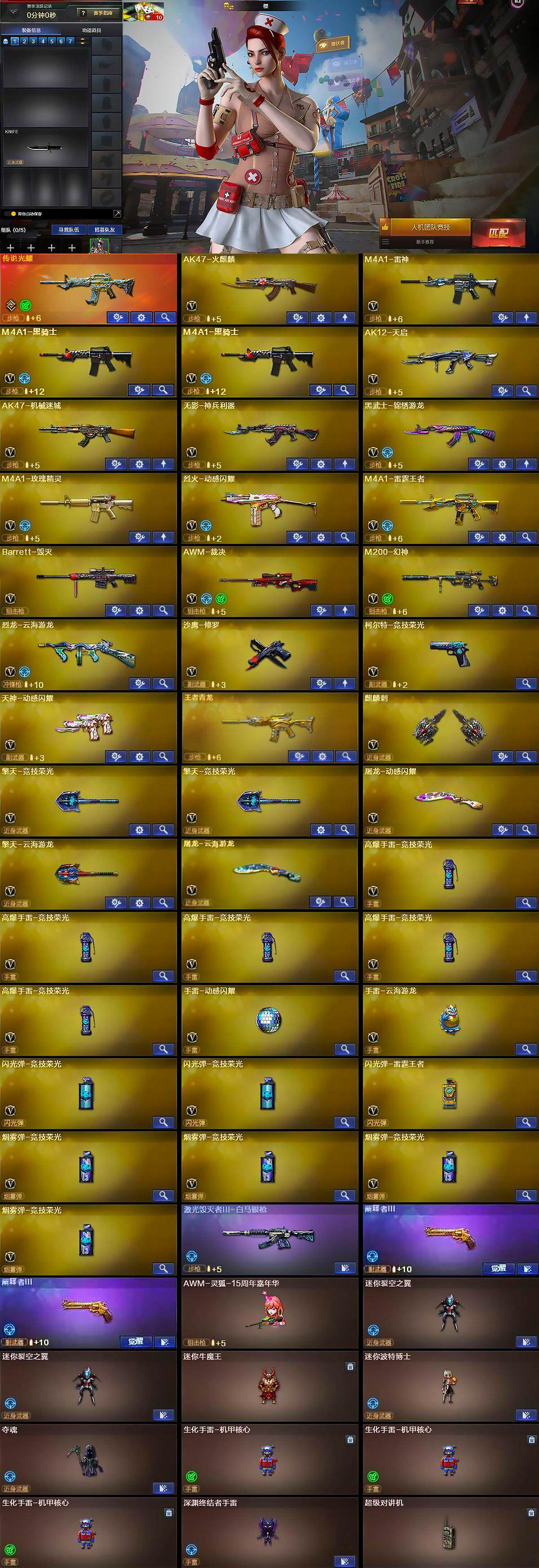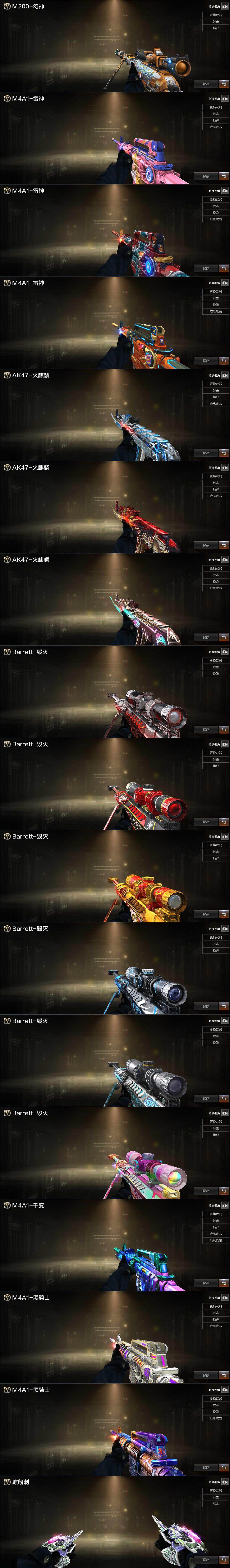 【英雄级武器】:AK47-火麒麟,M4A1-雷神,M4A1-黑骑士*2,AK12-天启,AK47-机械迷城,无影-神兵利器,黑武士-锦绣游龙,M4A1-玫瑰精灵,烈火-动感闪耀,M4A1-雷霆王者-觉醒版,Barrett-毁灭,AWM-裁决,M200-幻神,烈龙-云海游龙,沙鹰-修罗,柯尔特-竞技荣光,天神-动感闪耀,麒麟刺,擎天-竞技荣光*2,屠龙-动感闪耀,擎天-云海游龙,屠龙-云海游龙,高爆手雷-竞技荣光*5,手雷-动感闪耀,手雷-云海游龙,闪光弹-竞技荣光*2,闪光弹-雷霆王者-觉醒版,烟雾弹-竞技荣光*4