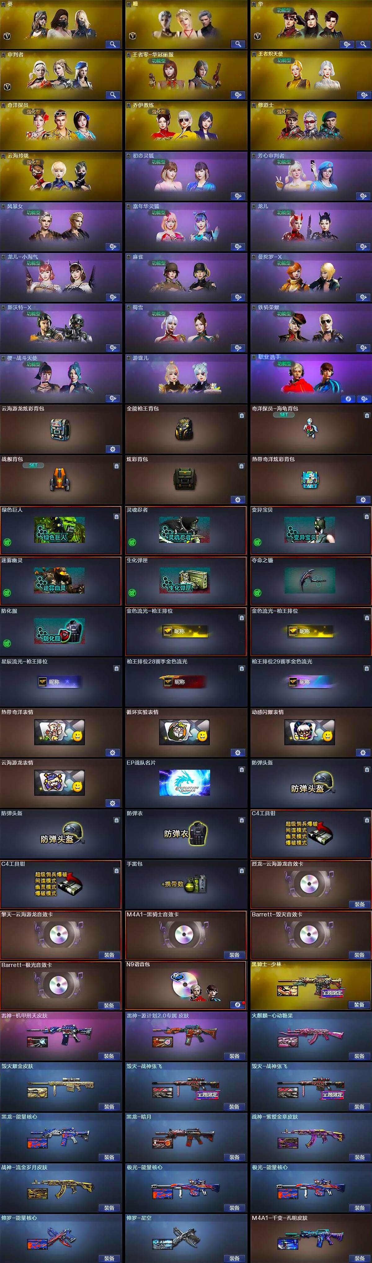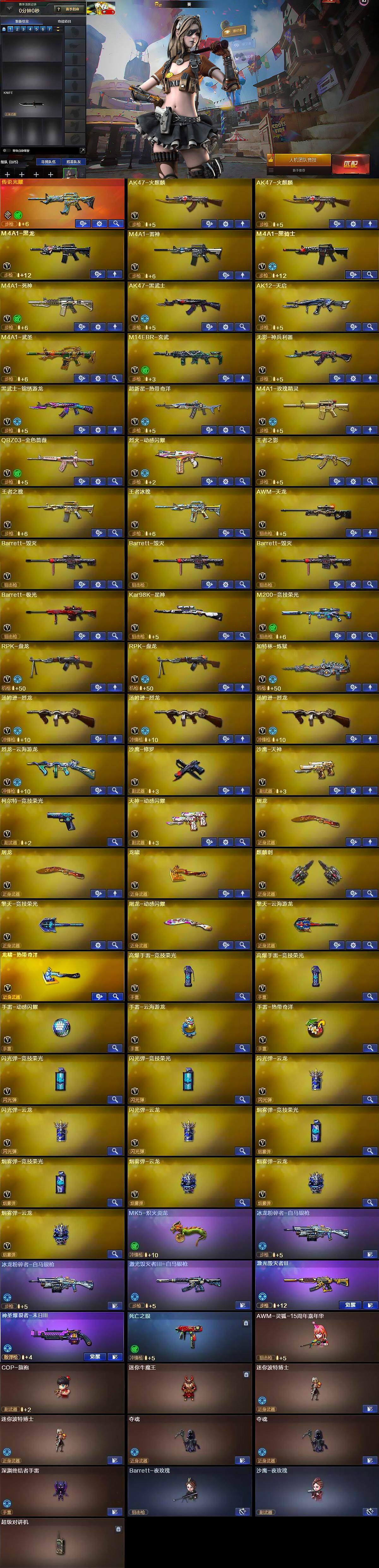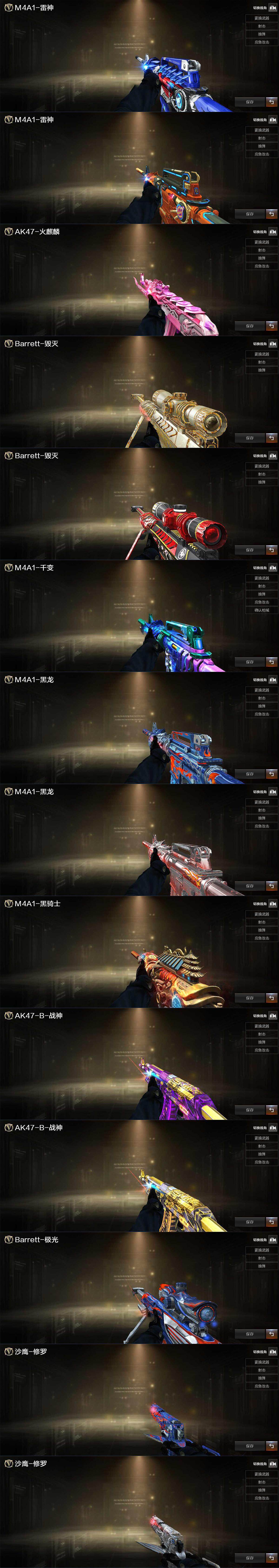 【英雄级武器】:AK47-火麒麟*2,M4A1-黑龙,M4A1-雷神,M4A1-黑骑士,M4A1-死神,AK47-黑武士,AK12-天启,M4A1-武圣,M14EBR-玄武,无影-神兵利器,黑武士-锦绣游龙,超新星-热带奇洋,M4A1-玫瑰精灵,QBZ03-金色蔷薇,烈火-动感闪耀,王者之影-觉醒版,王者之魄-觉醒版,王者冰魄-觉醒版,AWM-天龙,Barrett-毁灭*3,Barrett-极光,Kar98K-星神,M200-竞技荣光,RPK-盘龙*2,加特林-炼狱,汤姆逊-烈龙*3,烈龙-云海游龙,沙鹰-修罗,沙鹰-天神,柯尔特-竞技荣光,天神-动感闪耀,屠龙*2,龙啸,麒麟刺,擎天-竞技荣光,屠龙-动感闪耀,擎天-云海游龙,龙啸-热带奇洋,高爆手雷-竞技荣光*2,手雷-动感闪耀,手雷-云海游龙,手雷-