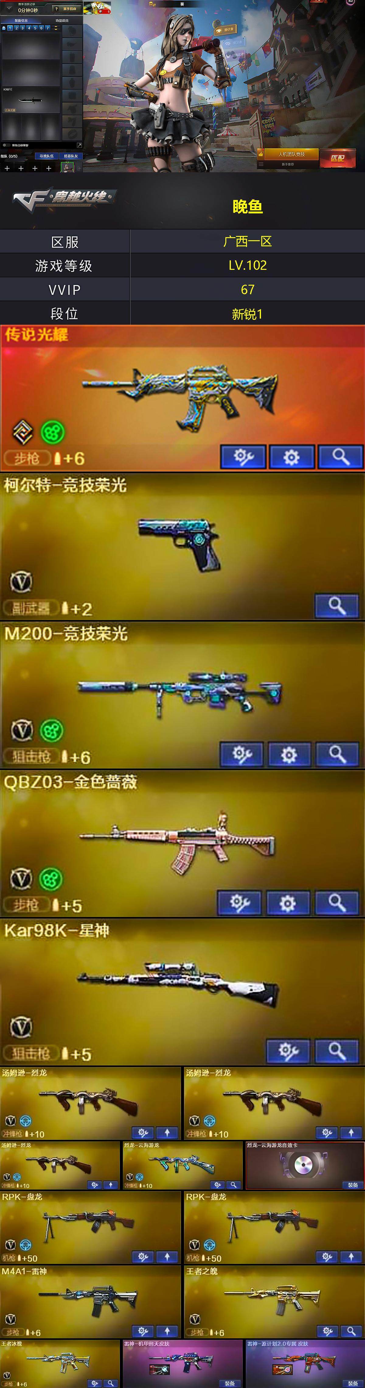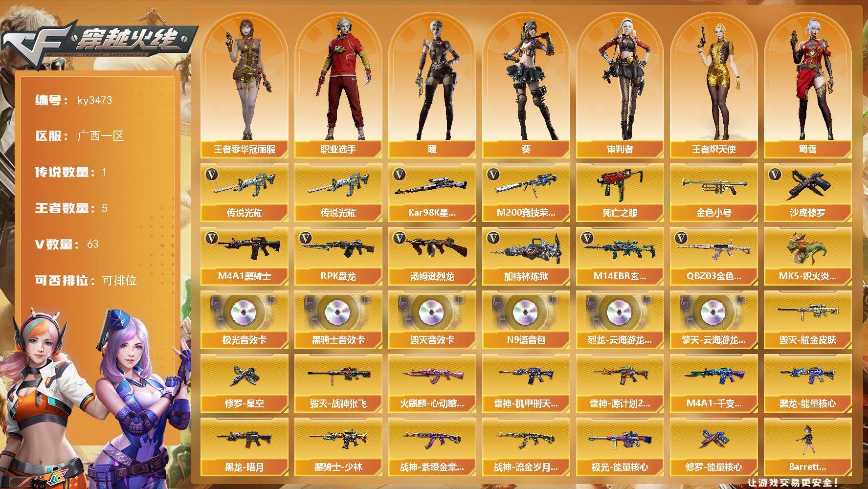 [13657995]广西一区-63V-5王者-0炫金 【传说武器】:传说光耀 【热门武器】:传说光耀,QBZ03-金色蔷薇,M14EBR-玄武,M200-竞技荣光,死亡之眼,Kar98K-星神,金色小号,M4A1-黑骑士,汤姆逊-烈龙*3,RPK-盘龙*2,加特林-炼狱,MK5-炽火炎龙,沙鹰-修罗 【音效卡】:烈龙-云海游龙音效卡,擎天-云海游龙音效卡,M4A1-黑骑士音效卡,Barrett-毁灭音效卡,Barrett-极光音效卡,N9语音包 【皮肤】:雷神-机甲刑天皮肤,雷神-源计划2.0专属 皮肤,火麒麟-心动糖果,毁灭耀金皮肤,毁灭-战神张飞*2,M4A1-千变-孔明皮肤,黑龙-能量核心,黑龙-暗月,黑骑士-少林,战神-紫绶金章皮肤,战神-流金岁月皮肤,极光-能量核心*2,修罗-能量核心,修罗-星空 【角色】:葵,瞳,华,审判者,王者零-华冠丽服,王者炽天使,奇洋探员,乔伊教练,修道士,云海玲珑,初恋灵狐,芳心审判者,风暴女,嘉年华灵狐,龙儿,龙儿-小淘气,麻雀,曼陀罗-X,斯沃特-X,蜀雪,铁骑荣耀,兔囡囡,樱-战斗天使,游珑儿,职业选手,智影 【人偶武器】:MK5-炽火炎龙,AWM-灵狐-15周年嘉年华,COP-旗袍,迷你牛魔王,迷你波特博士*2,夺魂*2,深渊终结者手雷,Barrett-夜玫瑰,沙鹰-夜玫瑰,灵狐娃娃手雷*2 【暴走生化】:死亡之眼,超级对讲机 【挑战大师】:冰龙粉碎者-白马银枪*2,激光毁灭者III-白马银枪,激光毁灭者III,神圣爆裂者-末日III 【英雄级武器】:AK47-火麒麟*2,M4A1-黑龙,M4A1-雷神,M4A1-黑骑士,M4A1-死神,AK47-黑武士,AK12-天启,M4A1-武圣,M14EBR-玄武,无影-神兵利器,黑武士-锦绣游龙,超新星-热带奇洋,M4A1-玫瑰精灵,QBZ03-金色蔷薇,烈火-动感闪耀,王者之影-觉醒版,王者之魄-觉醒版,王者冰魄-觉醒版,AWM-天龙,Barrett-毁灭*3,Barrett-极光,Kar98K-星神,M200-竞技荣光,RPK-盘龙*2,加特林-炼狱,汤姆逊-烈龙*3,烈龙-云海游龙,沙鹰-修罗,沙鹰-天神,柯尔特-竞技荣光,天神-动感闪耀,屠龙*2,龙啸,麒麟刺,擎天-竞技荣光,屠龙-动感闪耀,擎天-云海游龙,龙啸-热带奇洋,高爆手雷-竞技荣光*2,手雷-动感闪耀,手雷-云海游龙,手雷-