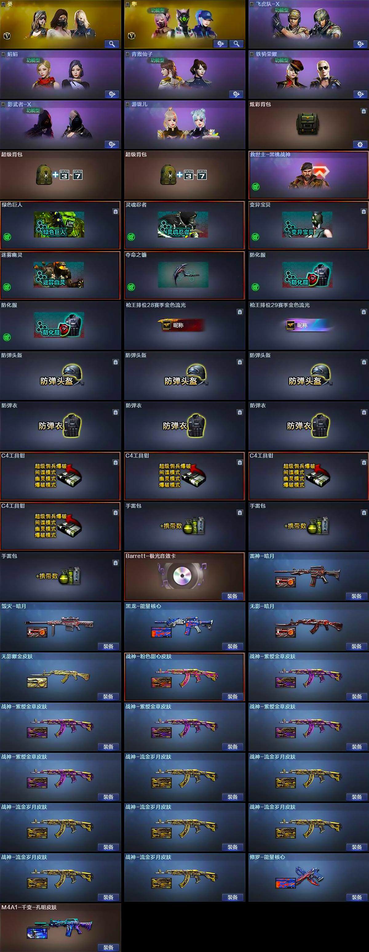 【道具】:炫彩背包,超级背包*2,救世主-黑桃战神,绿色巨人,灵魂忍者,变异宝贝,迷雾幽灵,夺命之镰,防化服*2,枪王排位28赛季金色流光,枪王排位29赛季金色流光,防弹头盔*3,防弹衣*3,C4工具钳*4,手雷包*3
