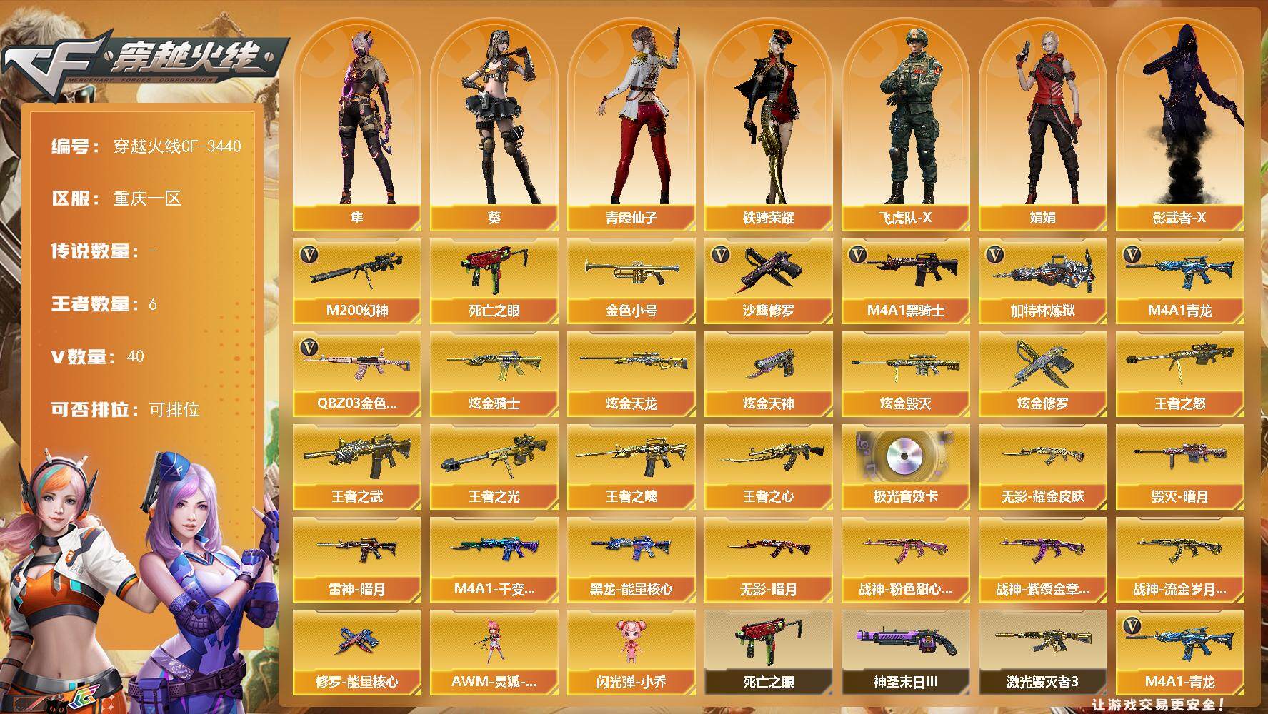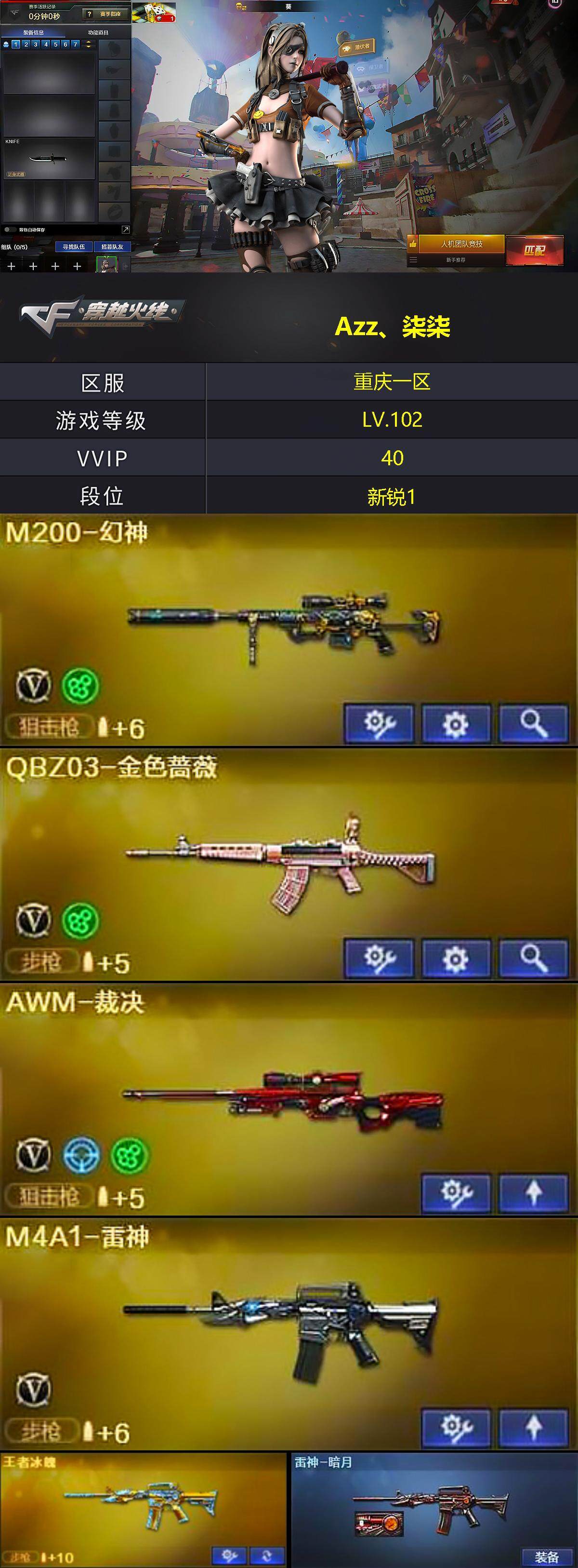 [13658465]重庆一区-40V-6王者-5炫金 【热门武器】:QBZ03-金色蔷薇,M4A1-青龙,M200-幻神,死亡之眼*2,金色小号,M4A1-黑骑士,加特林-炼狱,沙鹰-修罗 【王者炫金武器】:王者之武,王者之魄,王者之心,王者之光,王者之怒,炫金骑士,炫金毁灭,炫金天龙,炫金天神,炫金修罗 【音效卡】:Barrett-极光音效卡 【皮肤】:雷神-暗月,毁灭-暗月,M4A1-千变-孔明皮肤,黑龙-能量核心,无影-暗月,无影耀金皮肤,战神-粉色甜心皮肤,战神-紫绶金章皮肤*5,战神-流金岁月皮肤*7,修罗-能量核心 【角色】:葵,隼,飞虎队-X,娟娟,青霞仙子,铁骑荣耀,影武者-X,游珑儿 【人偶武器】:AWM-灵狐-15周年嘉年华,闪光弹-小乔 【暴走生化】:死亡之眼*2 【挑战大师】:激光毁灭者III,神圣爆裂者-末日III 【英雄级武器】:AK47-火麒麟,M4A1-黑龙,M4A1-雷神,M4A1-黑骑士,AK47-无影,M4A1-青龙,QBZ03-天罚,无影-神兵利器,黑武士-锦绣游龙,QBZ03-金色蔷薇,AK-47-猩红传说*8,AK47-B-战神,黑骑士-海王,AWM-天龙,Barrett-毁灭,Barrett-极光,AWM-裁决,M200-幻神,加特林-炼狱,沙鹰-修罗,屠龙*3,麒麟刺,王者之击-觉醒版,高爆手雷-竞技荣光,闪光弹-竞技荣光*2,烟雾弹-竞技荣光*2,M4A1-赤狱骑士 【道具】:炫彩背包,超级背包*2,救世主-黑桃战神,绿色巨人,灵魂忍者,变异宝贝,迷雾幽灵,夺命之镰,防化服*2,枪王排位28赛季金色流光,枪王排位29赛季金色流光,防弹头盔*3,防弹衣*3,C4工具钳*4,手雷包*3 【特殊枪械】:1黑骑士,1炼狱