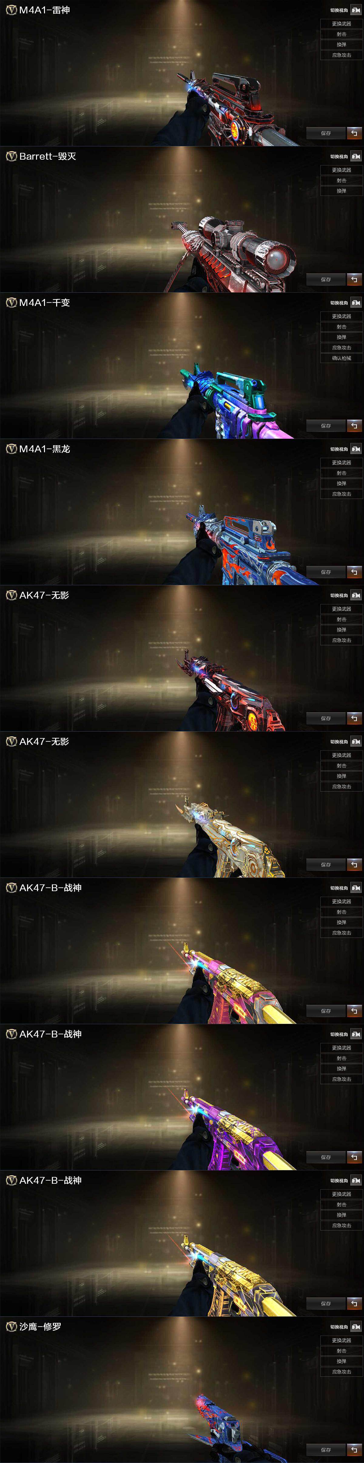 【热门武器】:QBZ03-金色蔷薇,M4A1-青龙,M200-幻神,死亡之眼*2,金色小号,M4A1-黑骑士,加特林-炼狱,沙鹰-修罗