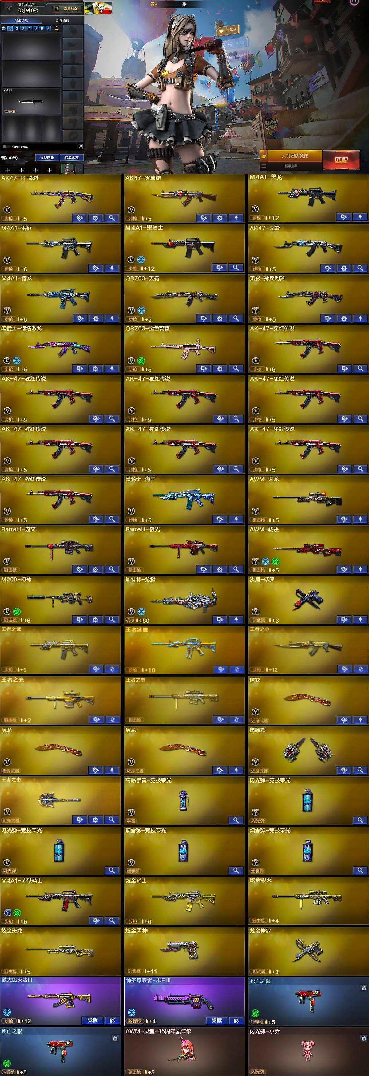 - [12943219]辽宁一区-150V-11王者-7炫金 【热门武器】:QBZ03-金色蔷薇,M14EBR-玄武,Scar Light-白虎,HK417-朱雀,M4A1-青龙*2,M200-幻神,M200-竞技荣光,死亡之眼,白虎-电玩蓝兔,Cat-刀锋,炼狱-迷你小钢,毒蜂,M4A1-黑骑士*2,汤姆逊-烈龙*8,RPK-盘龙*6,加特林-炼狱*2,斯泰尔-蝴蝶,USP-雷暴,COP-堕天神,沙鹰-修罗*9 【王者炫金武器】:炫金骑士*3,炫金千变,炫金雷神*3,玫瑰精灵-悦动 【音效卡】:M200-幻神音效卡,AK47-火麒麟音效卡,M4A1-雷神音效卡,M4A1-黑龙音效卡,M4A1-黑骑士音效卡,Barrett-毁灭音效卡,QBZ03-金色蔷薇音效卡,Scar Light-白虎音效卡,70KG语音包 【稀有皮肤】:幻神-巅峰荣耀,QBZ03-冠军之薇,雷神-冠军之魄,火麒麟-平天大圣,火麒麟-盘古,黑骑士-暗月,毁灭-暗月,毁灭耀金皮肤*2,天神-暗月 【角色】:王者葵-惊若翩鸿,零-水下丽影,灵狐者-职业经理,审判者,葵,樱,瞳,魅影,炫,迷迭香,雨棠,电竞教官-云悠悠,月兔特工,荒漠琉璃,铁骑荣耀,职业选手 【人偶武器】:斯泰尔-蝴蝶,天龙-曼陀罗,巴雷特-零-水下丽影*2,M4A1-雷神-精英刀锋,M37-葵,COP-旗袍,Cat-刀锋,炼狱-迷你小钢,黄金迷你深渊冰龙,迷你超能女侍,迷你裂空之翼,黄金迷你裂空之翼,迷你牛牛,迷你生化手雷*2,闪光弹-小乔,闪光弹-貂蝉,高爆手雷-大乔 【暴走生化】:斯泰尔-蝴蝶,炼狱-迷你小钢,毒蜂,死亡之眼,异变清道夫,超级对讲机 【挑战大师】:神圣爆裂者III,机甲撕裂者III,阐释者III*2,VEPR-12-金魔,冰龙粉碎者-白马银枪*2 【英雄级武器】:M200-竞技荣光,柯尔特-竞技荣光,擎天-竞技荣光,高爆手雷-竞技荣光,烟雾弹-竞技荣光*3,闪光弹-竞技荣光,M4A1-堕天神,COP-堕天神,麒麟刺-堕天神*2,龙啸-堕天神*2,USP-雷暴,M4A1-武圣,Glock18-武圣,QBZ03-金色蔷薇,M14EBR-玄武,Scar Light-白虎,HK417-朱雀,M4A1-青龙*2,白虎-电玩蓝兔,M4A1-雷神*2,M4A1-黑龙*2,M4A1-玫瑰精灵,M4A1-黑骑士*2,M4A1-死神,RPK-盘龙*6,加