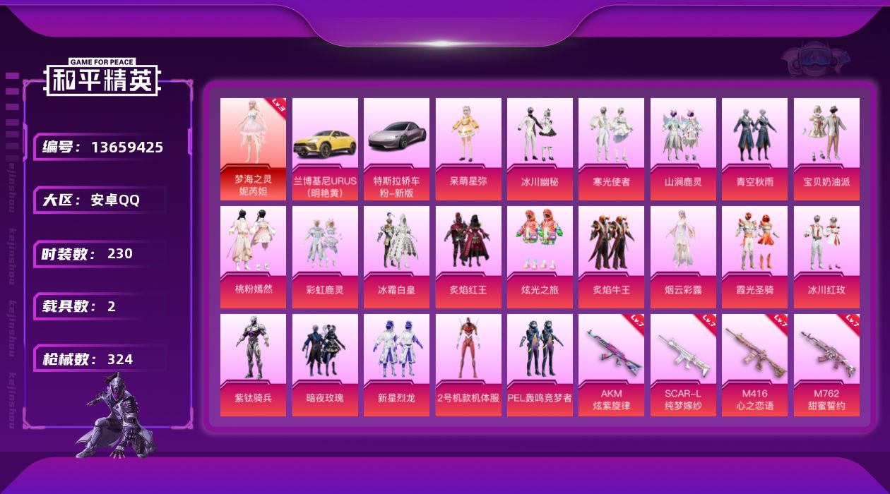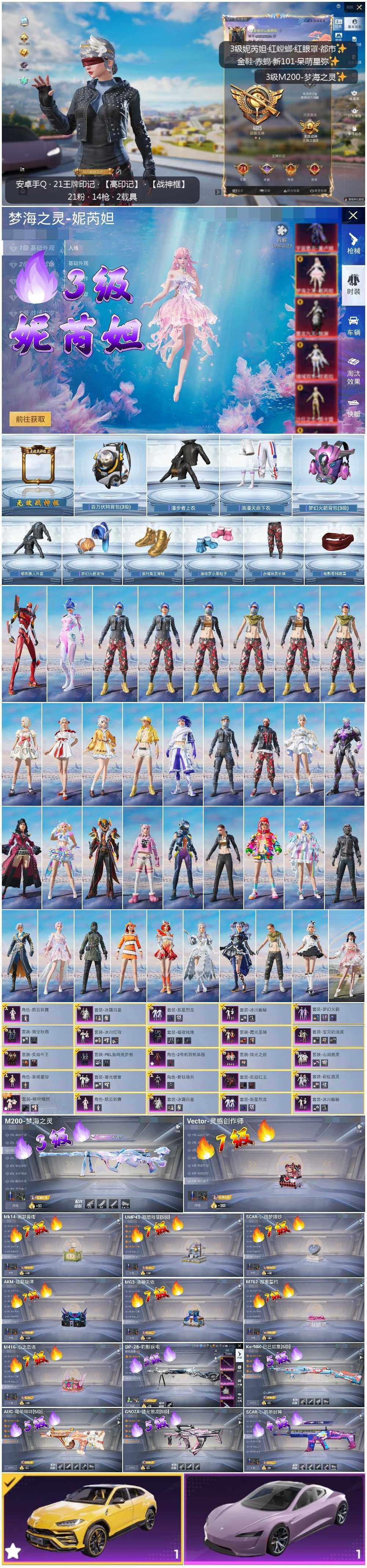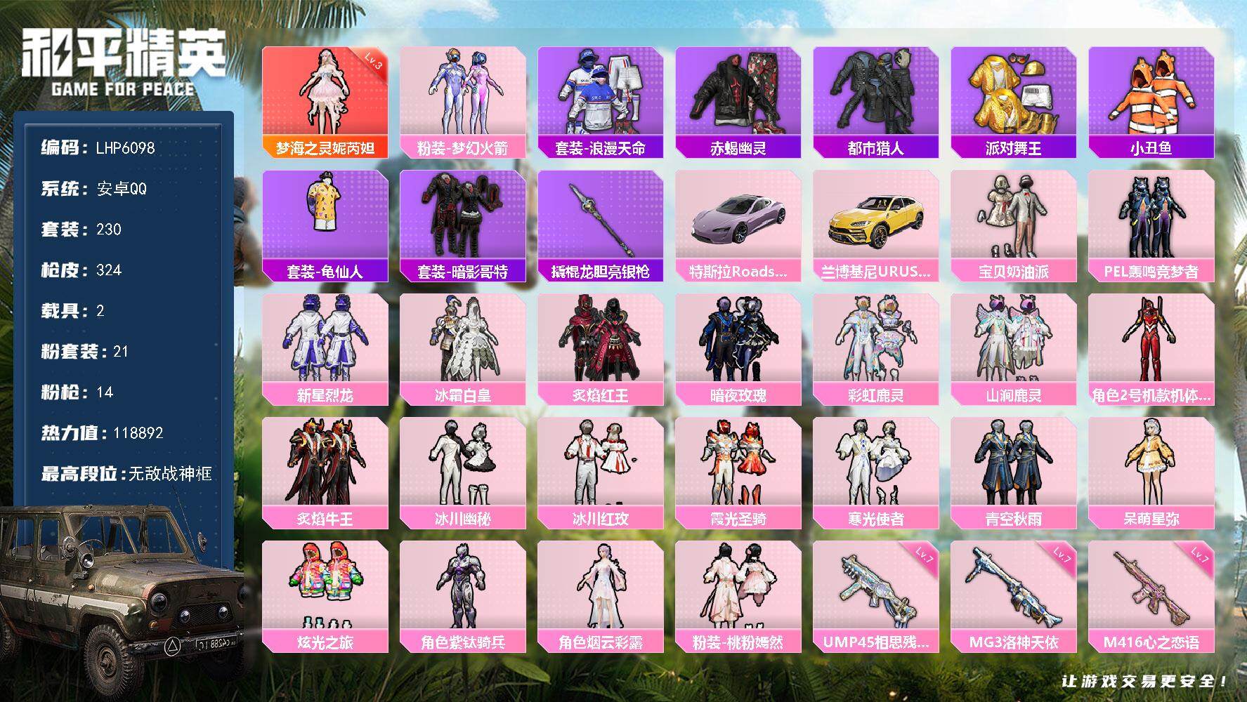 [13659425]可二次【店主推荐捡漏号!可直接换绑】/素材身法号/无敌战神框1/绝世印记1/地铁满天赋 安卓 手Q-无敌战神框-1神装-21粉装-14特效枪-2载具-4粉色飞行器-11.8w热力值-21王牌印记-230套装-324枪皮【红色神装等级】:梦海之灵-妮芮妲(三级)【热门品类】:粉装-梦幻火箭,套装-浪漫天命,套装-赤蝎幽灵,套装-都市猎人,套装-派对舞王,套装-小丑鱼,套装-龟仙人,套装-暗影哥特,撬棍-龙胆亮银枪【粉色载具】:特斯拉Roadster(沁心粉),兰博基尼URUS(明艳黄)【粉色套装】:粉装-宝贝奶油派,粉装-梦幻火箭,粉装-PEL轰鸣竞梦者,粉装-新星烈龙,粉装-冰霜白皇,粉装-炙焰红王,粉装-暗夜玫瑰,粉装-彩虹鹿灵,粉装-山涧鹿灵,角色-2号机款机体服,粉装-炙焰牛王,粉装-冰川幽秘,粉装-冰川红玫,粉装-霞光圣骑,粉装-寒光使者,粉装-青空秋雨,角色-呆萌星弥,粉装-炫光之旅,角色-紫钛骑兵,角色-烟云彩露,粉装-桃粉嫣然【粉色枪皮等级】:AKM-炫紫旋律(七级),SCAR-L-机甲封神(四级),SCAR-L-纯梦嫁纱(七级),M416-心之恋语(七级),GROZA-镜光银凌(五级),AUG-暖羊咩咩(五级),M762-甜蜜誓约(七级),UMP45-相思残雪(七级),Vector-灵感创作师(七级),Kar98K-巳巳如意(五级),M200-梦海之灵(三级),DP-28-豹影疾电(五级)【粉色飞行器】:梦幻火箭飞行器,炫紫旋律飞行器,镜域双华-灵镜之阶,幻海