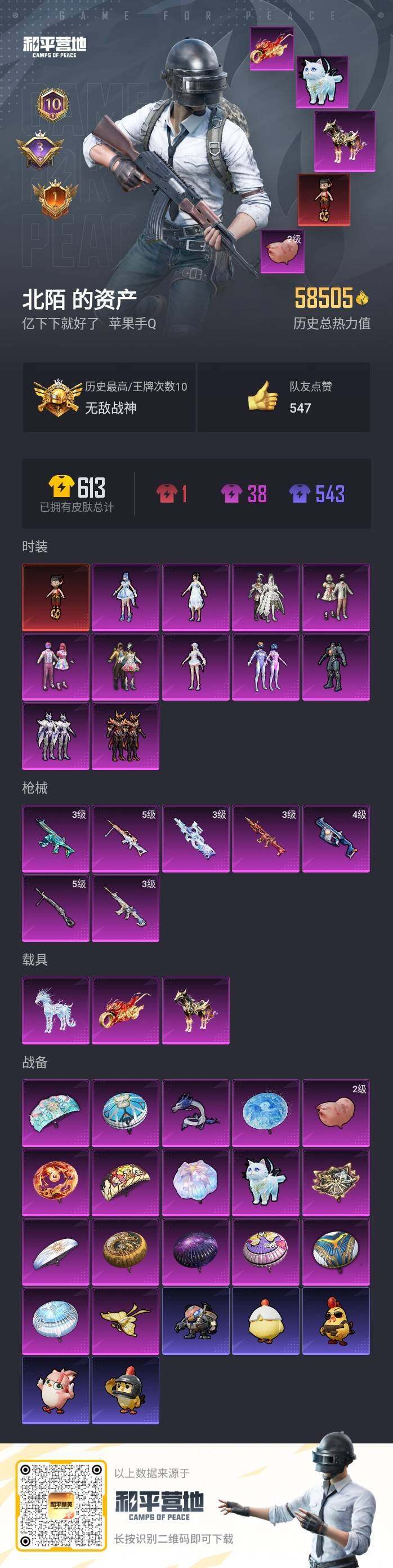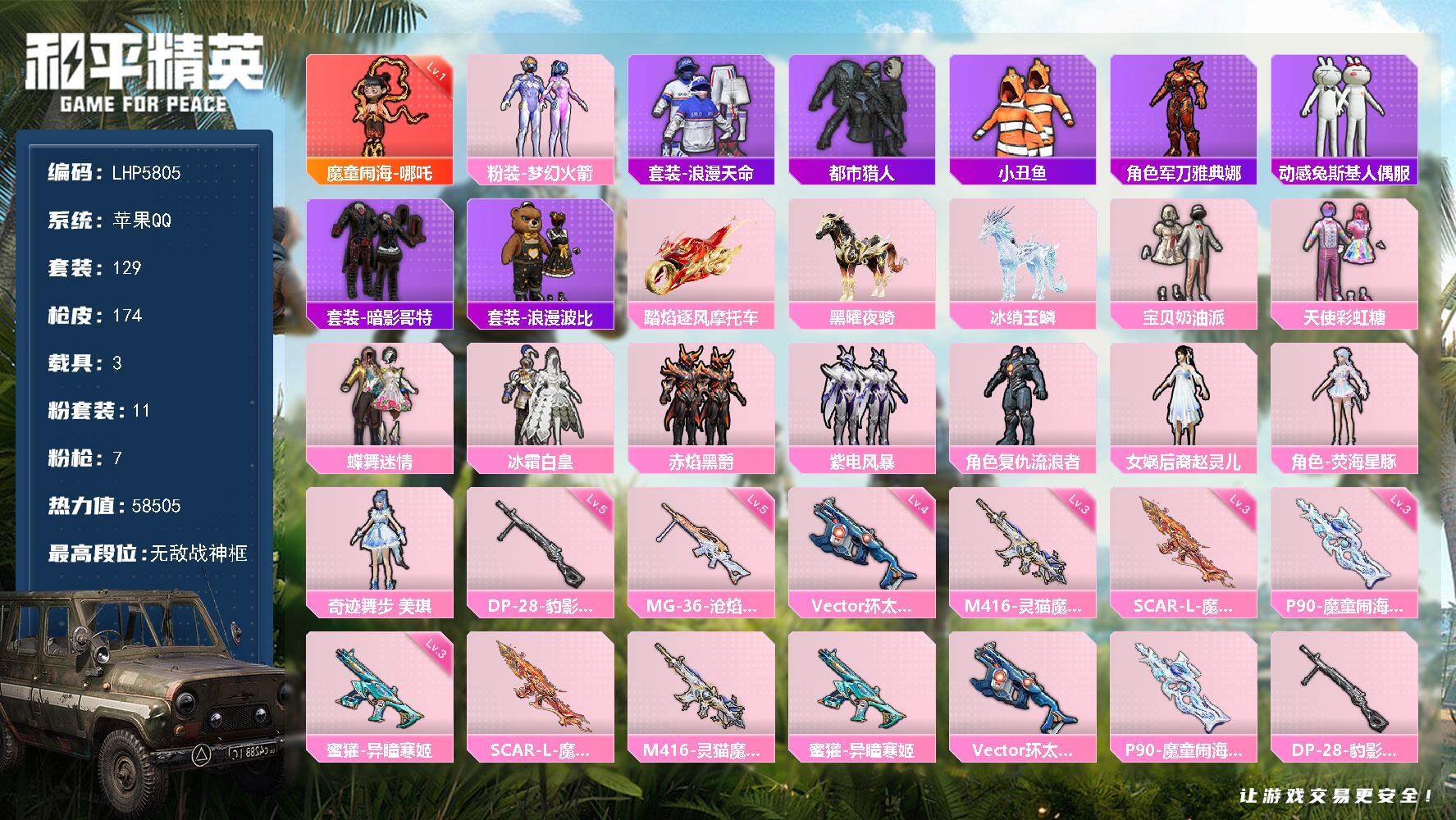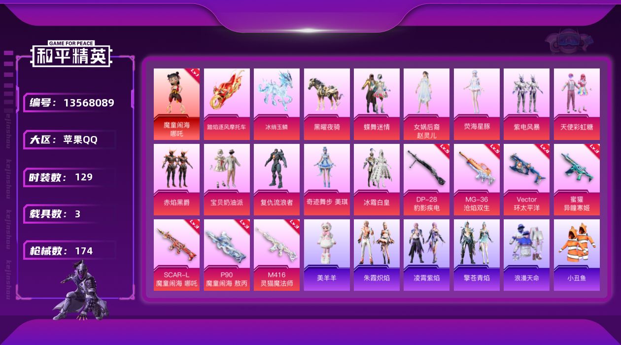 [13568089]【店主推荐捡漏号!可直接换绑】背包2200红碎片 素材身法号/无敌战神框1/苹果 手Q-无敌战神框-1神装-11粉装-7特效枪-3载具-4粉色飞行器-5.8w热力值-10王牌印记-129套装-174枪皮【红色神装等级】:魔童闹海-哪吒(一级)【热门品类】:粉装-梦幻火箭,套装-浪漫天命,套装-都市猎人,套装-小丑鱼,角色-军刀雅典娜,套装-动感兔斯基人偶服,套装-暗影哥特,套装-浪漫波比【粉色载具】:踏焰逐风摩托车,黑曜夜骑,冰绡玉鳞【粉色套装】:粉装-宝贝奶油派,粉装-天使彩虹糖,粉装-蝶舞迷情,粉装-梦幻火箭,粉装-冰霜白皇,粉装-赤焰黑爵,粉装-紫电风暴,角色-复仇流浪者,女娲后裔-赵灵儿,角色-荧海星豚,角色-奇迹舞步 美琪【粉色枪皮等级】:SCAR-L-魔童闹海 哪吒(三级),M416-灵猫魔法师(三级),蜜獾-异瞳寒姬(三级),Vector-环太平洋(四级),P90-魔童闹海 敖丙(三级),DP-28-豹影疾电(五级),MG-36-沧焰双生(五级)【粉色飞行器】:庄周梦蝶飞行器,灵猫魔法师飞行器,飞天猪飞行器,灵珠游龙飞行器