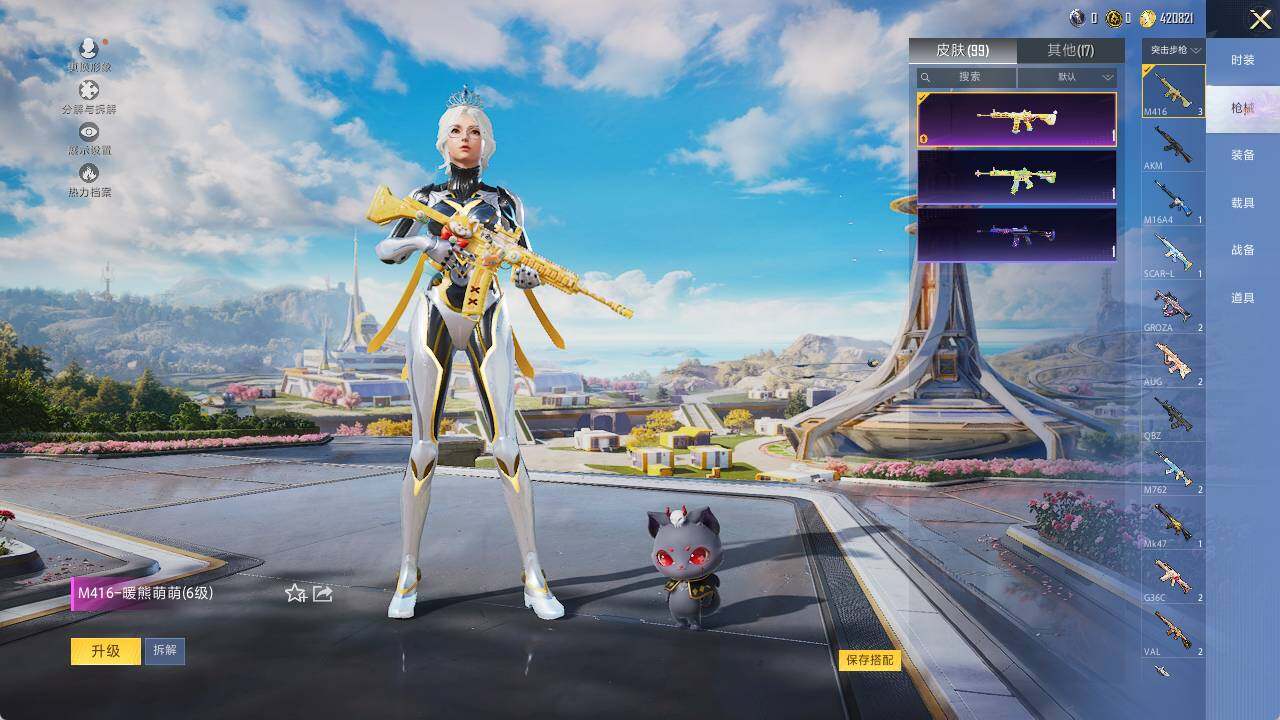 M416-暖熊萌萌,GROZA-镜光银凌,AUG-暖羊咩咩,UMP45-雪国精灵,Kar98K-巳巳如意,破片手榴弹-热量炸弹