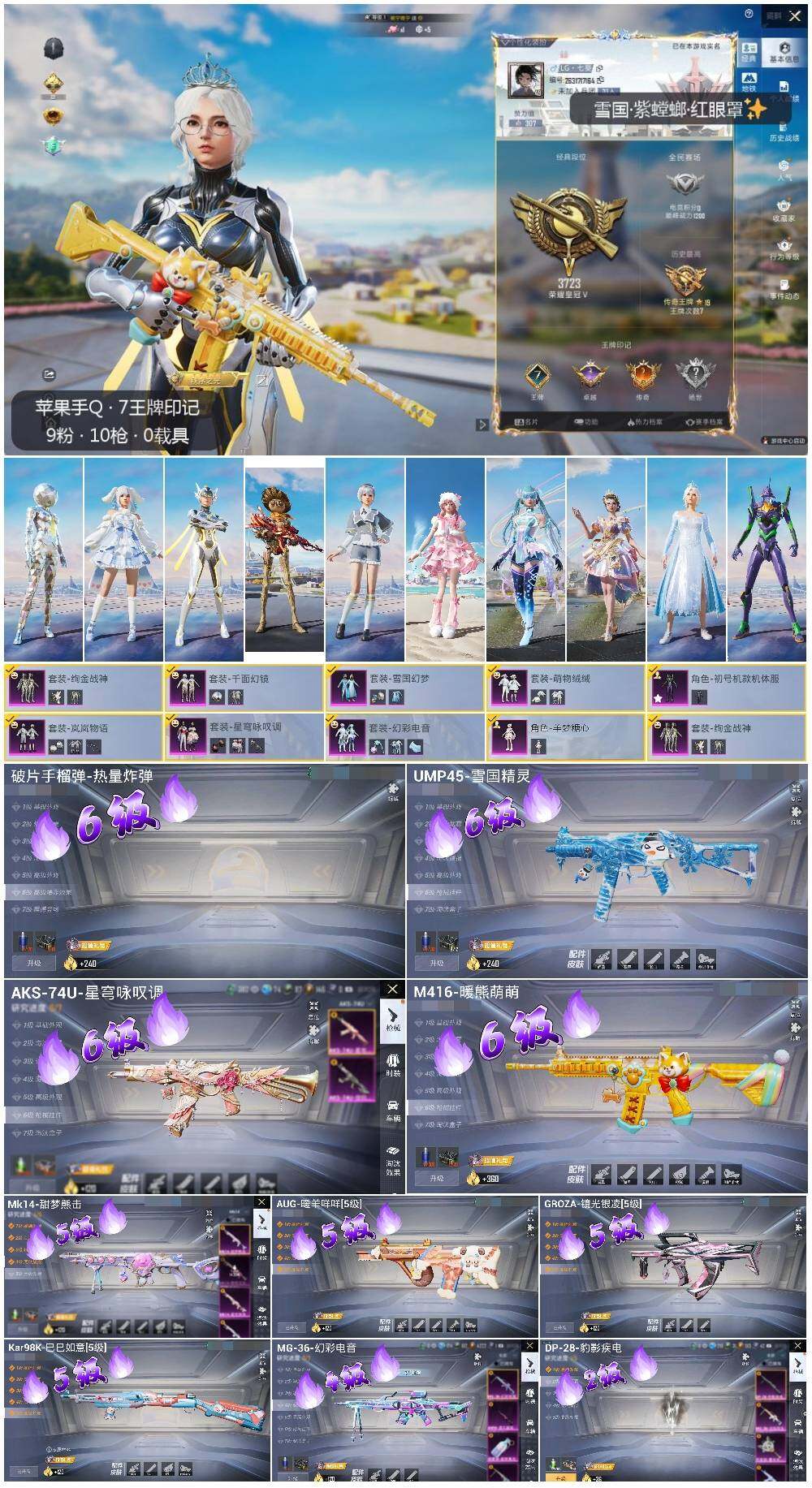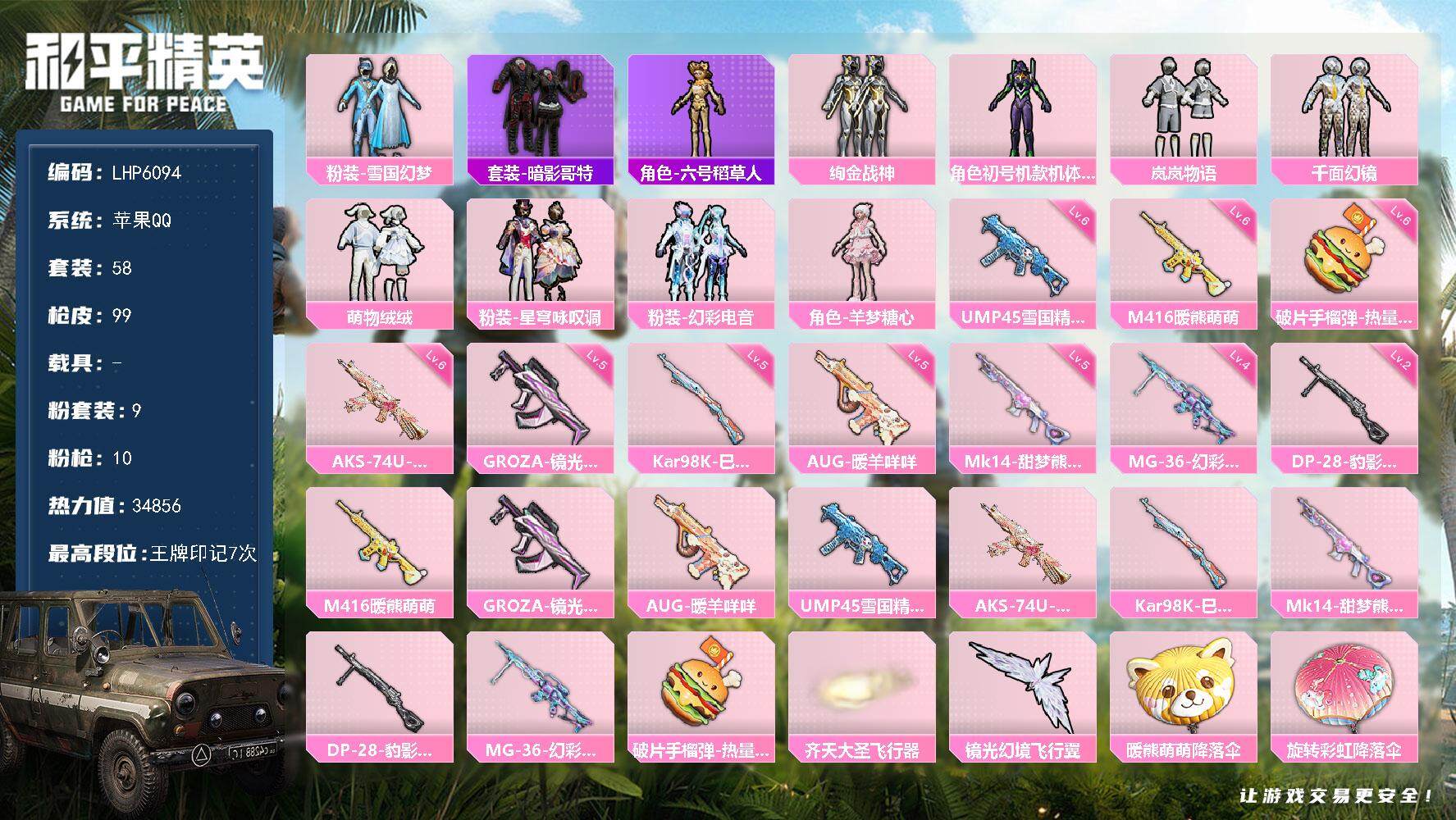 [13659475]【店主推荐捡漏号!可直接换绑】/素材身法号 苹果 手Q-9粉装-10特效枪-2粉色飞行器-3.4w热力值-7王牌印记-58套装-99枪皮【热门品类】:粉装-雪国幻梦,套装-暗影哥特,角色-六号稻草人【粉色套装】:粉装-雪国幻梦,粉装-绚金战神,角色-初号机款机体服,粉装-岚岚物语,粉装-千面幻镜,粉装-萌物绒绒,粉装-星穹咏叹调,粉装-幻彩电音,角色-羊梦糖心【粉色枪皮等级】:M416-暖熊萌萌(六级),GROZA-镜光银凌(五级),AUG-暖羊咩咩(五级),UMP45-雪国精灵(六级),AKS-74U-星穹咏叹调(六级),Kar98K-巳巳如意(五级),Mk14-甜梦熊击(五级),DP-28-豹影疾电(二级),MG-36-幻彩电音(四级),破片手榴弹-热量炸弹(六级)【粉色飞行器】:齐天大圣飞行器,镜光幻境飞行翼