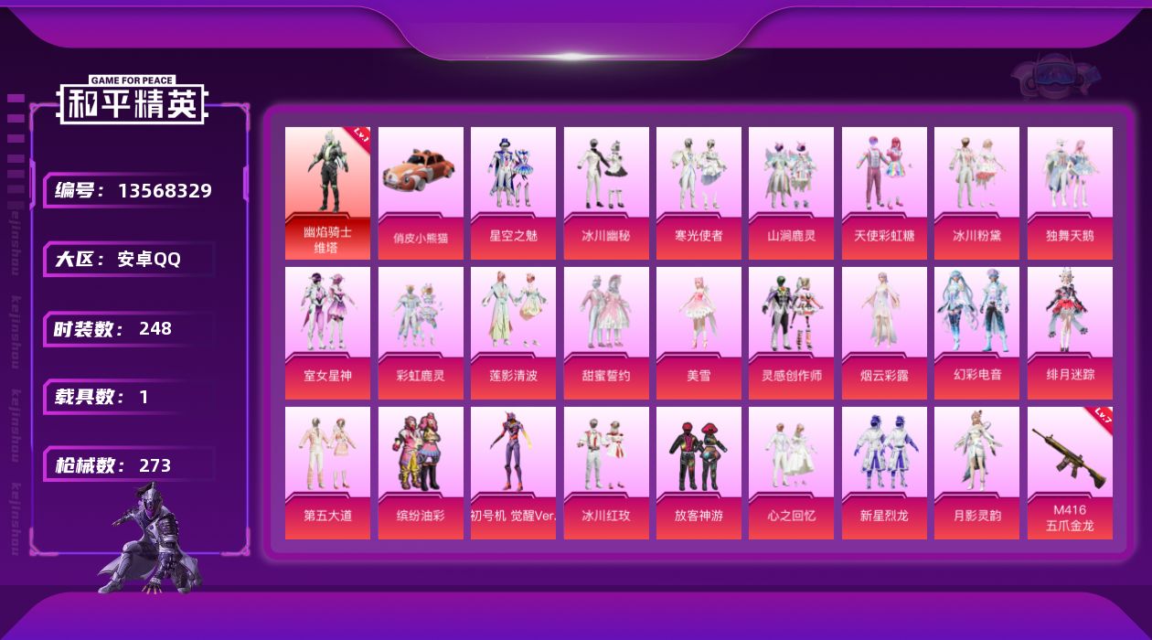 [13568329]【暑期末清货/特价急出/永久包赔】:安卓 手Q-1红装-25粉装-10特效枪-1载具-10.8w热力值-15印记-248套装-273枪皮【热门品类】:套装-派对舞王,套装-胖达圆圆【角色神装等级】:幽焰骑士-维塔(一级)【稀有载具】:俏皮小熊猫【特效枪等级】:SCAR-L-锦绣绵绵(五级),M416-五爪金龙(七级),M416-墨龙九天(三级),UMP45-量子极限(五级),汤姆逊-冰川粉黛(六级),Kar98K-巳巳如意(五级),Mk14-精灵梦叶罗丽(六级),SPAS-12-蜜语绒猫(四级),MG3-洛神天依(五级),烟雾弹-丁香清露(五级)【优质套装】:粉装-独舞天鹅,粉装-天使彩虹糖,粉装-梦幻火箭,粉装-缤纷油彩,粉装-放客神游,粉装-新星烈龙,粉装-甜蜜誓约,粉装-星空之魅,粉装-彩虹鹿灵,粉装-山涧鹿灵,粉装-灵感创作师,粉装-冰川粉黛,粉装-冰川幽秘,粉装-冰川红玫,粉装-寒光使者,粉装-第五大道,粉装-心之回忆,粉装-室女星神,粉装-莲影清波,角色-烟云彩露,角色-美雪,角色-初号机 觉醒Ver.,角色-月影灵韵,粉装-幻彩电音,角色-绯月迷踪【优质飞行器】:镜域双华-灵镜之阶,龙翔九天飞行器,雀灵庇佑飞行器,幻星舰长飞行器