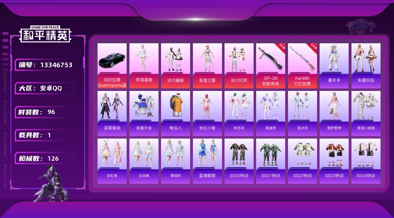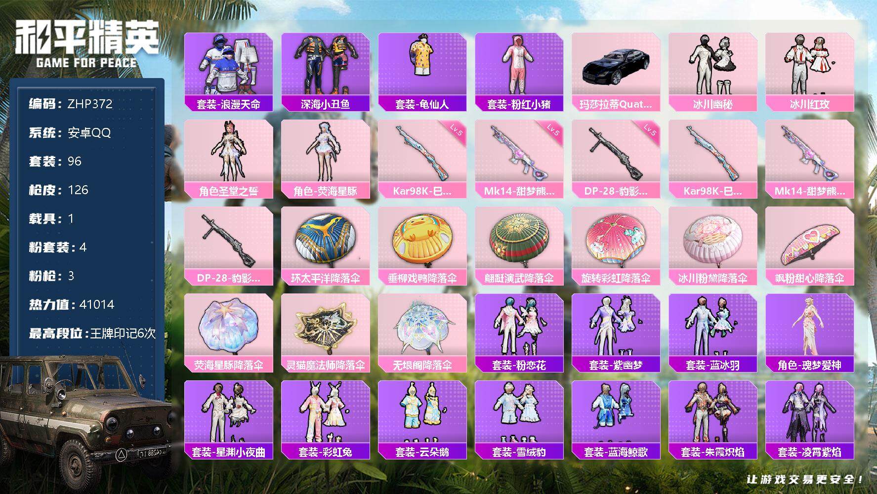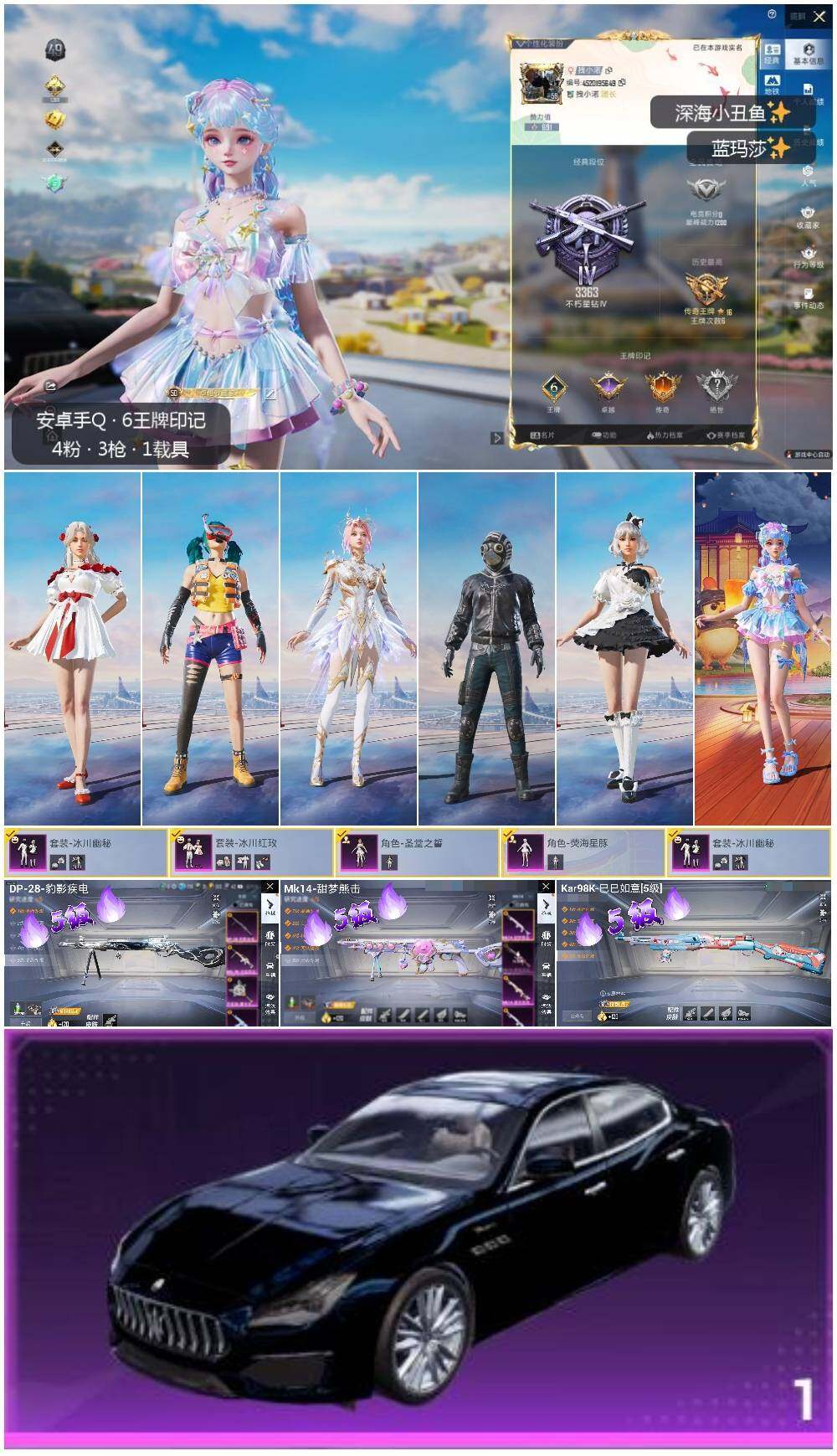 [13346753]【店主推荐捡漏号!可直接换绑】 安卓 手Q-4粉装-3特效枪-1载具-4.1w热力值-6王牌印记-96套装-126枪皮【热门品类】:套装-浪漫天命,套装-深海小丑鱼,套装-龟仙人,套装-粉红小猪【粉色载具】:玛莎拉蒂Quattroporte(夜幕蓝)【粉色套装】:粉装-冰川幽秘,粉装-冰川红玫,角色-圣堂之誓,角色-荧海星豚【粉色枪皮等级】:Kar98K-巳巳如意(五级),Mk14-甜梦熊击(五级),DP-28-豹影疾电(五级)