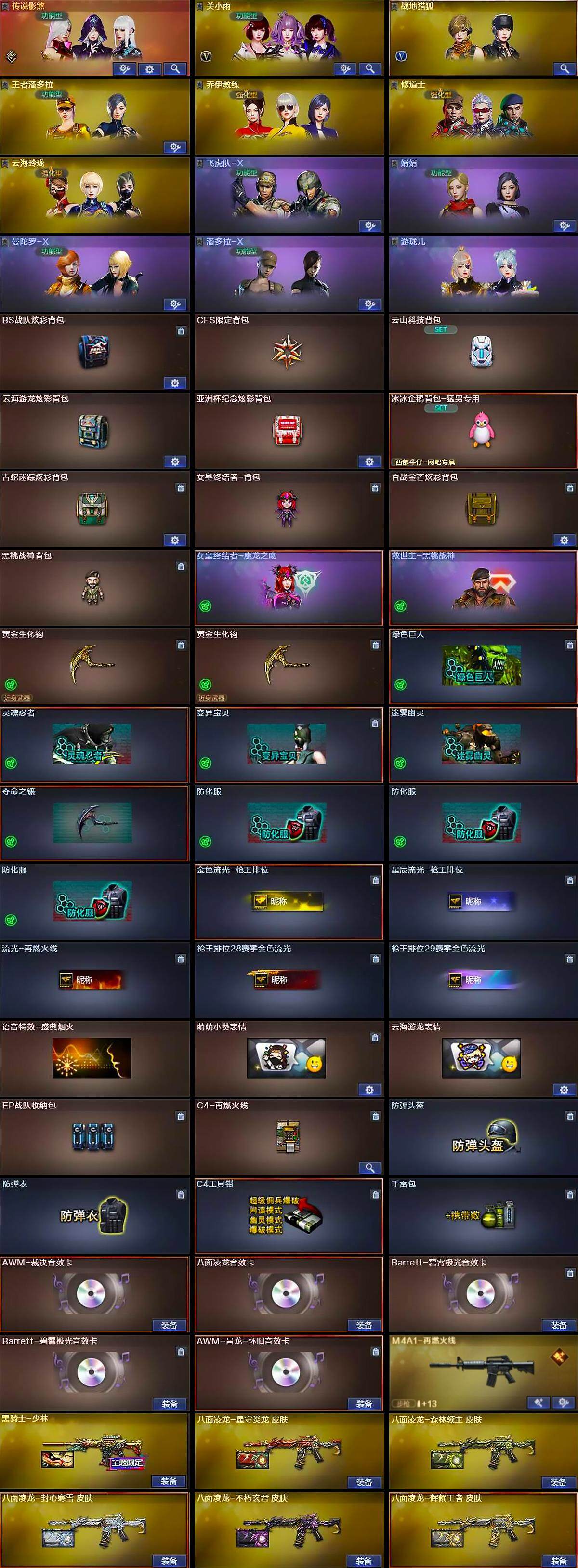 【道具】:BS战队炫彩背包,CFS限定背包,云山科技背包,云海游龙炫彩背包,亚洲杯纪念炫彩背包,冰冰企鹅背包-猛男专用,古蛇迷踪炫彩背包,女皇终结者-背包,百战金芒炫彩背包,黑桃战神背包,女皇终结者-魔龙之吻,救世主-黑桃战神,黄金生化钩*2,绿色巨人,灵魂忍者,变异宝贝,迷雾幽灵,夺命之镰,防化服*3,金色流光-枪王排位,星辰流光-枪王排位,流光-再燃火线,枪王排位28赛季金色流光,枪王排位29赛季金色流光,语音特效-盛典烟火,萌萌小葵表情,云海游龙表情,EP战队收纳包,C4-再燃火线,防