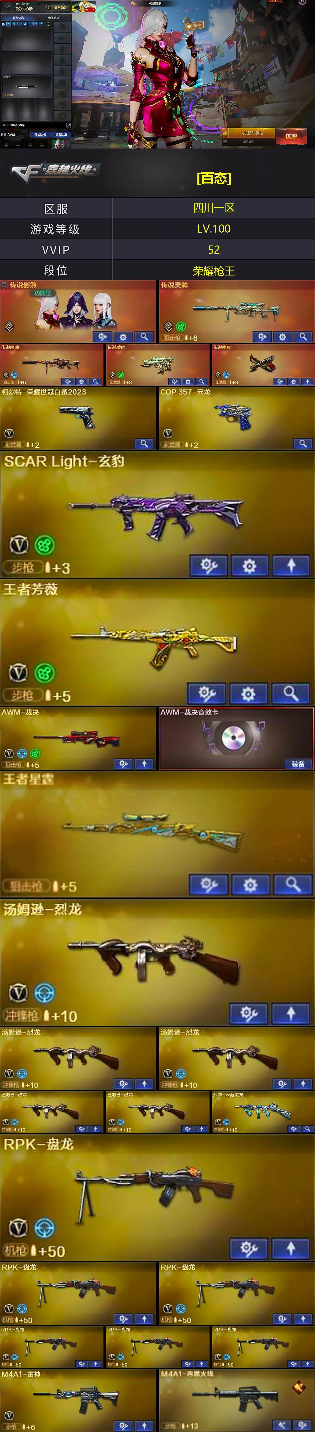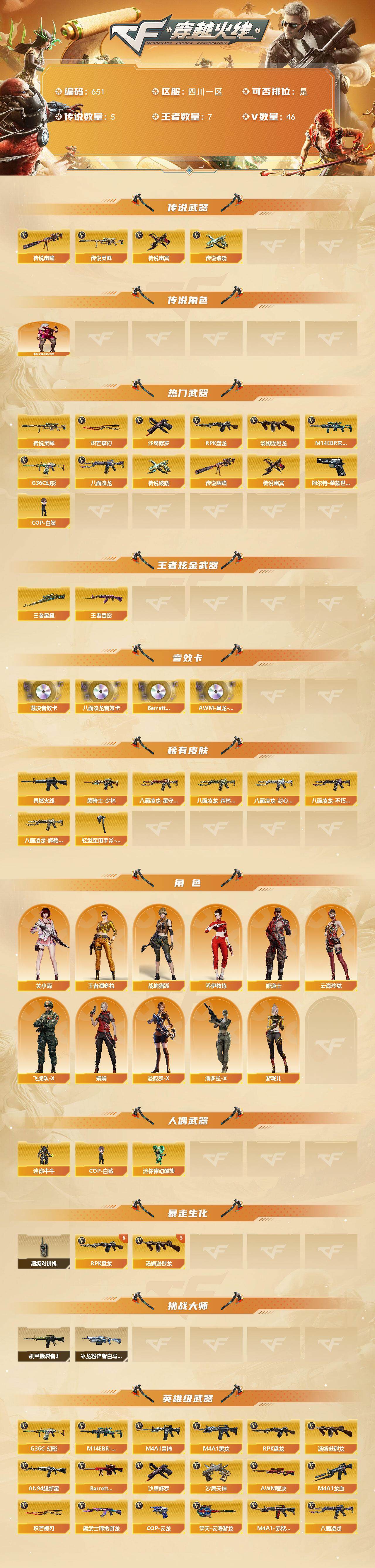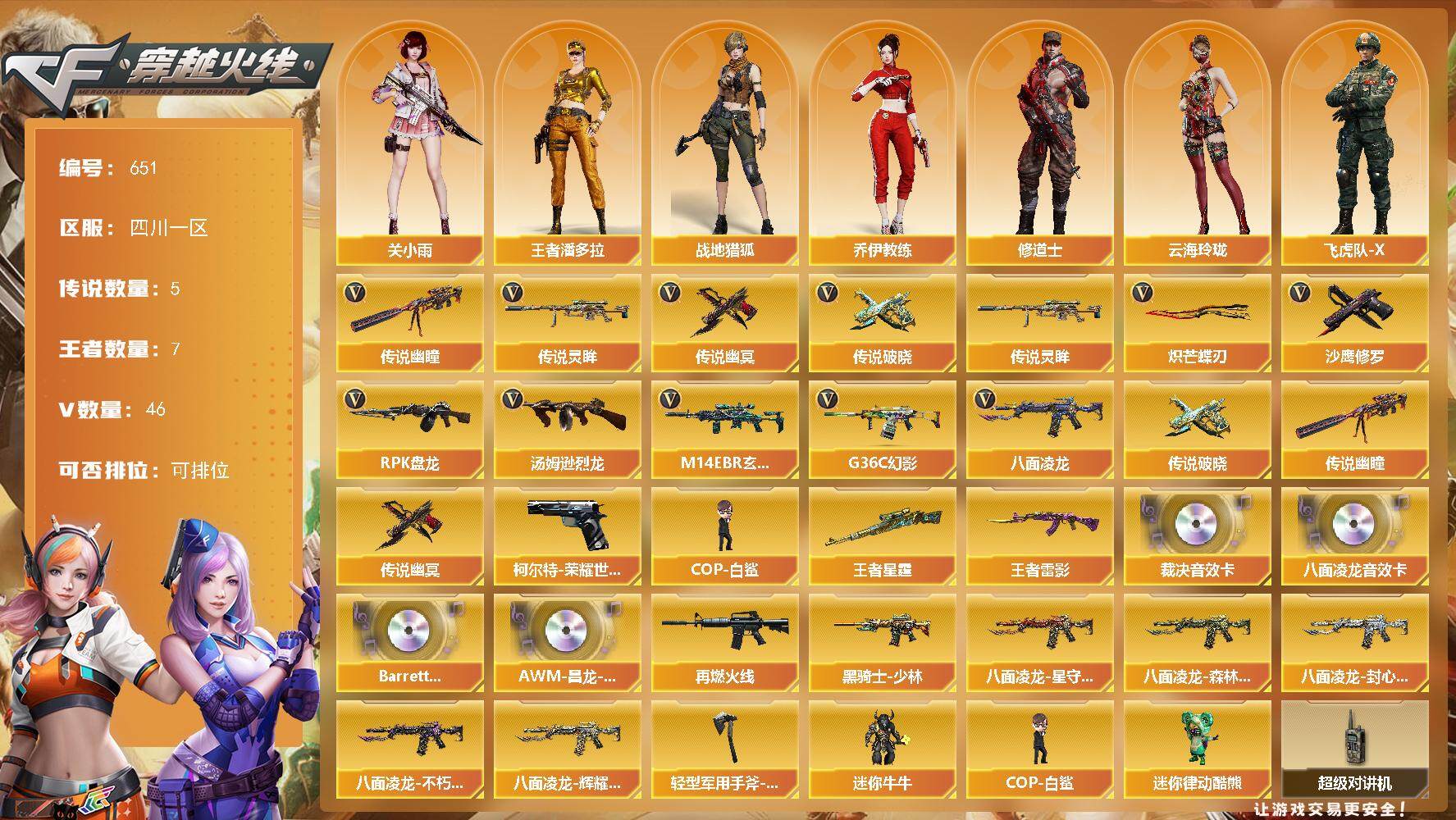 [13677885]四川一区-46V-7王者-0炫金 【传说武器】:传说灵眸,传说幽瞳,传说破晓,传说幽冥 【传说角色】:传说影煞 【热门武器】:传说幽瞳,传说灵眸,传说破晓,传说幽冥,G36C-幻影,M14EBR-玄武,柯尔特-荣耀世冠白鲨2023,八面凌龙,汤姆逊-烈龙*5,RPK-盘龙*6,COP-白鲨,沙鹰-修罗*4,炽芒蝶刃 【王者炫金武器】:王者雷影,王者星霆 【音效卡】:AWM-裁决音效卡,八面凌龙音效卡,Barrett-碧霄极光音效卡*2,AWM-昌龙-怀旧音效卡 【皮肤】:M4A1-再燃火线,黑骑士-少林,八面凌龙-星守炎龙 皮肤,八面凌龙-森林领主 皮肤,八面凌龙-封心寒雪 皮肤,八面凌龙-不朽玄君 皮肤,八面凌龙-辉耀王者 皮肤,轻型军用手斧-再燃火线 【角色】:关小雨,战地猎狐,王者潘多拉,乔伊教练,修道士,云海玲珑,飞虎队-X,娟娟,曼陀罗-X,潘多拉-X,游珑儿 【人偶武器】:COP-白鲨,迷你律动酷熊,迷你牛牛*2 【暴走生化】:超级对讲机 【挑战大师】:冰龙粉碎者-白马银枪,机甲撕裂者III 【英雄级武器】:M4A1-黑龙,M4A1-雷神,AN94-超新星,M4A1-龙血,M14EBR-玄武,G36C-幻影,黑武士-锦绣游龙,八面凌龙,SCAR Light-玄豹,王者之势-觉醒版,王者芳薇-觉醒版,Barrett-极光,AWM-裁决,RPK-盘龙*6,炼狱-悦蓝-觉醒版,汤姆逊-烈龙*5,烈龙-云海游龙,沙鹰-修罗*4,沙鹰-天神,柯尔特-荣耀世冠白鲨2023,COP 357-云龙,王者之魂-觉醒版,炽芒蝶刃,擎天-云海游龙,麒麟刺-百战金芒,丛林匕首-玄豹,高爆手雷-幻灵,高爆手雷-云龙*2,手雷-云海游龙,高爆手雷-玄豹,M4A1-赤狱骑士,M4A1-苍鸣雷神 【道具】:BS战队炫彩背包,CFS限定背包,云山科技背包,云海游龙炫彩背包,亚洲杯纪念炫彩背包,冰冰企鹅背包-猛男专用,古蛇迷踪炫彩背包,女皇终结者-背包,百战金芒炫彩背包,黑桃战神背包,女皇终结者-魔龙之吻,救世主-黑桃战神,黄金生化钩*2,绿色巨人,灵魂忍者,变异宝贝,迷雾幽灵,夺命之镰,防化服*3,金色流光-枪王排位,星辰流光-枪王排位,流光-再燃火线,枪王排位28赛季金色流光,枪王排位29赛季金色流光,语音特效-盛典烟火,萌萌小葵表情,云海游龙表情,EP战队收纳包,C4-再燃火线,防