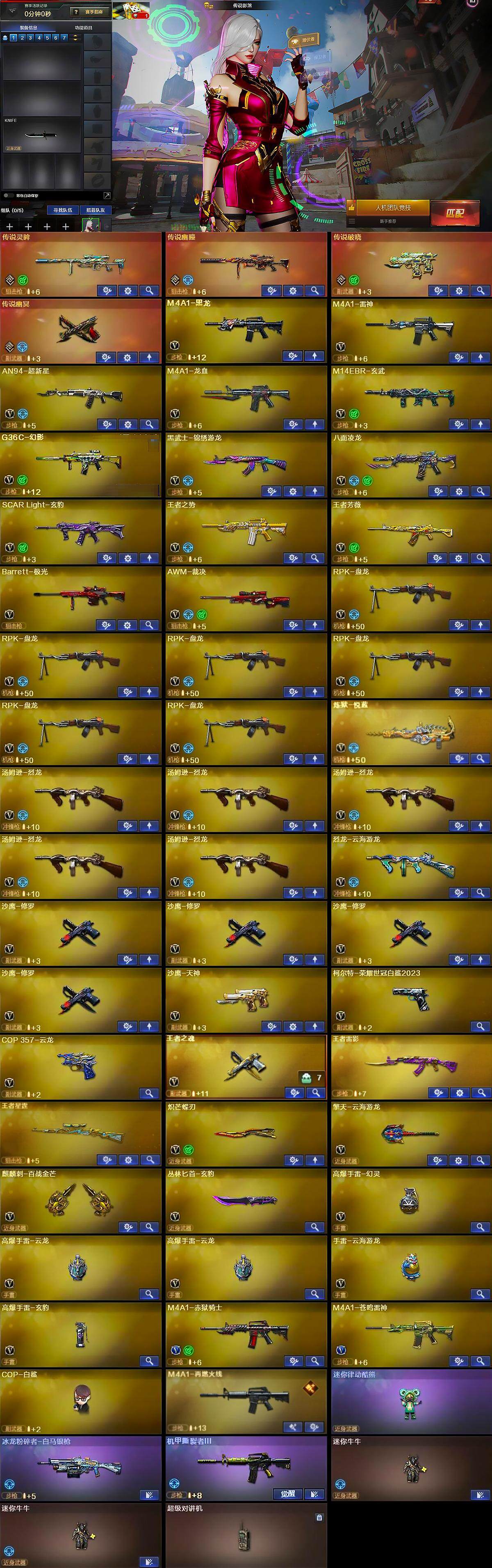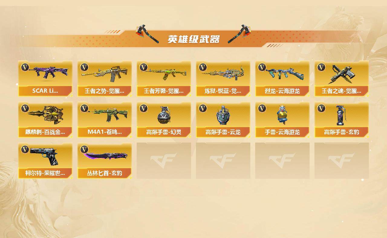 【英雄级武器】:M4A1-黑龙,M4A1-雷神,AN94-超新星,M4A1-龙血,M14EBR-玄武,G36C-幻影,黑武士-锦绣游龙,八面凌龙,SCAR Light-玄豹,王者之势-觉醒版,王者芳薇-觉醒版,Barrett-极光,AWM-裁决,RPK-盘龙*6,炼狱-悦蓝-觉醒版,汤姆逊-烈龙*5,烈龙-云海游龙,沙鹰-修罗*4,沙鹰-天神,柯尔特-荣耀世冠白鲨2023,COP 357-云龙,王者之魂-觉醒版,炽芒蝶刃,擎天-云海游龙,麒麟刺-百战金芒,丛林匕首-玄豹,高爆手雷-幻灵,高爆手雷-云龙*2,手雷-云海游龙,高爆手雷-玄豹,M4A1-赤狱骑士,M4A1-苍鸣雷神