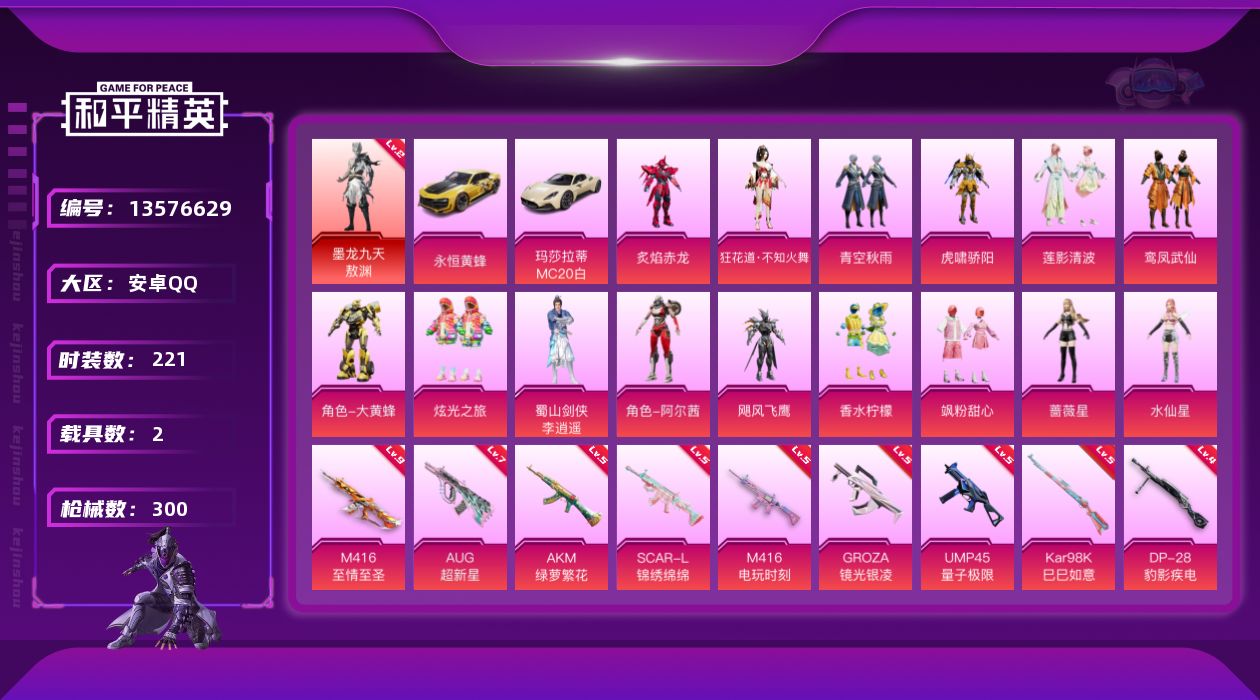 - PX_2100819-??/枪械25/装备488/载具1/战备271/王牌印记18/热力值131440/一级AKM-梦之光华/五级AKM-幻海仙踪/五级SCAR-L-纯梦嫁纱/六级M416-风花雪月/四级M416-全功率超战/三级M416-女娲灵识/五级GROZA-镜光银凌/五级AUG-暖羊咩咩/四级AUG-圣斗士星矢/五级M762-甜蜜誓约/四级蜜獾-荧海星豚/四级UMP45-雪国精灵/六级Ve