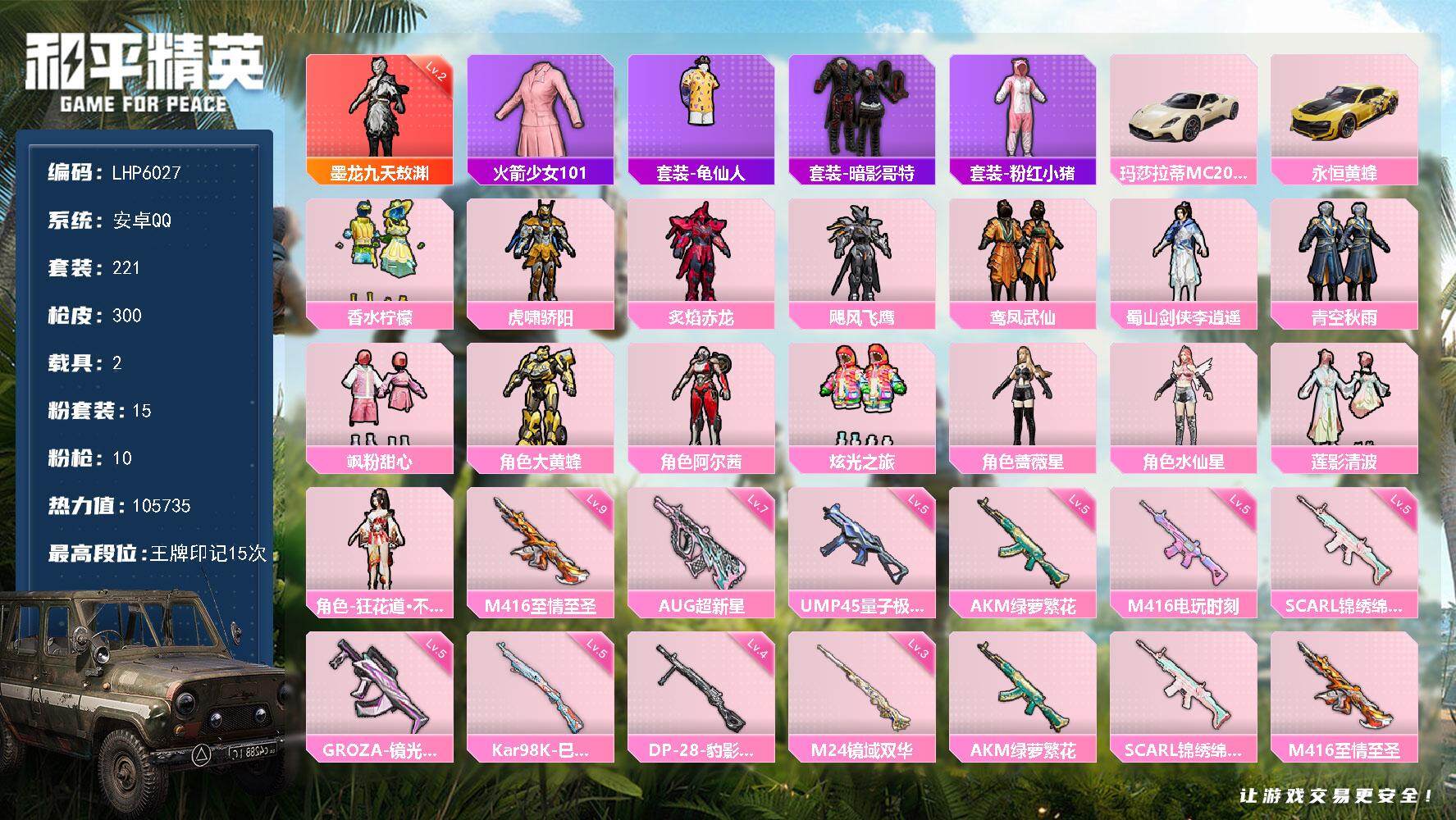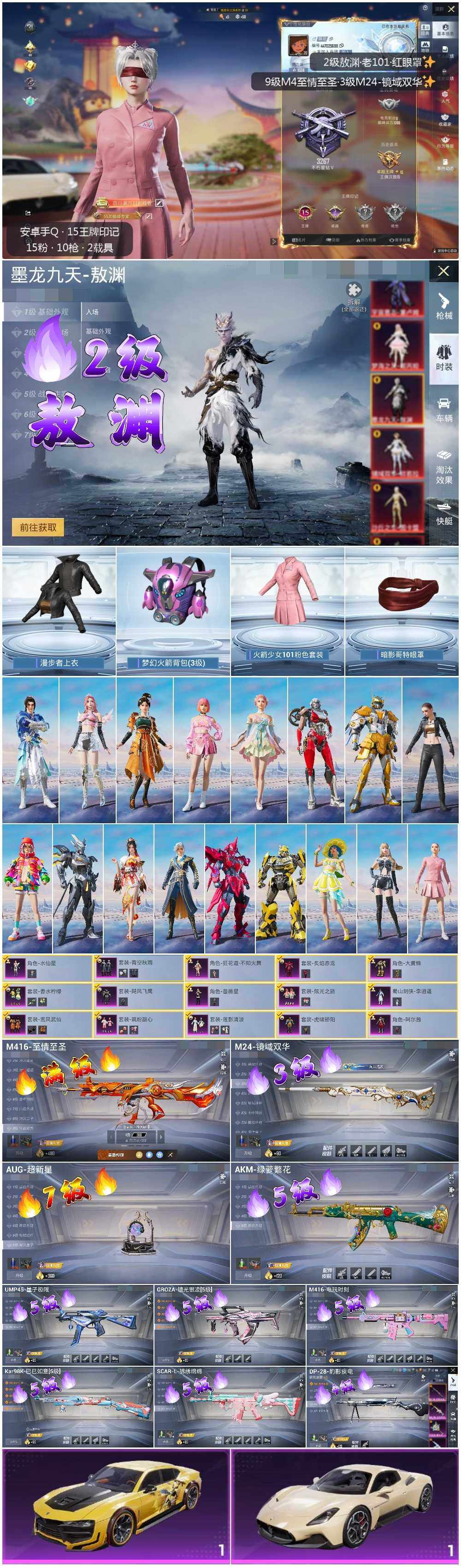 [13576629]可二次【店主推荐捡漏号!可直接换绑】/素材身法号/老101/扭蛋碎片696/M416-至情至圣(九级) 安卓 手Q-1神装-15粉装-10特效枪-2载具-11粉色飞行器-10.5w热力值-15王牌印记-221套装-300枪皮【红色神装等级】:墨龙九天-敖渊(二级)【热门品类】:套装-火箭少女101,套装-龟仙人,套装-暗影哥特,套装-粉红小猪【粉色载具】:玛莎拉蒂MC20(星石白),永恒黄蜂【粉色套装】:粉装-香水柠檬,粉装-虎啸骄阳,粉装-炙焰赤龙,粉装-飓风飞鹰,粉装-鸾凤武仙,蜀山剑侠-李逍遥,粉装-青空秋雨,粉装-飒粉甜心,角色-大黄蜂,角色-阿尔茜,粉装-炫光之旅,角色-蔷薇星,角色-水仙星,粉装-莲影清波,角色-狂花道·不知火舞【粉色枪皮等级】:AKM-绿萝繁花(五级),SCAR-L-锦绣绵绵(五级),M416-至情至圣(九级),M416-电玩时刻(五级),GROZA-镜光银凌(五级),AUG-超新星(七级),UMP45-量子极限(五级),Kar98K-巳巳如意(五级),M24-镜域双华(三级),DP-28-豹影疾电(四级)【粉色飞行器】:酣梦熊熊飞行器,庄周梦蝶飞行器,变形金刚飞行器,萌物绒绒飞行器,沙丘之主天马,繁龙极客飞行器,镜域双华-灵镜之阶,龙翔九天飞行器,冠军兔兔飞行器,万象金身飞行器