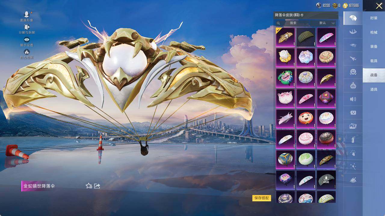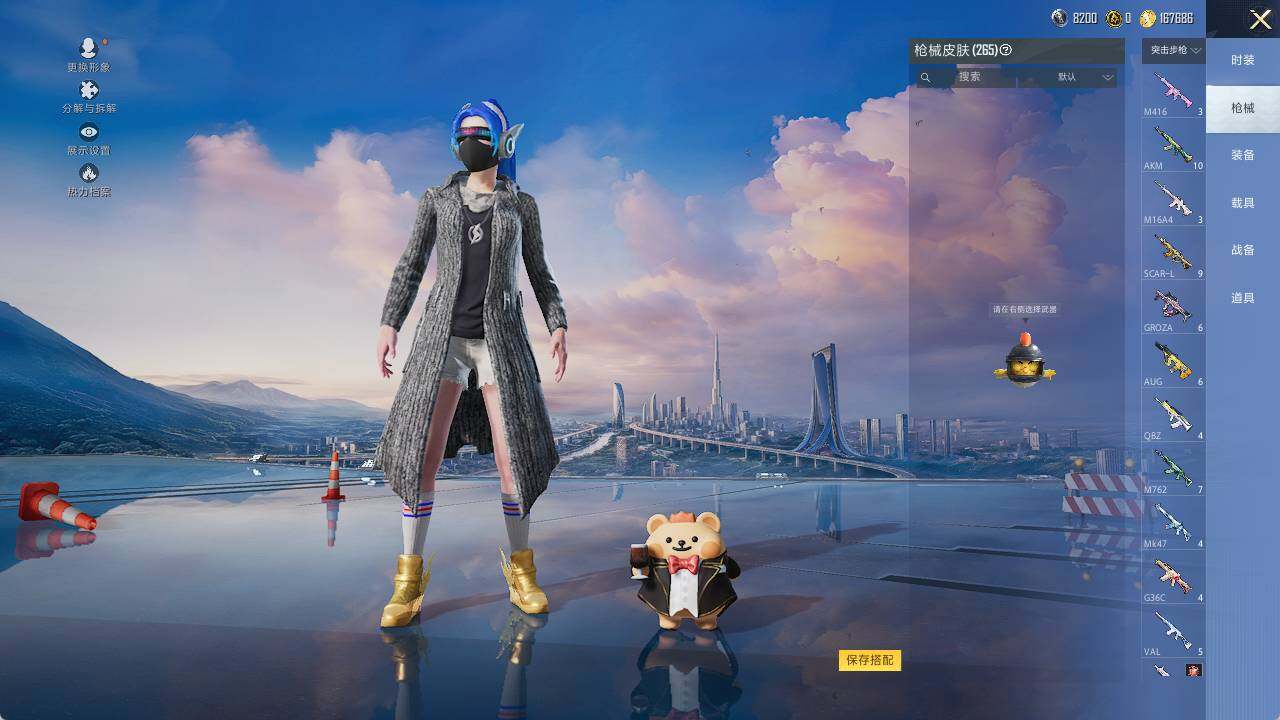 AKM-绿萝繁花,SCAR-L-金蛇镇世,M416-电玩时刻,GROZA-镜光银凌,AUG-暖羊咩咩,M762-青锋波束,UMP45-量子极限,Kar98K-巳巳如意,SKS-碧影闪光