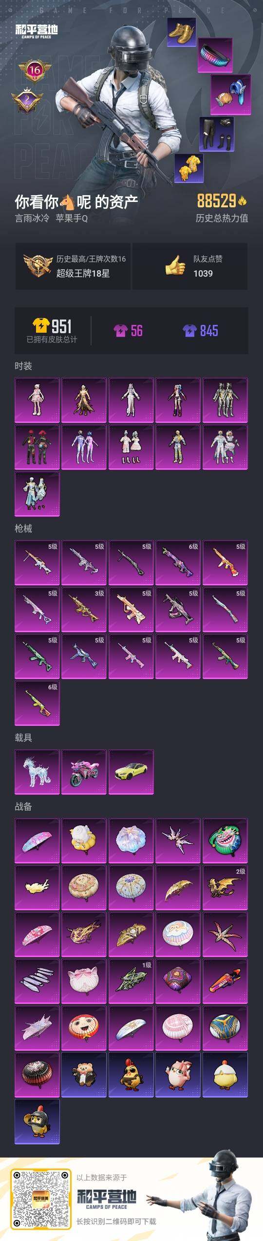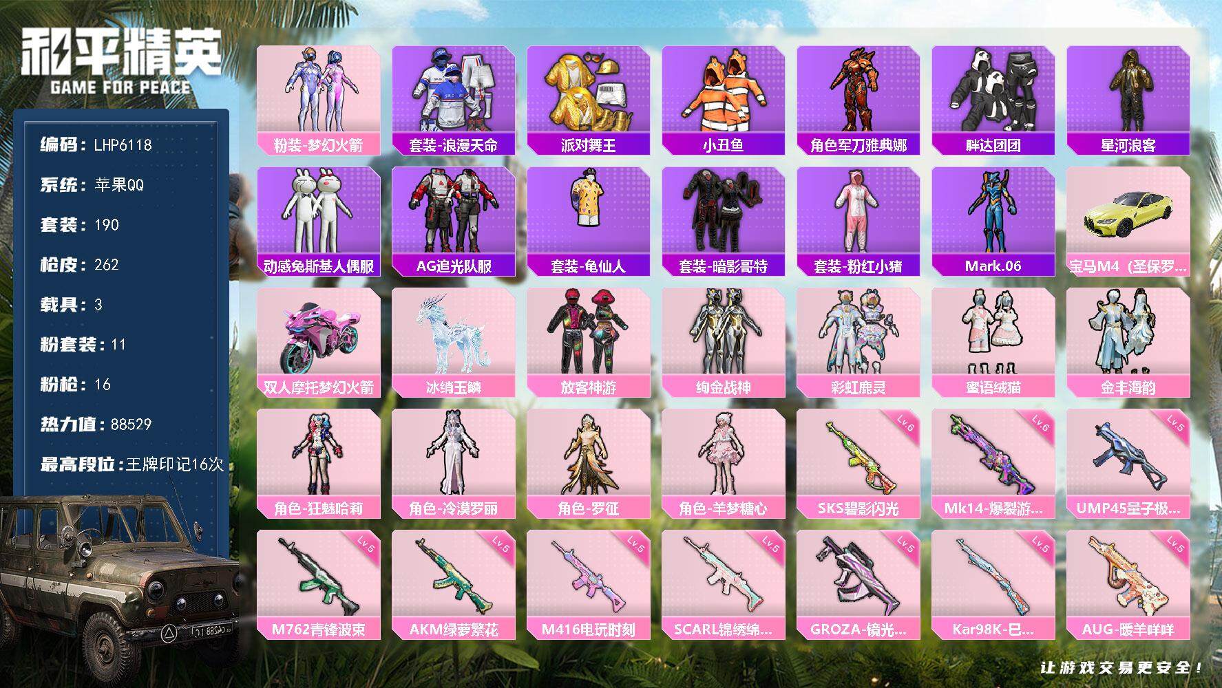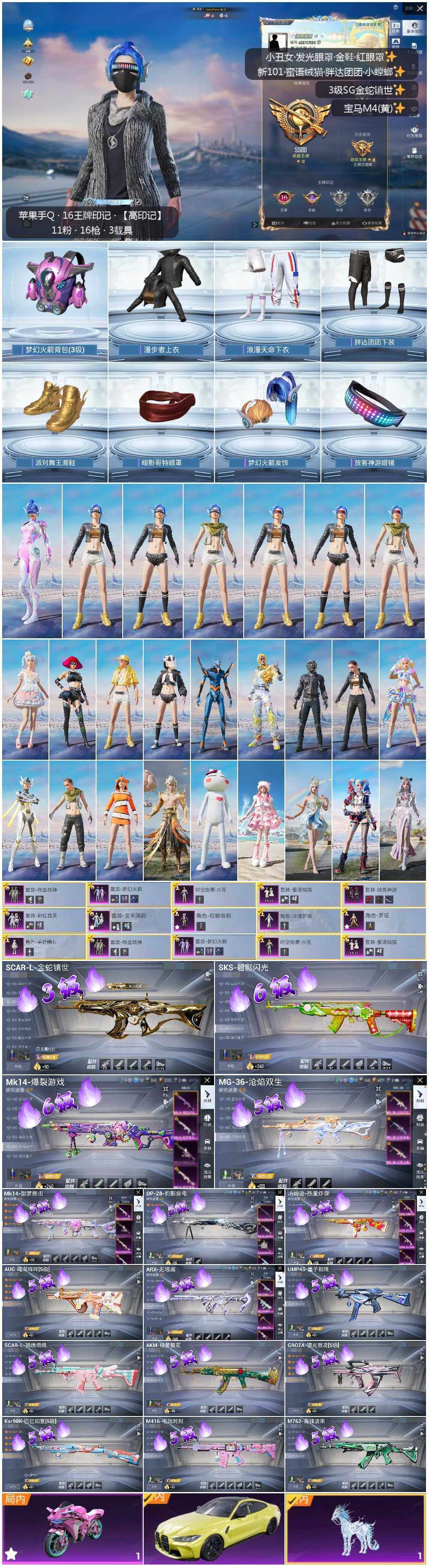 - [12624045]素材身法号 苹果 微信-8粉装-8特效枪-3载具-5粉色飞行器-4.7w热力值-6王牌印记-105套装-137枪皮【热门品类】:粉装-繁龙极客,套装-浪漫天命,套装-赤蝎幽灵,套装-都市猎人,套装-派对舞王,套装-小丑鱼,套装-胖达团团,套装-动感兔斯基人偶服,套装-暗影哥特,套装-糯粉咩咩,套装-红熊茄茄【粉色载具】:宝马M4(圣保罗黄),黑曜夜骑,辉羽雀灵自行车【粉色套装】:粉装-甜心巧克力,粉装-天使彩虹糖,粉装-放客神游,粉装-彗云及圣,粉装-新星烈龙,粉装-繁龙极客,角色-冷漠罗丽,角色-荧海星豚【粉色枪皮等级】:M416-风花雪月(五级),GROZA-圣辉之星(七级),AUG-暖羊咩咩(五级),AUG-圣斗士星矢(七级),蜜獾-荧海星豚(六级),Kar98K-巳巳如意(五级),DP-28-豹影疾电(五级),MG3-辉羽雀灵(三级)【粉色飞行器】:齐天大圣飞行器,龙翔九天飞行器,万象金身飞行器,终晖之翼飞行器