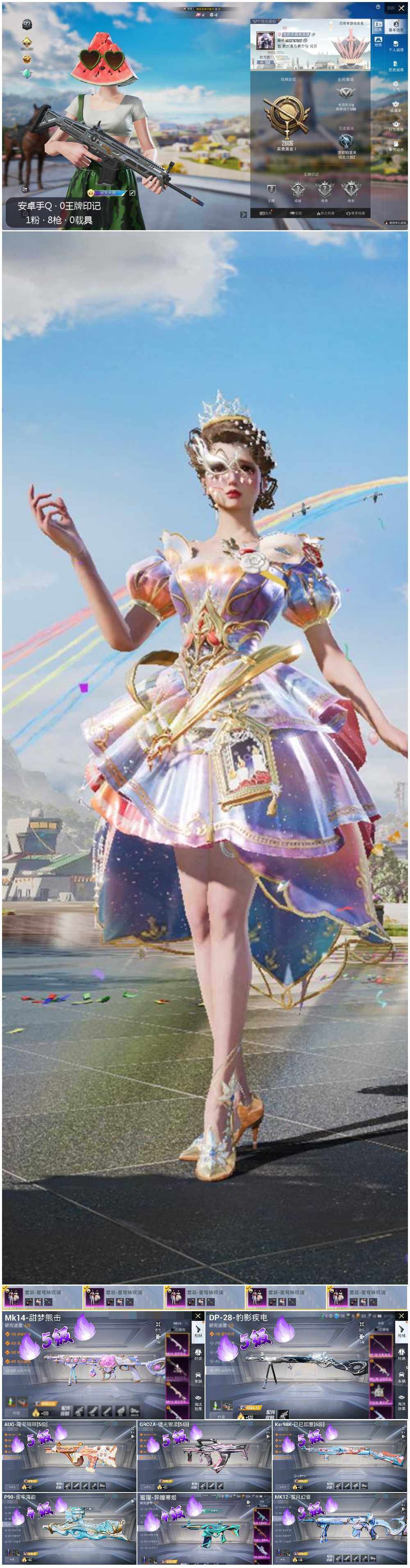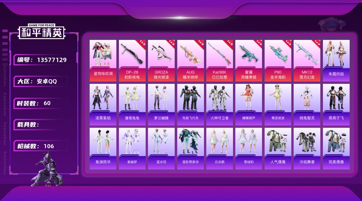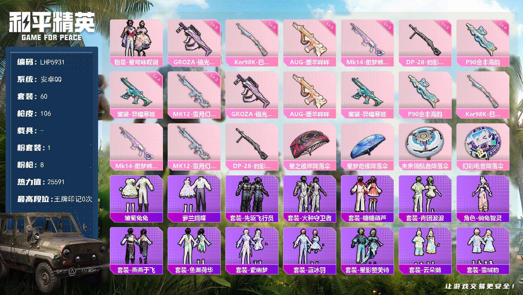 [13577129]可二次【店主推荐捡漏号!可直接换绑】/地铁满天赋 安卓 手Q-1粉装-8特效枪-2.5w热力值-60套装-106枪皮【粉色套装】:粉装-星穹咏叹调【粉色枪皮等级】:GROZA-镜光银凌(五级),AUG-暖羊咩咩(五级),蜜獾-异瞳寒姬(四级),P90-金丰海韵(四级),Kar98K-巳巳如意(五级),Mk14-甜梦熊击(五级),MK12-雪月幻音(三级),DP-28-豹影疾电(五级)