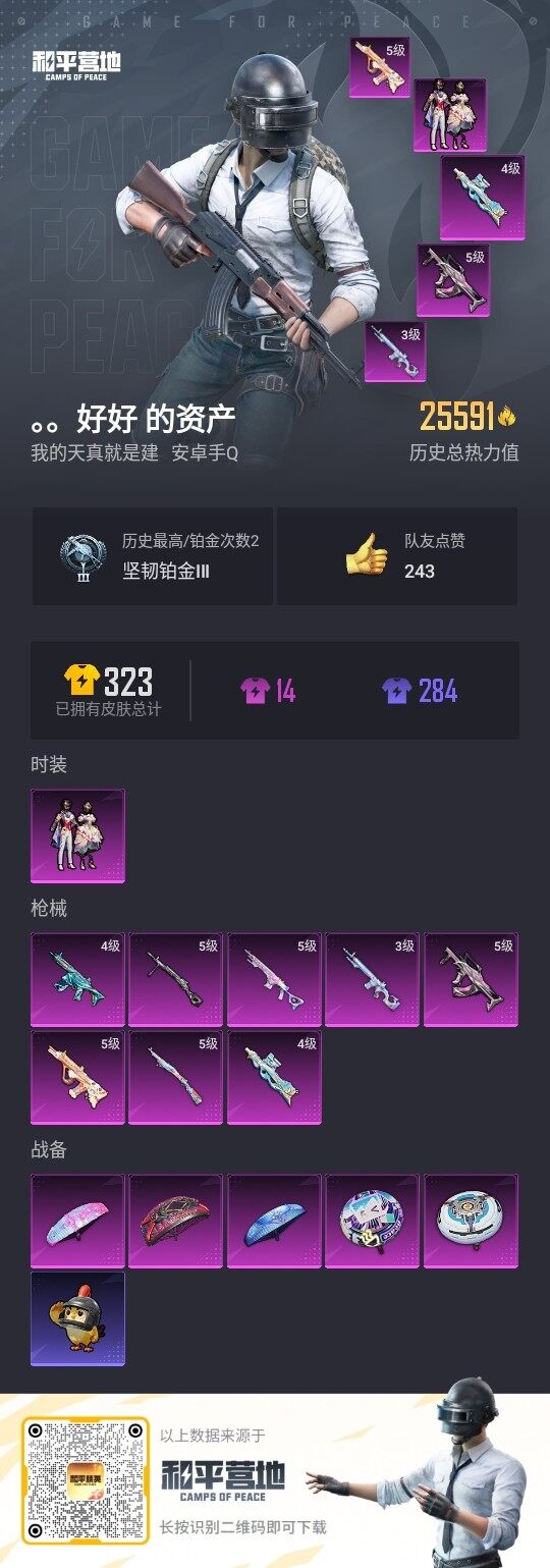 - [12349760]【商品标题】:安卓 手Q-25粉装-8特效枪-2载具-9粉色飞行器-126685热力值-22王牌印记-305套装-359枪皮 【热门品类】:套装-龟仙人,套装-潮萌小黄鸭,套装-浪漫波比,套装-粉红小猪 【粉色载具】:路特斯EVIJA(星际黄),黑曜夜骑 【粉色套装】:粉装-天使彩虹糖,粉装-狩月元帅,粉装-极致幻想,粉装-锦绣火鲤,粉装-迷蝶贵族,粉装-翡翠骑士,粉装-彩虹鹿灵,角色-洛天依,粉装-黄伞悠悠,粉装-幻情紫藤,粉装-精灵娃娃,粉装-酣梦娃娃,粉装-绚丽摇曳,粉装-闪耀律动,粉装-筑梦精灵,粉装-第五大道,角色-呆萌星弥,粉装-莲影清波,粉装-夜幕颂歌,角色-小叽联名款,粉装-未来领航者,角色-智耀战神,粉装-幻彩电音,角色-绯穹魔姬 【粉色枪皮等级】:SCAR-L-锦绣绵绵(五级),GROZA-精灵之光(三级),AUG-暖羊咩咩(五级),Vector-绯穹魔姬(六级),汤姆逊-热量炸弹(五级),Kar98K-巳巳如意(五级),VSS-烈焰拳霸(七级),Mk14-甜梦熊击(五级) 【粉色枪皮】:SCAR-L-锦绣绵绵,GROZA-精灵之光,AUG-暖羊咩咩,Vector-绯穹魔姬,汤姆逊-热量炸弹,Kar98K-巳巳如意,VSS-烈焰拳霸,Mk14-甜梦熊击 【粉色飞行器】:梦幻火箭飞行器,齐天大圣飞行器,星夜魔法师飞行翼,夜幕颂歌飞行器,曦光华影飞行器,圣域金龙飞行器,雀灵庇佑飞行器,幻星舰长飞行器,灵猫魔法师飞行器 【粉色降落伞】:甜心宝贝降落伞,春暖花开降落伞,梦幻火箭降落伞,天启纪元降落伞,神秘黑猫降落伞,繁花小夜曲降落伞,心之恋语降落伞,马卡龙降落伞,潮汐统领降落伞,锦绣火鲤降落伞,夏日绵绵冰降落伞,香水柠檬降落伞,王牌四分卫降落伞,星之彼岸降落伞,林间仙鹿降落伞,蓝莓炮弹降落伞,甜心娃娃降落伞,天之羽翼降落伞,恐龙拽拽降落伞,歌者泠鸢降落伞,音爆索尼克降落伞,白勺歌姬降落伞,闲梦青缨降落伞,夜幕颂歌降落伞,小叽联名款降落伞,巴啦啦小魔仙降落伞,精灵梦叶罗丽降落伞,精灵之光降落伞,千金淑猫降落伞,鬼刀降落伞,圣域龙灵降落伞,星穹咏叹调降落伞,幻星舰长降落伞,幻彩电音降落伞,绯穹魔姬降落伞 【稀有套装】:套装-龟仙人,套装-绒宝小鹅,套装-巳巳如意,套装-乐游熊熊,套装-雏菊兔兔,套装-萝兰蝴蝶,套装-火种守卫者,套装-糖糖葫芦,套装-青团波