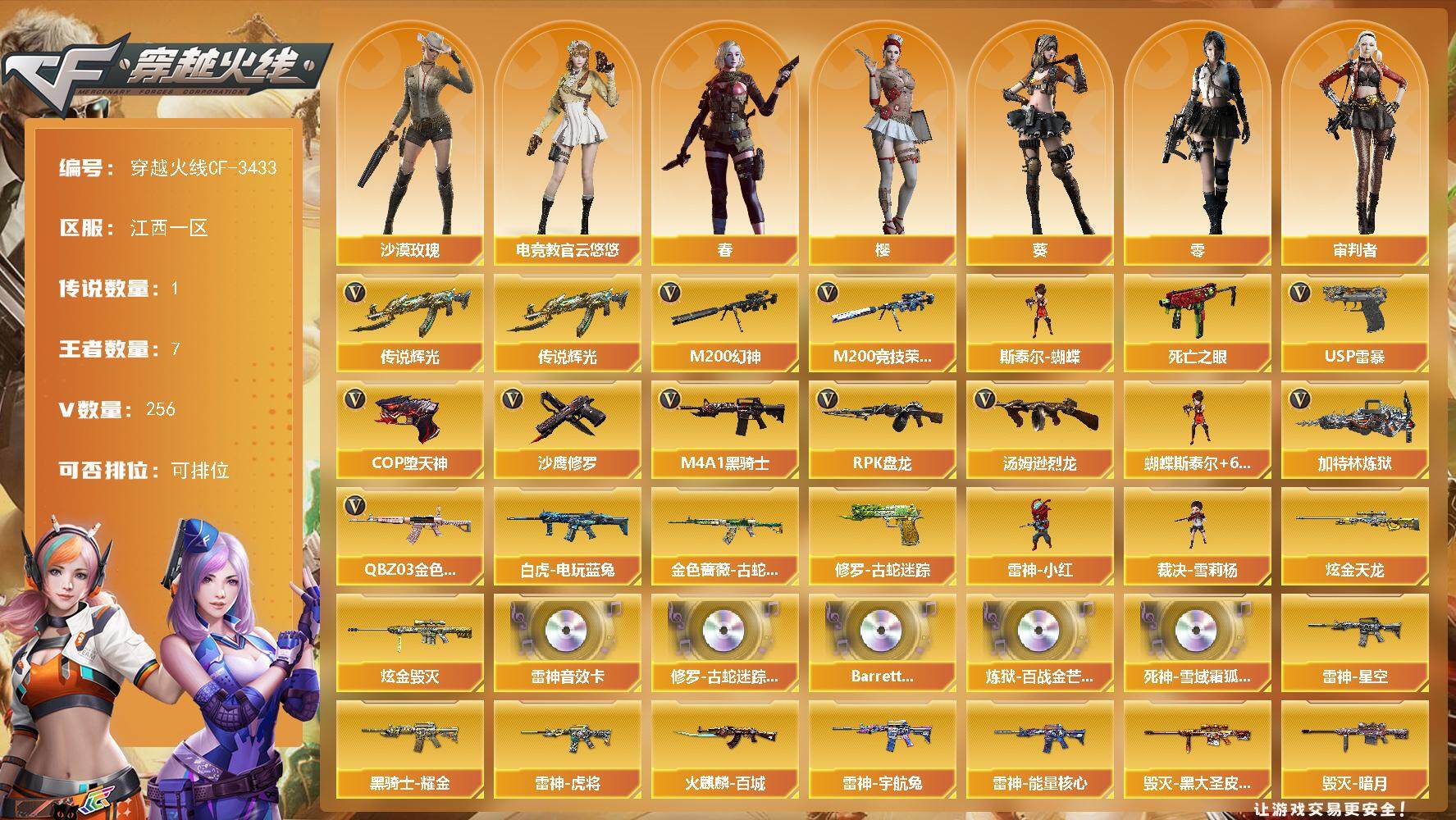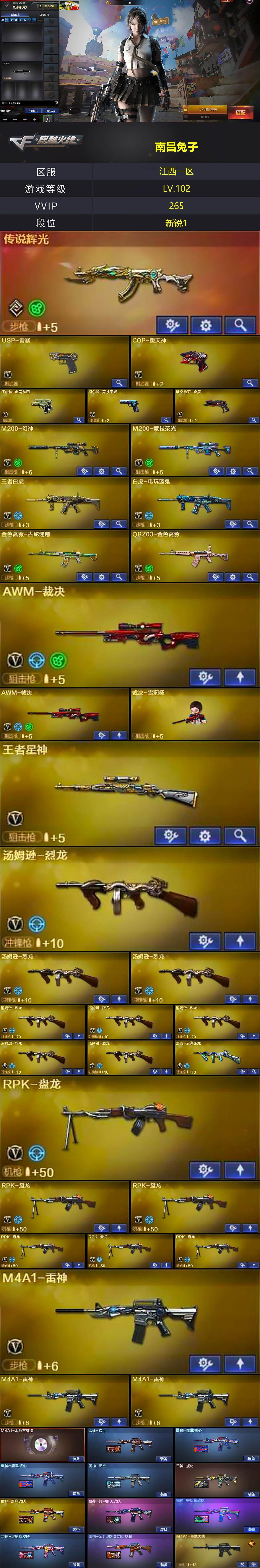 [13584059]江西一区-256V-7王者-2炫金 【传说武器】:传说辉光 【热门武器】:传说辉光,QBZ03-金色蔷薇,M200-幻神,金色蔷薇-古蛇迷踪,修罗-古蛇迷踪,M200-竞技荣光,死亡之眼,白虎-电玩蓝兔,M4A1-黑骑士*2,汤姆逊-烈龙*8,RPK-盘龙*6,加特林-炼狱*3,斯泰尔-蝴蝶,雷神-小红,裁决-雪莉杨,USP-雷暴,COP-堕天神,沙鹰-修罗*7 【王者炫金武器】:炫金毁灭,炫金天龙 【音效卡】:修罗-古蛇迷踪音效卡,M4A1-雷神音效卡,Barrett-碧霄极光音效卡,炼狱-百战金芒-庆典舞曲音效卡,死神-雪域霜狐-怀旧音效卡 【皮肤】:雷神-暗月,雷神-能量核心*2,雷神-星空,雷神-虎将,雷神-烈虎皮肤,雷神-机甲刑天皮肤,雷神-宇航兔皮肤,雷神-维纳斯皮肤,雷神-源计划2.0专属 皮肤,M4A1-再燃火线,火麒麟-雷神,火麒麟-平天大圣,火麒麟-百城,火麒麟-心动糖果,毁灭-暗月,毁灭-黑大圣皮肤,毁灭-风暴*2,毁灭-百城浙江 皮肤,M4A1-千变-孔明皮肤,黑龙-能量核心,黑龙-暗月*2,黑骑士耀金皮肤,黑骑士-破浪10年皮肤,天启-暗月,战神-紫绶金章皮肤,战神-流金岁月皮肤*2,AK47-B-常胜将军-刘备,AK47-B-常胜将军-孙权,AWM-天龙-传奇白鲨,极光-能量核心,炼狱-玩具枪皮肤,炼狱-月 皮肤,修罗-能量核心*4,天神-暗月*2,屠龙-春桃 皮肤,轻型军用手斧-再燃火线,麒麟刺-月皮肤 【角色】:零,葵,樱,春,凌霄,沙漠玫瑰,电竞教官-云悠悠,审判者,战地猎狐,雪域霜狐,蛇隐宗,奇洋探员,乔伊教练,修道士,云海玲珑,暗夜-X,北极狐-X,初恋灵狐,电竞少女,芳心审判者,飞虎队-X,风暴女,虎妞,嘉年华灵狐,疾风,娟娟,兰-海滩派对,兰-空鹰,兰-新年限定,兰妹妹,猎狐者-追月,0号玩家,零-水下丽影,灵狐者-黄金海岸,灵狐者-七夕宝贝,灵狐者-职业经理,龙儿,龙儿-小淘气,麻雀,曼陀罗-X,曼陀罗-礼服,玫瑰花神,萌儿,潘多拉-X,潘多拉-甜心教官,潜龙队-X,邱刚敖,青霞仙子,蛇姬,斯沃特-X,蜀雪,铁骑荣耀,兔囡囡,维纳斯,新娜塔莎,雪莉杨,夜玫瑰-宠粉,樱-战斗天使,影武者-X,游珑儿,智影,雅典娜 【人偶武器】:雷神-小红,裁决-雪莉杨,迷你钢铁终结者,迷你救赎猎手,斯泰尔-蝴蝶,加特林-机械猎手,迷你地狱