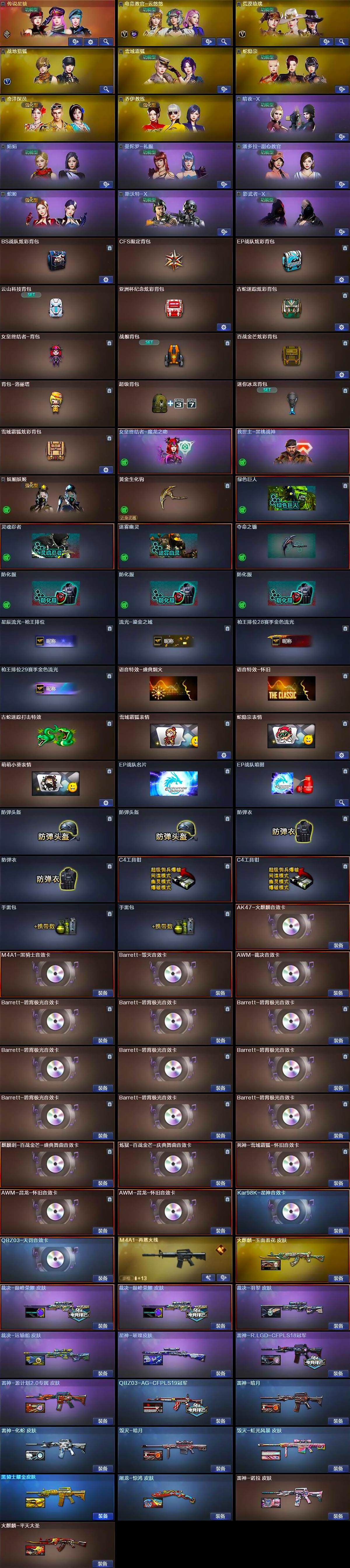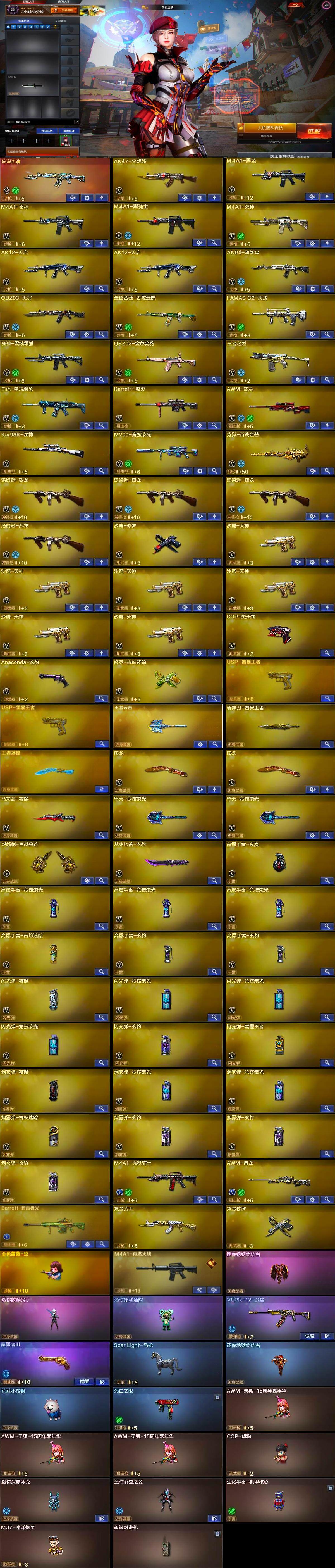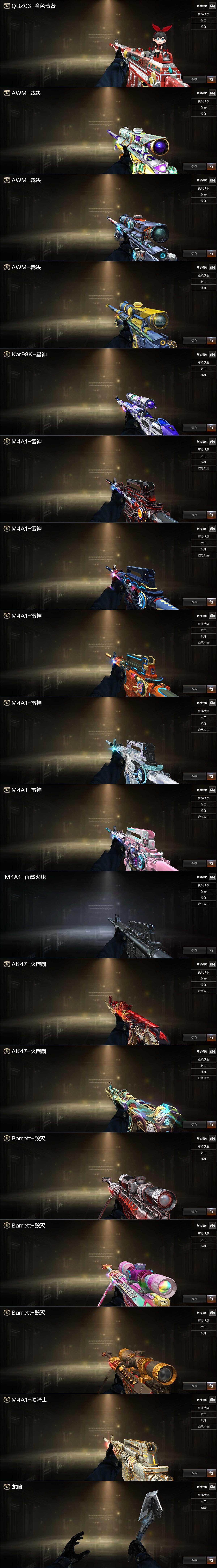【英雄级武器】:AK47-火麒麟,M4A1-黑龙,M4A1-雷神,M4A1-黑骑士,M4A1-死神,AK12-天启*2,AN94-超新星,QBZ03-天罚,M4A1-凌龙-VI,金色蔷薇-古蛇迷踪,FAMAS G2-天戎,死神-雪域霜狐,QBZ03-金色蔷薇,王者之烈-觉醒版,白虎-电玩蓝兔,Barrett-毁灭,AWM-裁决,Kar98