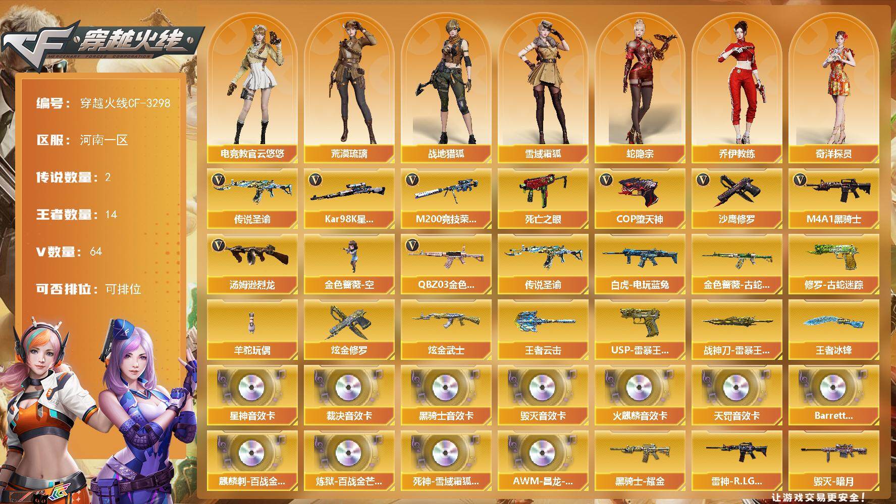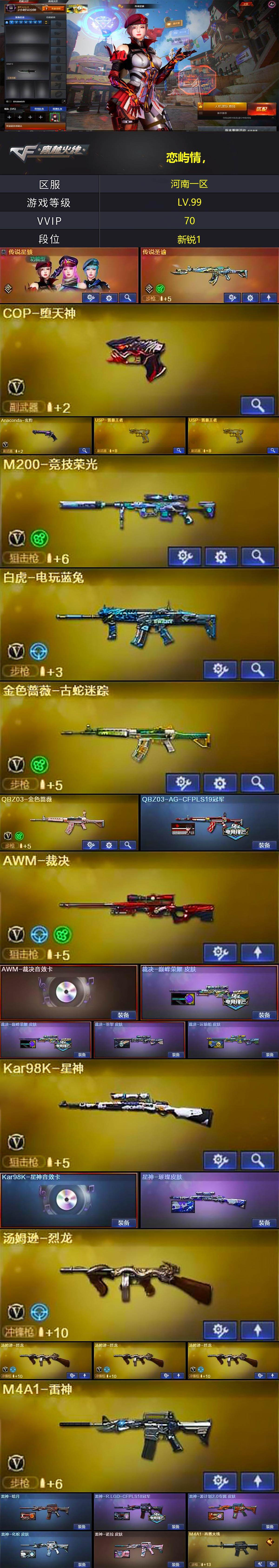 [13688885]河南一区-64V-14王者-2炫金 【传说武器】:传说圣谕 【传说角色】:传说星骇 【热门武器】:传说圣谕,QBZ03-金色蔷薇,金色蔷薇-古蛇迷踪,修罗-古蛇迷踪,M200-竞技荣光,死亡之眼,白虎-电玩蓝兔,Kar98K-星神,M4A1-黑骑士,汤姆逊-烈龙*4,金色蔷薇-空,羊驼玩偶,COP-堕天神,沙鹰-修罗 【王者炫金武器】:USP-雷暴王者*2,王者云击,斩神刀-雷暴王者,王者冰锋,炫金武士,炫金修罗 【音效卡】:AK47-火麒麟音效卡,M4A1-黑骑士音效卡,Barrett-毁灭音效卡,AWM-裁决音效卡,Kar98K-星神音效卡,QBZ03-天罚音效卡,Barrett-碧霄极光音效卡*9,麒麟刺-百战金芒-盛典舞曲音效卡,炼狱-百战金芒-庆典舞曲音效卡,死神-雪域霜狐-怀旧音效卡,AWM-昌龙-怀旧音效卡*2 【皮肤】:QBZ03-AG-CFPLS19冠军,裁决-巅峰荣耀 皮肤*2,裁决-羽掣 皮肤,裁决-运输船 皮肤,星神-璀璨皮肤,雷神-暗月,雷神-R.LGD-CFPLS18冠军,雷神-源计划2.0专属 皮肤,雷神-化蛇 皮肤,雷神-诺拉 皮肤,M4A1-再燃火线,火麒麟-平天大圣,火麒麟-玉面羞花 皮肤,毁灭-暗月,毁灭-虹光风暴 皮肤,毁灭-英雄计划 皮肤,黑骑士耀金皮肤,屠龙-惊鸿 皮肤,轻型军用手斧-再燃火线 【角色】:电竞教官-云悠悠,荒漠琉璃,战地猎狐,雪域霜狐,蛇隐宗,奇洋探员,乔伊教练,暗夜-X,娟娟,0号玩家,曼陀罗-礼服,潘多拉-甜心教官,蛇姬,斯沃特-X,影武者-X 【人偶武器】:金色蔷薇-空,迷你钢铁终结者,迷你救赎猎手,迷你律动酷熊,Scar Light-马枪,迷你地狱终结者,茸茸小松狮,AWM-灵狐-15周年嘉年华*3,COP-旗袍,迷你深渊冰龙,迷你裂空之翼,生化手雷-机甲核心,M37-奇洋探员 【暴走生化】:死亡之眼,超级对讲机 【挑战大师】:VEPR-12-金魔,阐释者III 【英雄级武器】:AK47-火麒麟,M4A1-黑龙,M4A1-雷神,M4A1-黑骑士,M4A1-死神,AK12-天启*2,AN94-超新星,QBZ03-天罚,M4A1-凌龙-VI,金色蔷薇-古蛇迷踪,FAMAS G2-天戎,死神-雪域霜狐,QBZ03-金色蔷薇,王者之烈-觉醒版,白虎-电玩蓝兔,Barrett-毁灭,AWM-裁决,Kar98