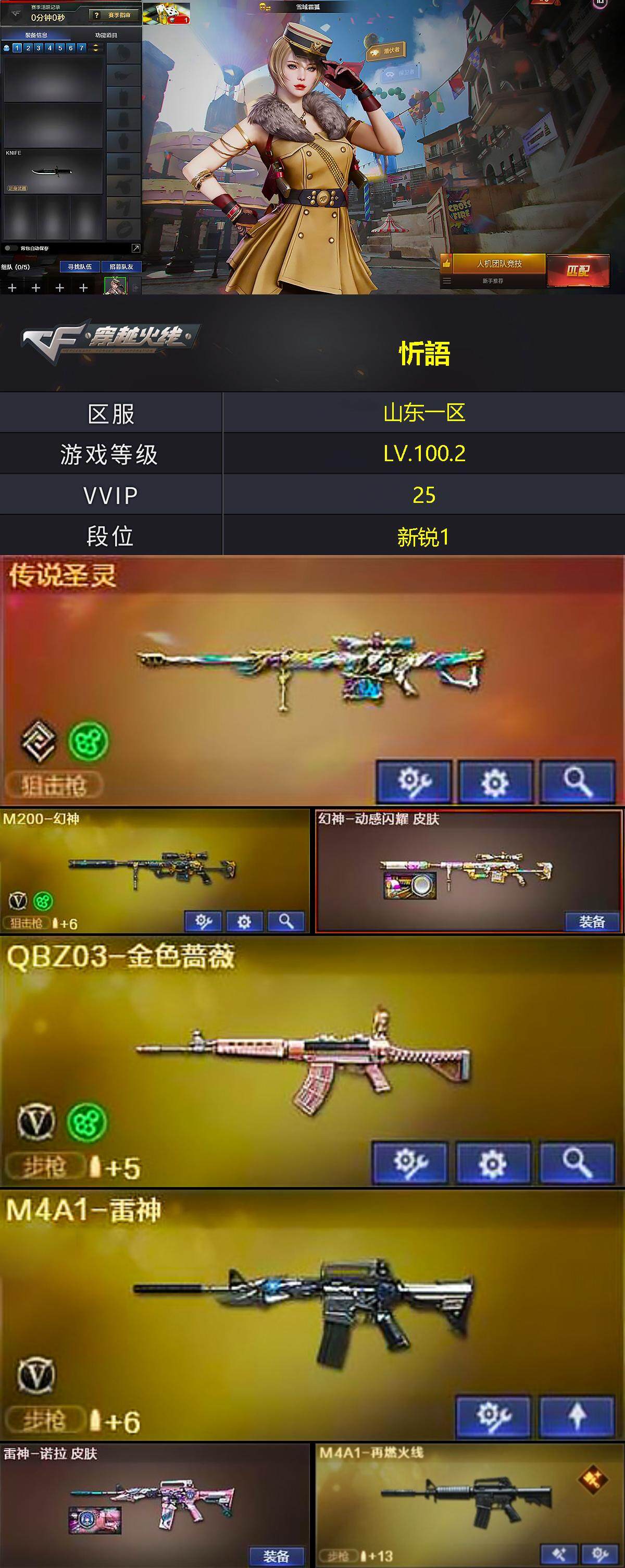 - [12956421]上海一区-83V-5王者-0炫金 【热门武器】:QBZ03-金色蔷薇,M200-竞技荣光,M4A1-黑骑士*4,汤姆逊-烈龙*7,羊驼玩偶,沙鹰-修罗*3,高爆手雷-幻兽*5 【王者炫金武器】:炼狱-悦蓝*2,王者之心 【音效卡】:M4A1-黑骑士音效卡,QBZ03-金色蔷薇音效卡 【稀有皮肤】:M4A1-雷神-CFS 2019,雷神-R.LGD-CFPLS18冠军,火麒麟-大唐荣光,火麒麟-心动糖果,黑骑士-暗月,天神-暗月 【角色】:王者之瞳,零,蝴蝶 【人偶武器】:AWM-灵狐-15周年嘉年华,生化手雷-机甲核心 【暴走生化】:超级对讲机 【挑战大师】:神圣爆裂者-末日III,激光毁灭者III-白马银枪,冰龙粉碎者-白马银枪*2 【英雄级武器】:M200-竞技荣光,高爆手雷-竞技荣光*2,烟雾弹-竞技荣光*2,闪光弹-竞技荣光*2,QBZ95-幻兽,沙鹰-幻兽*5,女皇利刃-幻兽,M4A1-武圣,Glock18-武圣,QBZ03-金色蔷薇,无影-神兵利器,M4A1-雷神*3,M4A1-黑龙*3,M4A1-玫瑰精灵,M4A1-黑骑士*4,汤姆逊-烈龙*7,AK47-无影,AK47-火麒麟*3,AK12-天启,AWM-天龙,Barrett-毁灭*2,Barrett-极光*3,AK47-机械迷城*3,M4A1-千变,沙鹰-天神*3,沙鹰-修罗*3,麒麟刺,擎天,龙啸*2,屠龙*4,高爆手雷-幻兽*5 【特殊枪械】:4黑骑士,6烈龙