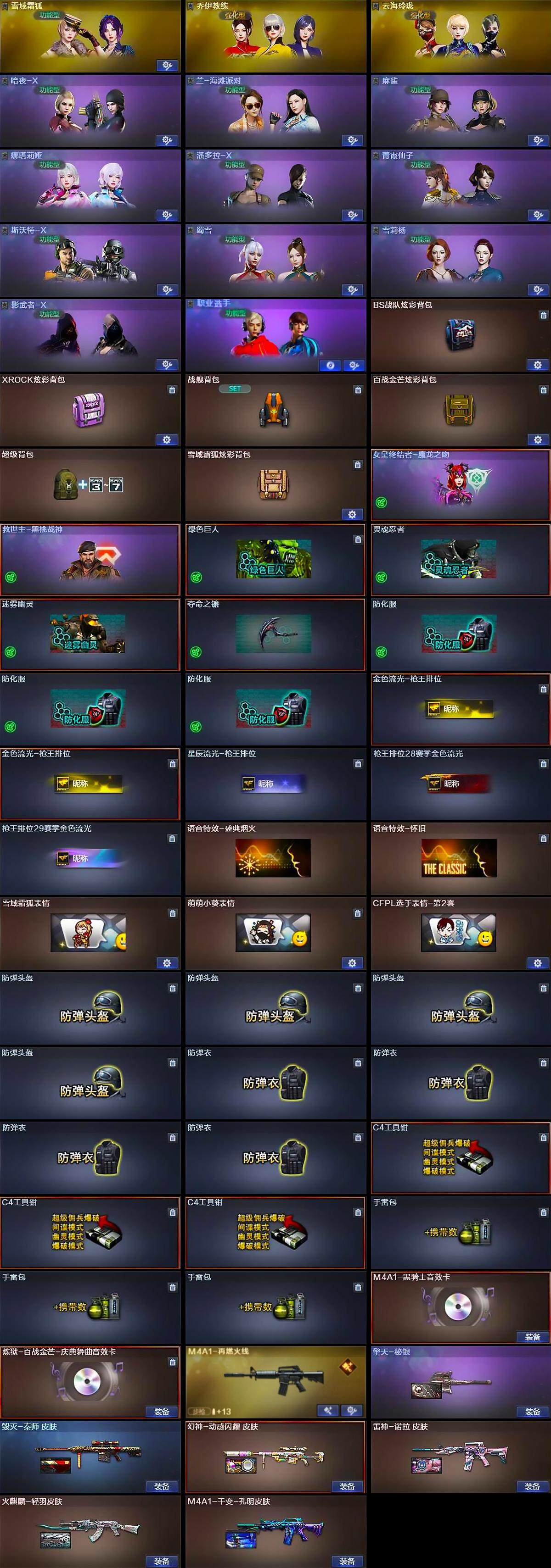 【道具】:BS战队炫彩背包,XROCK炫彩背包,战舰背包,百战金芒炫彩背包,超级背包,雪域霜狐炫彩背包,女皇终结者-魔龙之吻,救世主-黑桃战神,绿色巨人,灵魂忍者,迷雾幽灵,夺命之镰,防化服*3,金色流光-枪王排位*2,星辰流光-枪王排位,枪王排位28赛季金色流光,枪王排位29赛季金色流光,语音特效-盛典烟火,语音特效-怀旧,雪域霜狐表情,萌萌小葵表情,CFPL选手表情-第2套,防弹头盔*4,防弹衣*4,C4工具钳*3,手雷包*3