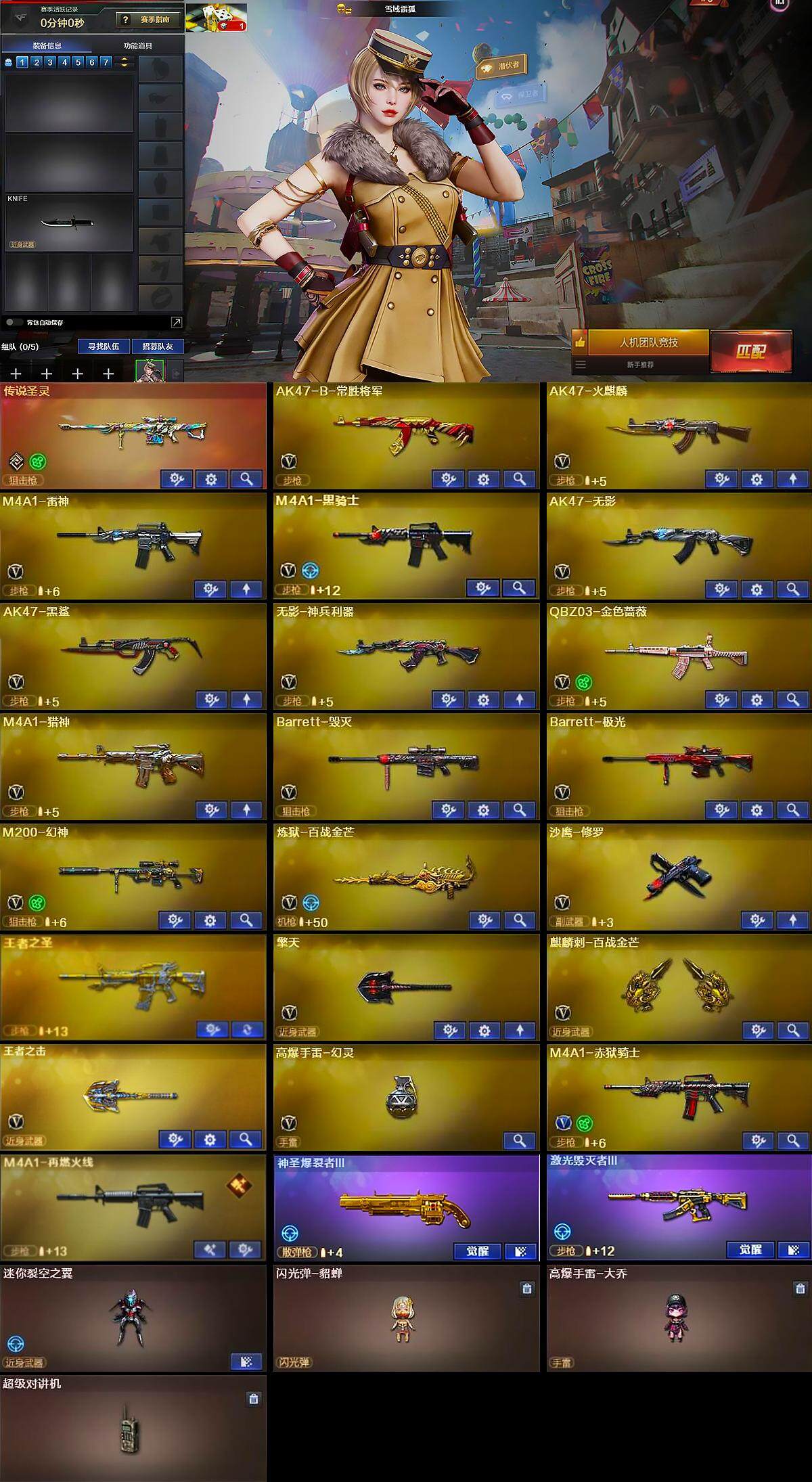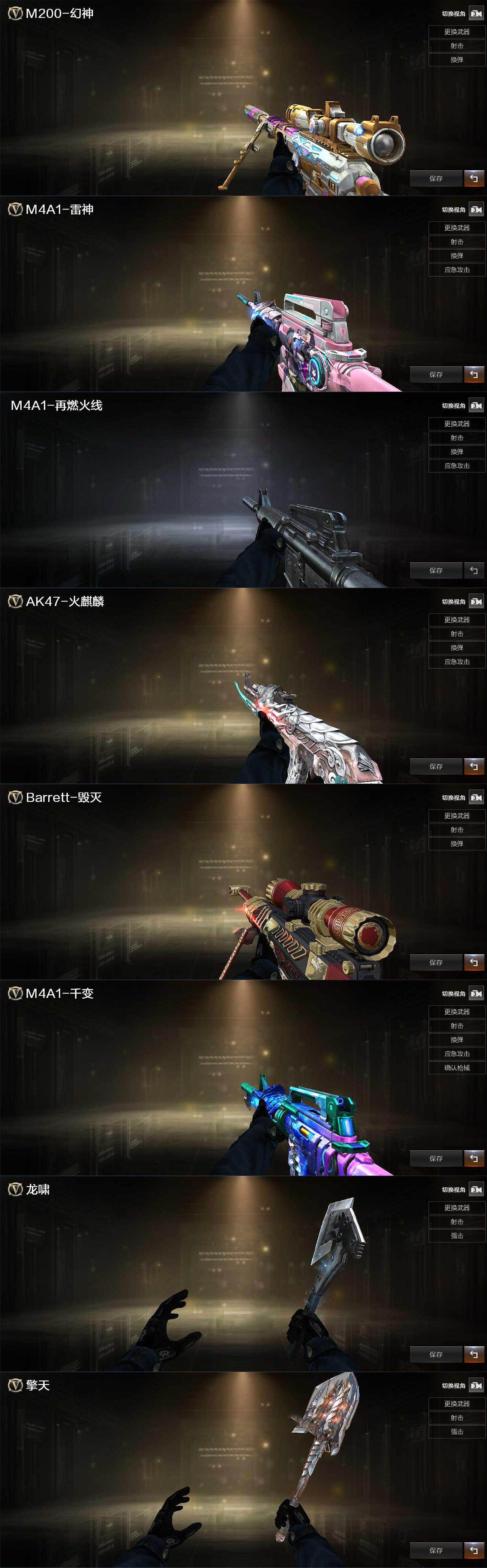 【英雄级武器】:AK47-火麒麟,M4A1-雷神,M4A1-黑骑士,AK47-无影,AK47-黑鲨,无影-神兵利器,QBZ03-金色蔷薇,M4A1-猎神,AK47-B-常胜将军,Barrett-毁灭,Barrett-极光,M200-幻神,炼狱-百战金芒,沙鹰-修罗,擎天,麒麟刺-百战金芒,王者之击-觉醒版,高爆手雷-幻灵,M4A1-赤狱骑士