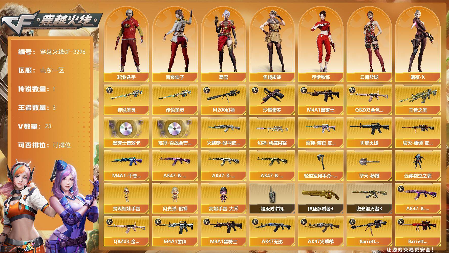 [13688985]山东一区-23V-3王者-0炫金 【传说武器】:传说圣灵 【热门武器】:传说圣灵,QBZ03-金色蔷薇,M200-幻神,M4A1-黑骑士,沙鹰-修罗 【王者炫金武器】:王者之圣 【音效卡】:M4A1-黑骑士音效卡,炼狱-百战金芒-庆典舞曲音效卡 【皮肤】:幻神-动感闪耀 皮肤,雷神-诺拉 皮肤,M4A1-再燃火线,火麒麟-轻羽皮肤,毁灭-秦师 皮肤,M4A1-千变-孔明皮肤,AK47-B-常胜将军-曹操*2,AK47-B-常胜将军-刘备,AK47-B-常胜将军-孙权,轻型军用手斧-再燃火线,擎天-秘银 【角色】:雪域霜狐,乔伊教练,云海玲珑,暗夜-X,疾风,兰-海滩派对,麻雀,娜塔莉娅,潘多拉-X,青霞仙子,斯沃特-X,蜀雪,雪莉杨,影武者-X,职业选手 【人偶武器】:迷你裂空之翼,闪光弹-貂蝉,高爆手雷-大乔,灵狐娃娃手雷 【暴走生化】:超级对讲机 【挑战大师】:神圣爆裂者III,激光毁灭者III 【英雄级武器】:AK47-火麒麟,M4A1-雷神,M4A1-黑骑士,AK47-无影,AK47-黑鲨,无影-神兵利器,QBZ03-金色蔷薇,M4A1-猎神,AK47-B-常胜将军,Barrett-毁灭,Barrett-极光,M200-幻神,炼狱-百战金芒,沙鹰-修罗,擎天,麒麟刺-百战金芒,王者之击-觉醒版,高爆手雷-幻灵,M4A1-赤狱骑士 【道具】:BS战队炫彩背包,XROCK炫彩背包,战舰背包,百战金芒炫彩背包,超级背包,雪域霜狐炫彩背包,女皇终结者-魔龙之吻,救世主-黑桃战神,绿色巨人,灵魂忍者,迷雾幽灵,夺命之镰,防化服*3,金色流光-枪王排位*2,星辰流光-枪王排位,枪王排位28赛季金色流光,枪王排位29赛季金色流光,语音特效-盛典烟火,语音特效-怀旧,雪域霜狐表情,萌萌小葵表情,CFPL选手表情-第2套,防弹头盔*4,防弹衣*4,C4工具钳*3,手雷包*3 【特殊枪械】:1黑骑士