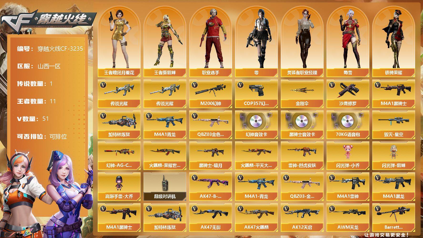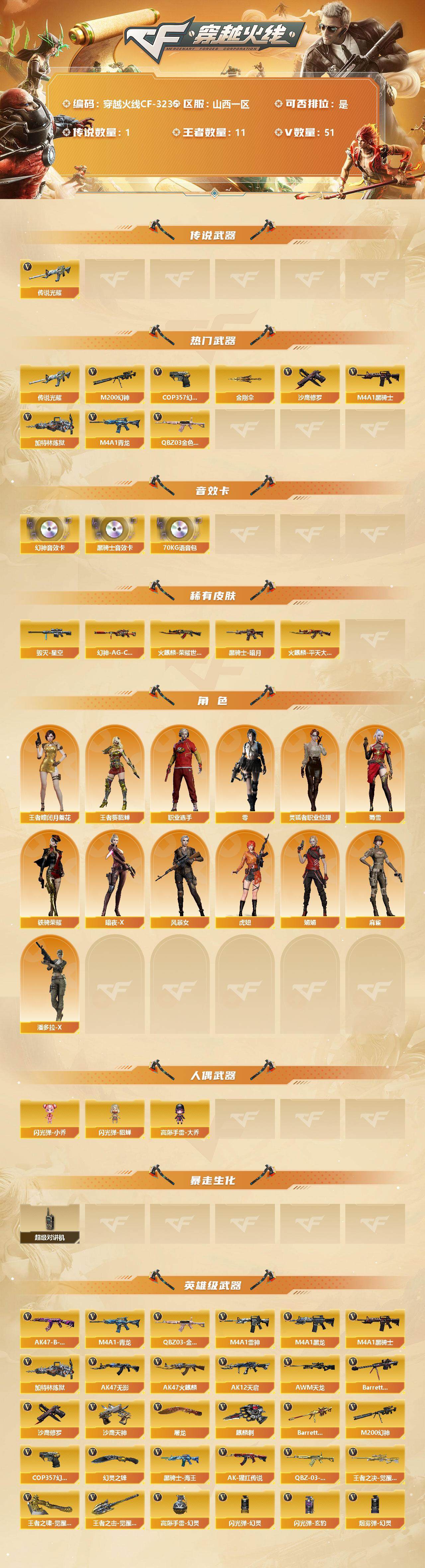 [13370363]山西一区-51V-11王者-0炫金 【传说武器】:传说光耀 【热门武器】:传说光耀,QBZ03-金色蔷薇,M4A1-青龙,M200-幻神,M4A1-黑骑士,加特林-炼狱*4,COP 357-幻灵,沙鹰-修罗*2,金刚伞 【音效卡】:M200-幻神音效卡,M4A1-黑骑士音效卡,70KG语音包 【皮肤】:幻神-AG-CFPLS17冠军,雷神-烈虎皮肤,火麒麟-平天大圣,火麒麟-荣耀世冠AG,毁灭-星空,黑骑士-暗月,战神-紫绶金章皮肤,AK47-B-常胜将军-刘备*2,AK47-B-常胜将军-孙权*2 【角色】:零,王者-瞳-闭月羞花,王者-葵-貂蝉,暗夜-X,风暴女,虎妞,娟娟,灵狐者-职业经理,麻雀,潘多拉-X,蜀雪,铁骑荣耀,职业选手 【人偶武器】:闪光弹-小乔,闪光弹-貂蝉,高爆手雷-大乔 【暴走生化】:超级对讲机 【英雄级武器】:AK47-火麒麟,M4A1-黑龙,M4A1-雷神,M4A1-黑骑士,AK47-无影,AK12-天启,M4A1-青龙,QBZ03-金色蔷薇,AK-47-猩红传说,黑骑士-海王,AK47-B-常胜将军,QBZ-03-王者蔷薇-觉醒版,AWM-天龙,Barrett-毁灭,M200-幻神,Barrett-朱雀,王者之决-觉醒版,加特林-炼狱*4,沙鹰-修罗*2,沙鹰-天神*2,COP 357-幻灵,屠龙,麒麟刺*3,幻灵之锋,王者之啸-觉醒版*2,王者之击-觉醒版*2,高爆手雷-幻灵*4,闪光弹-幻灵*6,闪光弹-玄豹,烟雾弹-幻灵*6 【道具】:BS战队炫彩背包,炫彩背包,超级背包,绿色巨人,夺命之镰,防化服*2,语音特效-机器人,斯沃特表情,防弹头盔*4,防弹衣*4,C4工具钳*4,手雷包*4 【特殊枪械】:1黑骑士,4炼狱