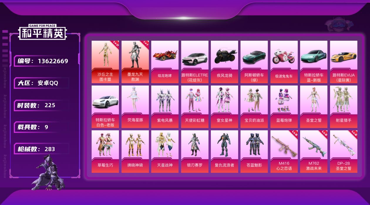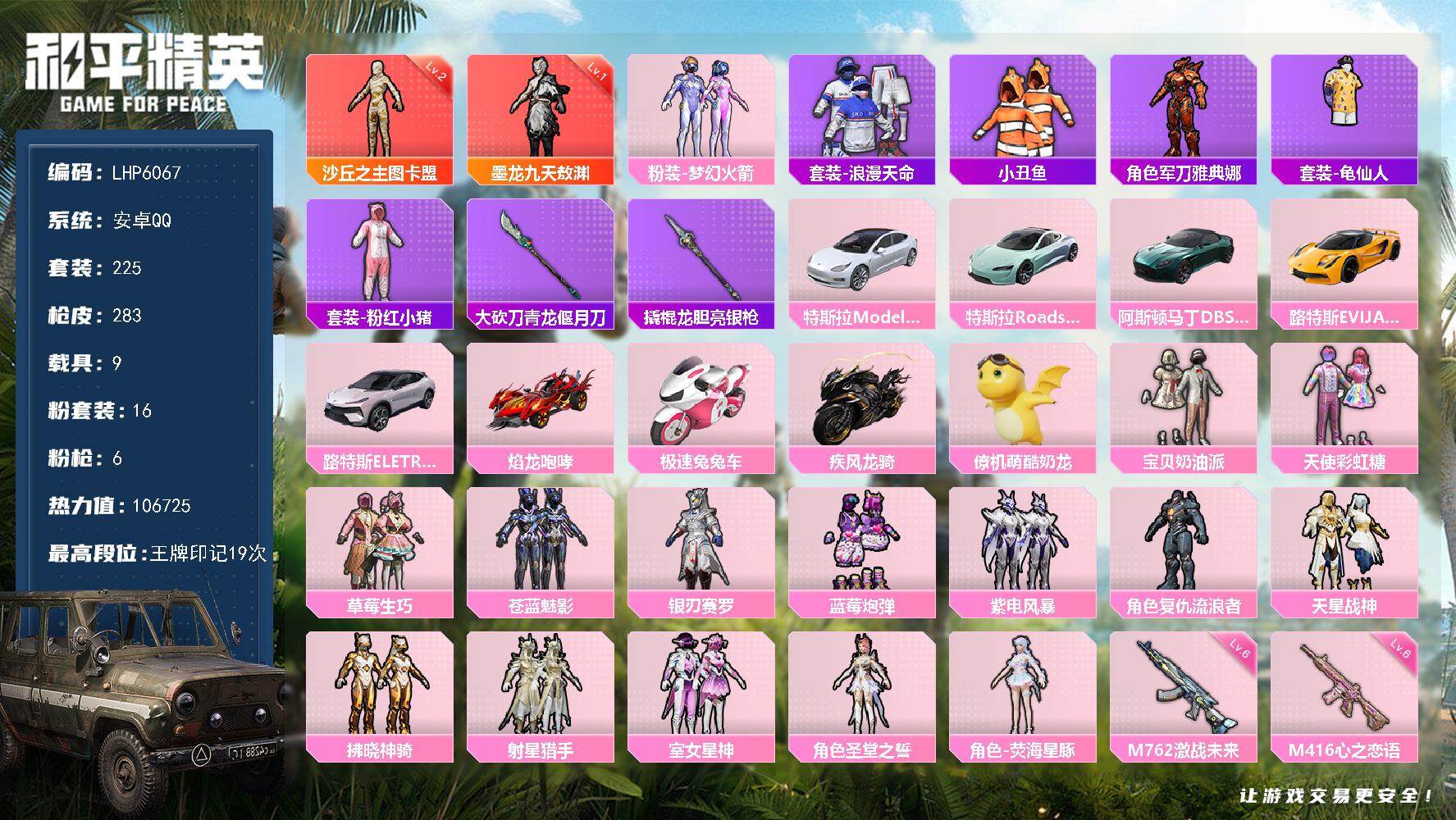 [13622669]【店主推荐捡漏号!可直接换绑】/素材身法号/地铁满天赋 安卓 手Q-2神装-16粉装-6特效枪-9载具-6粉色飞行器-10.6w热力值-19王牌印记-225套装-283枪皮【红色神装等级】:墨龙九天-敖渊(一级),沙丘之主-图卡盟(二级)【热门品类】:粉装-梦幻火箭,套装-浪漫天命,套装-小丑鱼,角色-军刀雅典娜,套装-龟仙人,套装-粉红小猪,大砍刀-青龙偃月刀,撬棍-龙胆亮银枪【粉色载具】:特斯拉Model 3(珍珠白),特斯拉Roadster(水滴蓝),阿斯顿马丁DBS(绿),路特斯EVIJA(星际黄),路特斯ELETRE(花绽灰),焰龙咆哮,极速兔兔车,疾风龙骑,僚机-萌酷奶龙【粉色套装】:粉装-宝贝奶油派,粉装-天使彩虹糖,粉装-梦幻火箭,粉装-草莓生巧,粉装-苍蓝魅影,粉装-银刃赛罗,粉装-蓝莓炮弹,粉装-紫电风暴,角色-复仇流浪者,粉装-天星战神,粉装-拂晓神骑,粉装-射星猎手,粉装-室女星神,角色-圣堂之誓,角色-荧海星豚【粉色枪皮等级】:M416-心之恋语(六级),M416-墨龙九天(三级),M762-激战未来(六级),Kar98K-巳巳如意(五级),DP-28-圣堂之誓(六级),DP-28-豹影疾电(五级)【粉色飞行器】:梦幻火箭飞行器,伏魔团飞行器,甜蜜誓约飞行器,沙丘之主天马,龙翔九天飞行器