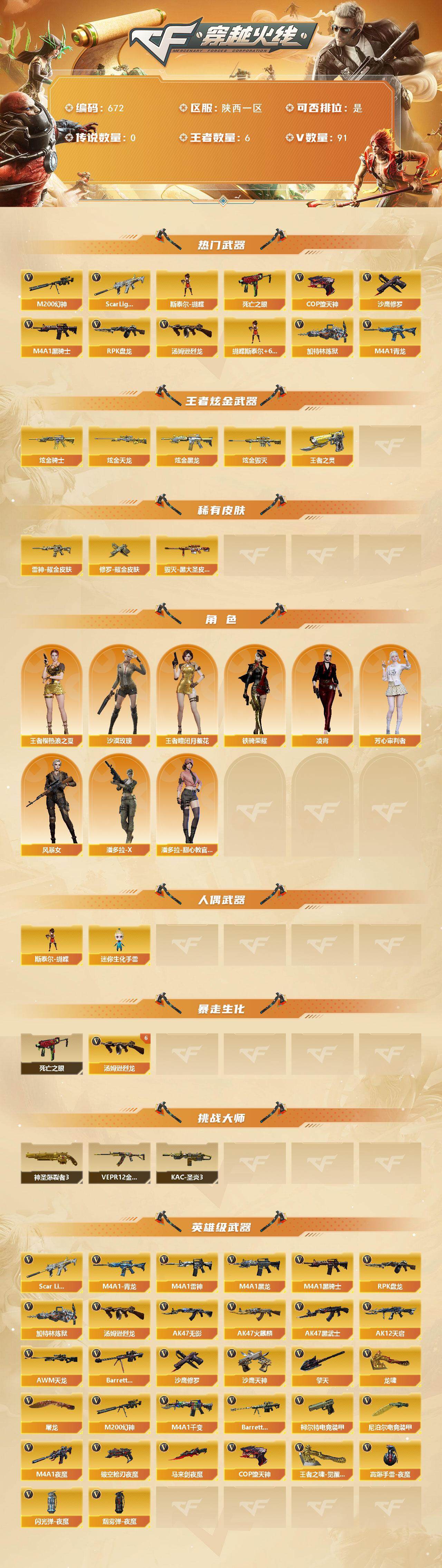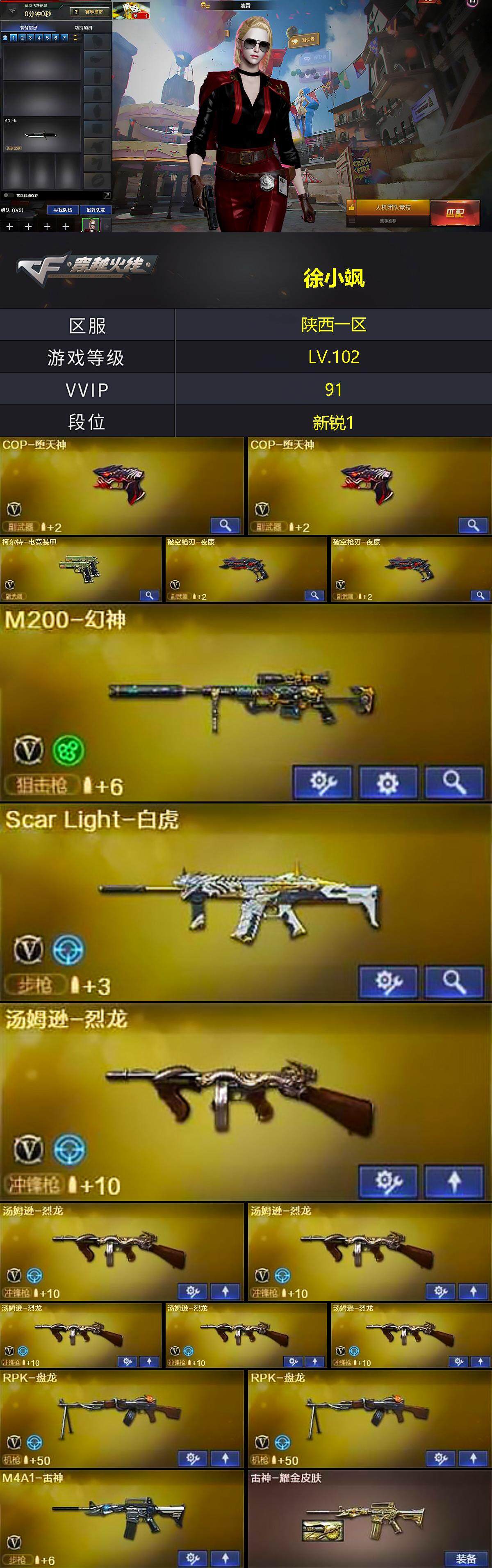 [13711095]陕西一区-91V-6王者-4炫金 【热门武器】:Scar Light-白虎,M4A1-青龙,M200-幻神,死亡之眼,M4A1-黑骑士,汤姆逊-烈龙*6,RPK-盘龙*2,加特林-炼狱*2,斯泰尔-蝴蝶,COP-堕天神*2,沙鹰-修罗*5 【王者炫金武器】:王者之灵*3,炫金骑士,炫金黑龙,炫金毁灭,炫金天龙 【皮肤】:雷神-耀金皮肤,毁灭-黑大圣皮肤,修罗耀金皮肤 【角色】:凌霄,沙漠玫瑰,王者-瞳-闭月羞花,王者樱-热浪之夏,芳心审判者,风暴女,潘多拉-X,潘多拉-甜心教官,铁骑荣耀 【人偶武器】:斯泰尔-蝴蝶,迷你生化手雷 【暴走生化】:死亡之眼 【挑战大师】:神圣爆裂者III,VEPR-12-金魔*3,KAC-圣炎切割者III 【英雄级武器】:M4A1-千变*2,AK47-火麒麟,M4A1-黑龙,M4A1-雷神,M4A1-黑骑士,AK47-无影,AK47-黑武士,AK12-天启*2,M4A1-青龙,Scar Light-白虎,M4A1-夜魔,AWM-天龙,Barrett-毁灭,M200-幻神,Barrett-电竞装甲,RPK-盘龙*2,加特林-炼狱*2,汤姆逊-烈龙*6,沙鹰-修罗*5,沙鹰-天神,COP-堕天神*2,柯尔特-电竞装甲,破空枪刃-夜魔*2,屠龙*3,龙啸,马来剑-夜魔,擎天,尼泊尔-电竞装甲,王者之啸-觉醒版,高爆手雷-夜魔*7,闪光弹-夜魔*7,烟雾弹-夜魔*7 【道具】:CFS限定背包,战舰背包,炫彩背包,妩媚妖姬,绿色巨人,灵魂忍者,变异宝贝,迷雾幽灵,夺命之镰,防化服*2,防弹头盔*3,防弹衣*3,C4工具钳*3,手雷包*3 【特殊枪械】:蝴蝶斯泰尔+6烈龙,1白虎,1黑骑士,6烈龙,2盘龙,2炼狱,1蝴蝶斯泰尔