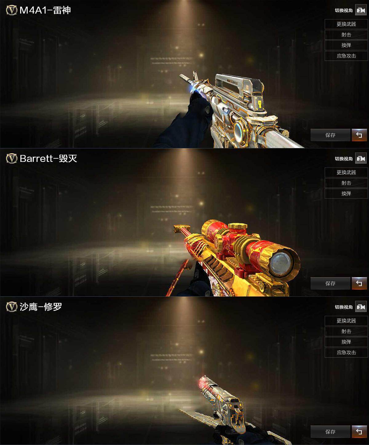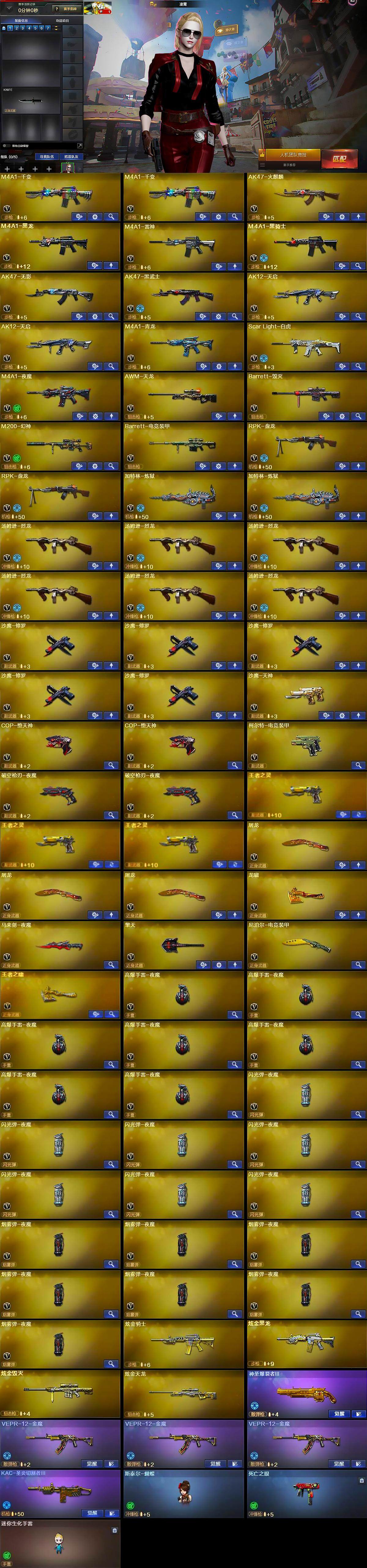 【英雄级武器】:M4A1-千变*2,AK47-火麒麟,M4A1-黑龙,M4A1-雷神,M4A1-黑骑士,AK47-无影,AK47-黑武士,AK12-天启*2,M4A1-青龙,Scar Light-白虎,M4A1-夜魔,AWM-天龙,Barrett-毁灭,M200-幻神,Barrett-电竞装甲,RPK-盘龙*2,加特林-炼狱*2,汤姆逊-烈龙*6,沙鹰-修罗*5,沙鹰-天神,COP-堕天神*2,柯尔特-电竞装甲,破空枪刃-夜魔*2,屠龙*3,龙啸,马来剑-夜魔,擎天,尼泊尔-电竞装甲,王者之啸-觉醒版,高爆手雷-夜魔*7,闪光弹-夜魔*7,烟雾弹-夜魔*7