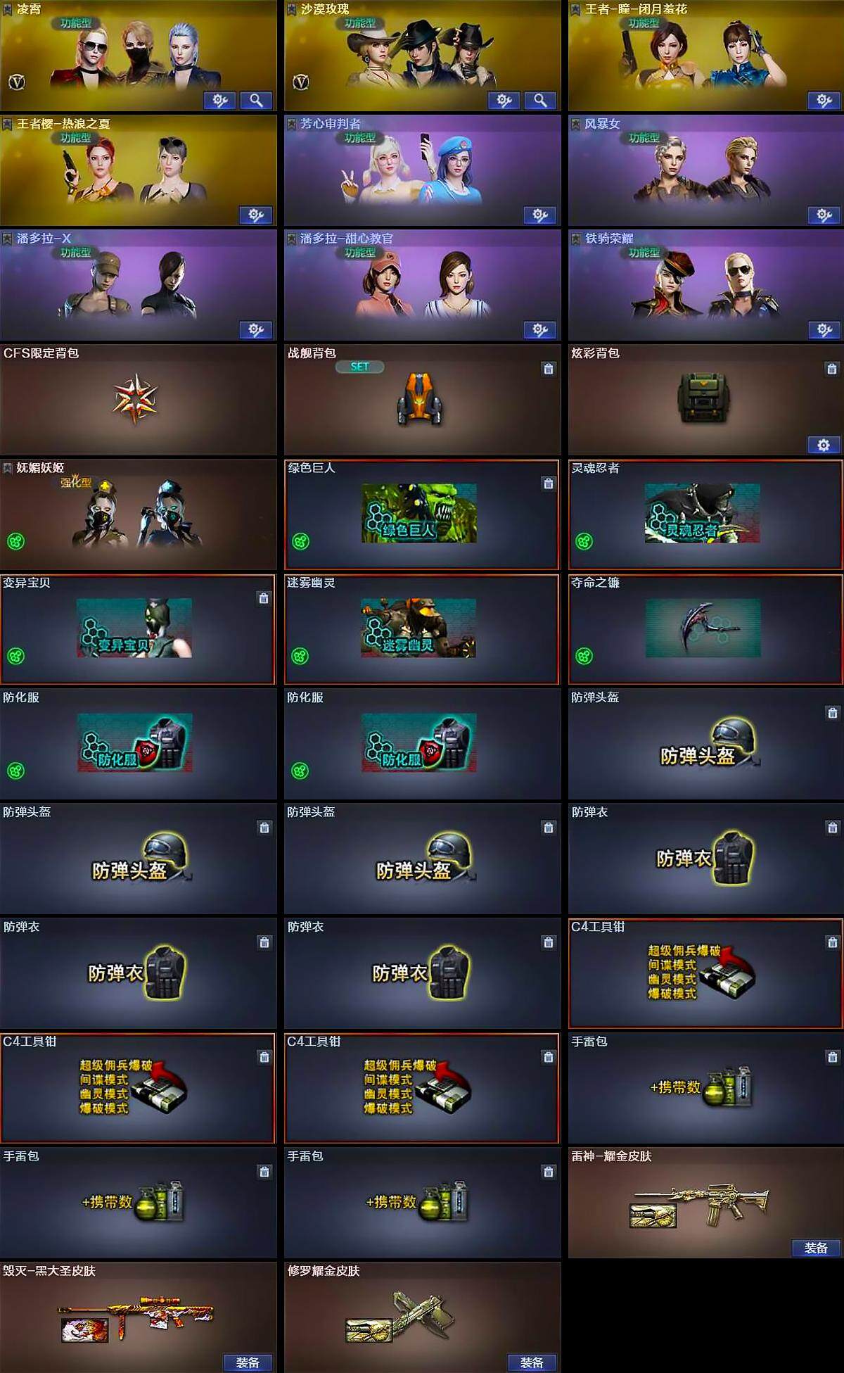 【道具】:CFS限定背包,战舰背包,炫彩背包,妩媚妖姬,绿色巨人,灵魂忍者,变异宝贝,迷雾幽灵,夺命之镰,防化服*2,防弹头盔*3,防弹衣*3,C4工具钳*3,手雷包*3