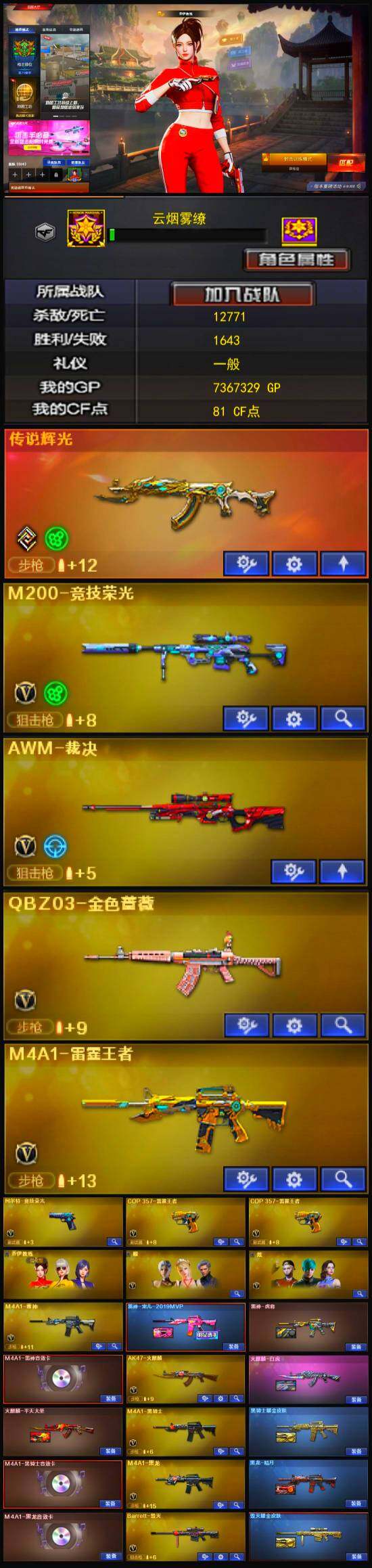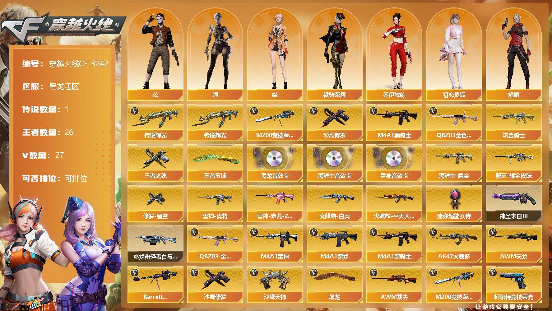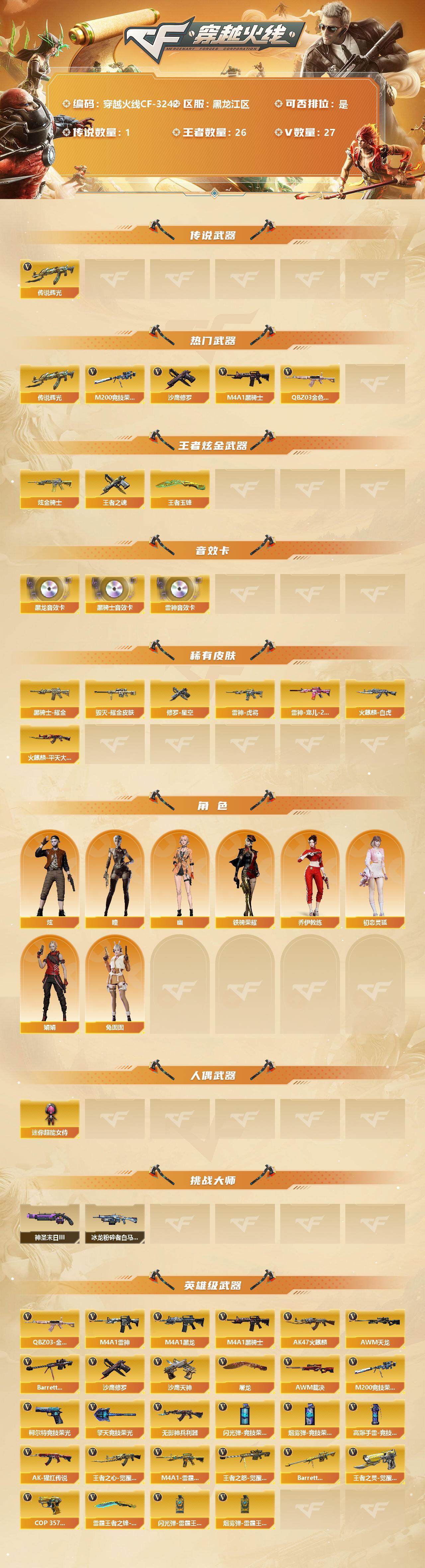 [13372263]黑龙江区-27V-26王者-1炫金 【传说武器】:传说辉光 【热门武器】:传说辉光,QBZ03-金色蔷薇,M200-竞技荣光,M4A1-黑骑士,沙鹰-修罗 【王者炫金武器】:王者之魂,王者玉锋,炫金骑士 【音效卡】:M4A1-雷神音效卡,M4A1-黑龙音效卡,M4A1-黑骑士音效卡 【皮肤】:雷神-虎将,雷神-宠儿-2019MVP,火麒麟-平天大圣,火麒麟-白虎,毁灭耀金皮肤,M4A1-千变-孔明皮肤,黑龙-暗月,黑骑士耀金皮肤,战神-紫绶金章皮肤,修罗-星空 【角色】:瞳,炫,乔伊教练,初恋灵狐,娟娟,铁骑荣耀,兔囡囡,幽 【人偶武器】:迷你超能女侍 【挑战大师】:冰龙粉碎者-白马银枪,神圣爆裂者-末日III 【英雄级武器】:AK47-火麒麟,M4A1-黑龙,M4A1-雷神,M4A1-黑骑士,无影-神兵利器,QBZ03-金色蔷薇,王者之心-觉醒版,AK-47-猩红传说,M4A1-雷霆王者-觉醒版,AWM-天龙*2,Barrett-毁灭,AWM-裁决,M200-竞技荣光,王者之怒-觉醒版,Barrett-雷霆王者-觉醒版,沙鹰-修罗,沙鹰-天神,COP 357-雷霆王者-觉醒版*2,柯尔特-竞技荣光,王者之灵-觉醒版,屠龙*2,擎天-竞技荣光,雷霆王者之锋-觉醒版*2,高爆手雷-竞技荣光*2,闪光弹-竞技荣光*2,闪光弹-雷霆王者-觉醒版*4,烟雾弹-竞技荣光*3,烟雾弹-雷霆王者-觉醒版*4 【道具】:炫彩背包,女皇终结者-魔龙之吻,救世主-黑桃战神,绿色巨人,灵魂忍者,迷雾幽灵,夺命之镰,防化服*3,金色流光-枪王排位,电玩兔兔表情,防弹头盔*4,防弹衣*4,C4工具钳*5,手雷包*5 【特殊枪械】:1黑骑士