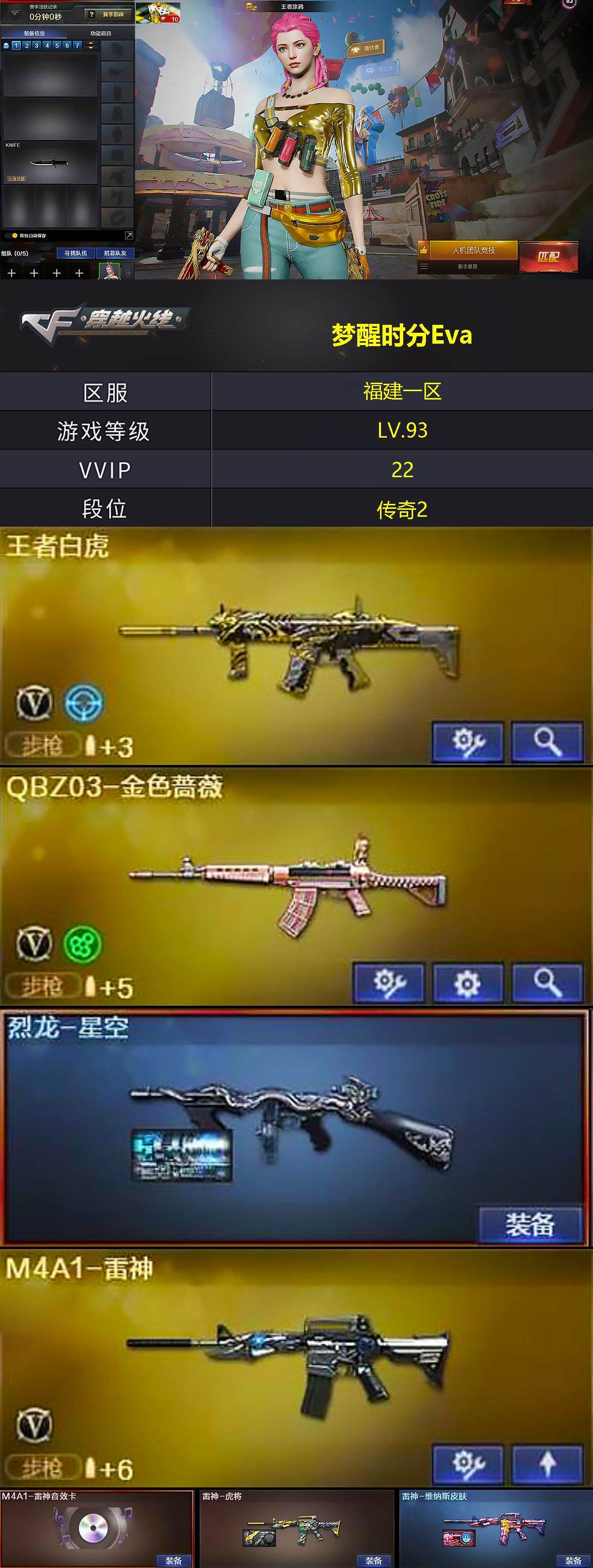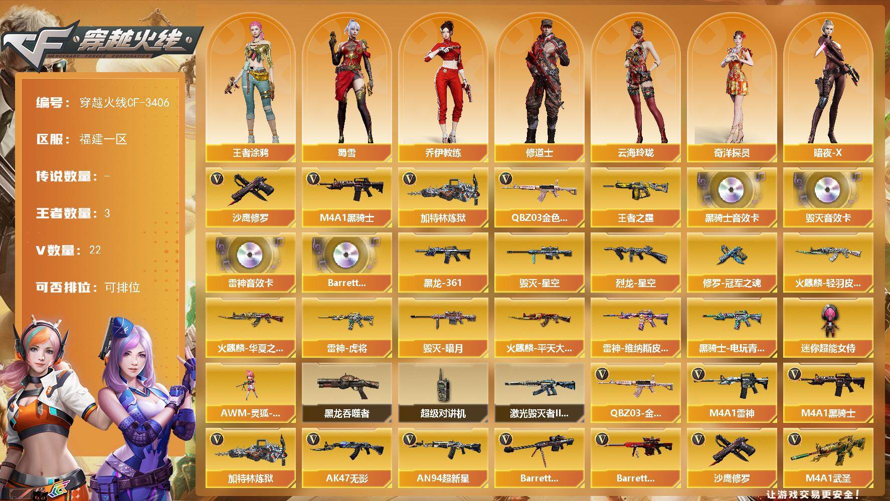 [13631619]福建一区-22V-3王者-0炫金 【热门武器】:QBZ03-金色蔷薇,M4A1-黑骑士,加特林-炼狱,沙鹰-修罗 【王者炫金武器】:王者之霆 【音效卡】:M4A1-雷神音效卡,M4A1-黑骑士音效卡,Barrett-毁灭音效卡,Barrett-碧霄极光音效卡 【皮肤】:烈龙-星空,雷神-虎将,雷神-维纳斯皮肤,火麒麟-华夏之心,火麒麟-轻羽皮肤,火麒麟-平天大圣,毁灭-暗月,毁灭-星空,M4A1-黑龙-361,黑骑士-电玩青兔皮肤,修罗-冠军之魂 【角色】:王者涂鸦,奇洋探员,乔伊教练,修道士,云海玲珑,暗夜-X,风暴女,嘉年华灵狐,灵狐者-X,龙儿,龙儿-小淘气,麻雀,曼陀罗-X,潘多拉-X,潘多拉-甜心教官,斯沃特-X,蜀雪,维纳斯,雪莉杨-摸金校尉,樱-战斗天使,游珑儿 【人偶武器】:AWM-灵狐-15周年嘉年华,迷你超能女侍 【暴走生化】:黑龙吞噬者,超级对讲机 【挑战大师】:激光毁灭者III-白马银枪 【英雄级武器】:M4A1-雷神,M4A1-黑骑士,AK47-无影,AN94-超新星,M4A1-武圣,无影-神兵利器,黑武士-锦绣游龙,QBZ03-金色蔷薇,烈火-动感闪耀,王者白虎-觉醒版,Barrett-毁灭,Barrett-极光,加特林-炼狱,沙鹰-修罗,Glock18-武圣,天神-动感闪耀,屠龙-动感闪耀,手雷-动感闪耀,烟雾弹-神工天巧*2,Barrett-碧霄极光 【道具】:BS战队炫彩背包,云山科技背包,奇洋探员-海龟背包,超级背包,迷你冰龙背包,女皇终结者-魔龙之吻,救世主-黑桃战神,绿色巨人,灵魂忍者,迷雾幽灵,夺命之镰,防化服*3,金色流光-枪王排位*2,星辰流光-枪王排位,枪王排位28赛季金色流光,枪王排位29赛季金色流光,动感闪耀表情,C4-沙漠,防弹头盔*4,防弹衣*4,C4工具钳*4,手雷包*4 【特殊枪械】:1黑骑士,1炼狱