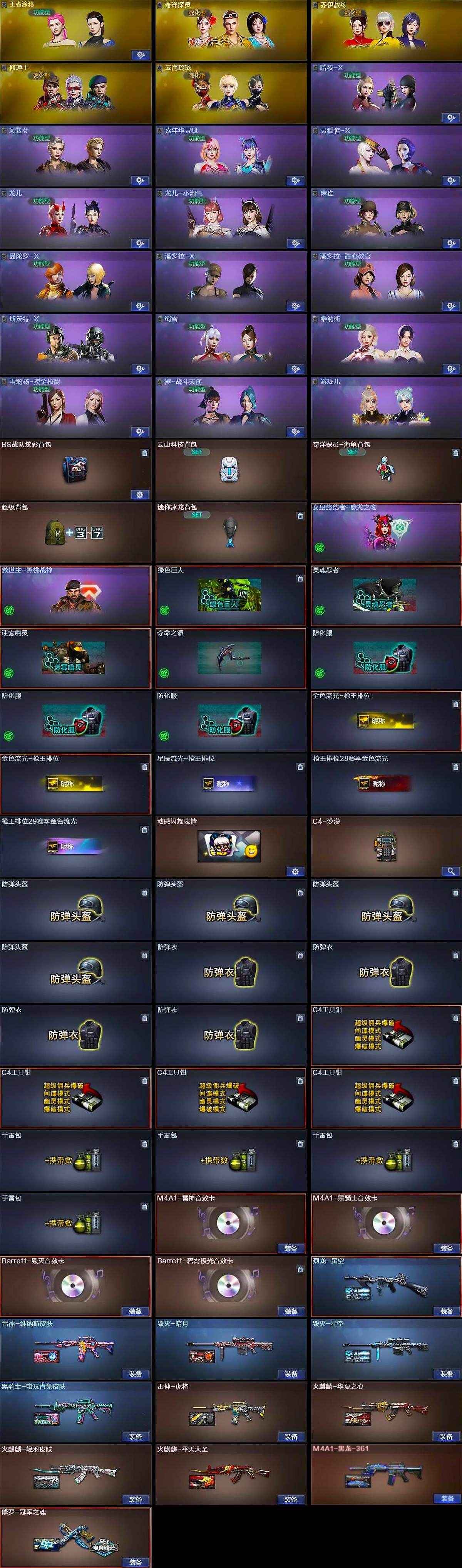 【道具】:BS战队炫彩背包,云山科技背包,奇洋探员-海龟背包,超级背包,迷你冰龙背包,女皇终结者-魔龙之吻,救世主-黑桃战神,绿色巨人,灵魂忍者,迷雾幽灵,夺命之镰,防化服*3,金色流光-枪王排位*2,星辰流光-枪王排位,枪王排位28赛季金色流光,枪王排位29赛季金色流光,动感闪耀表情,C4-沙漠,防弹头盔*4,防弹衣*4,C4工具钳*4,手雷包*4