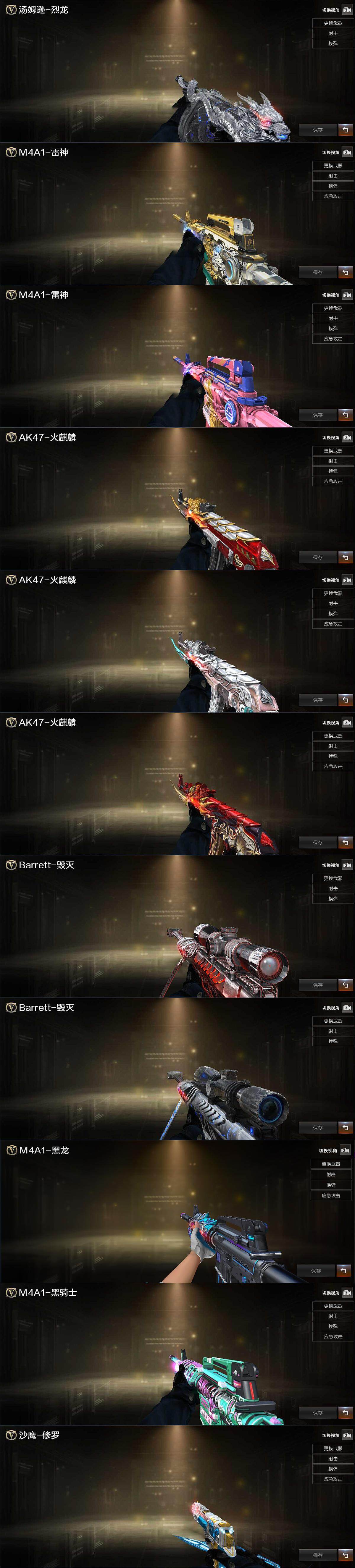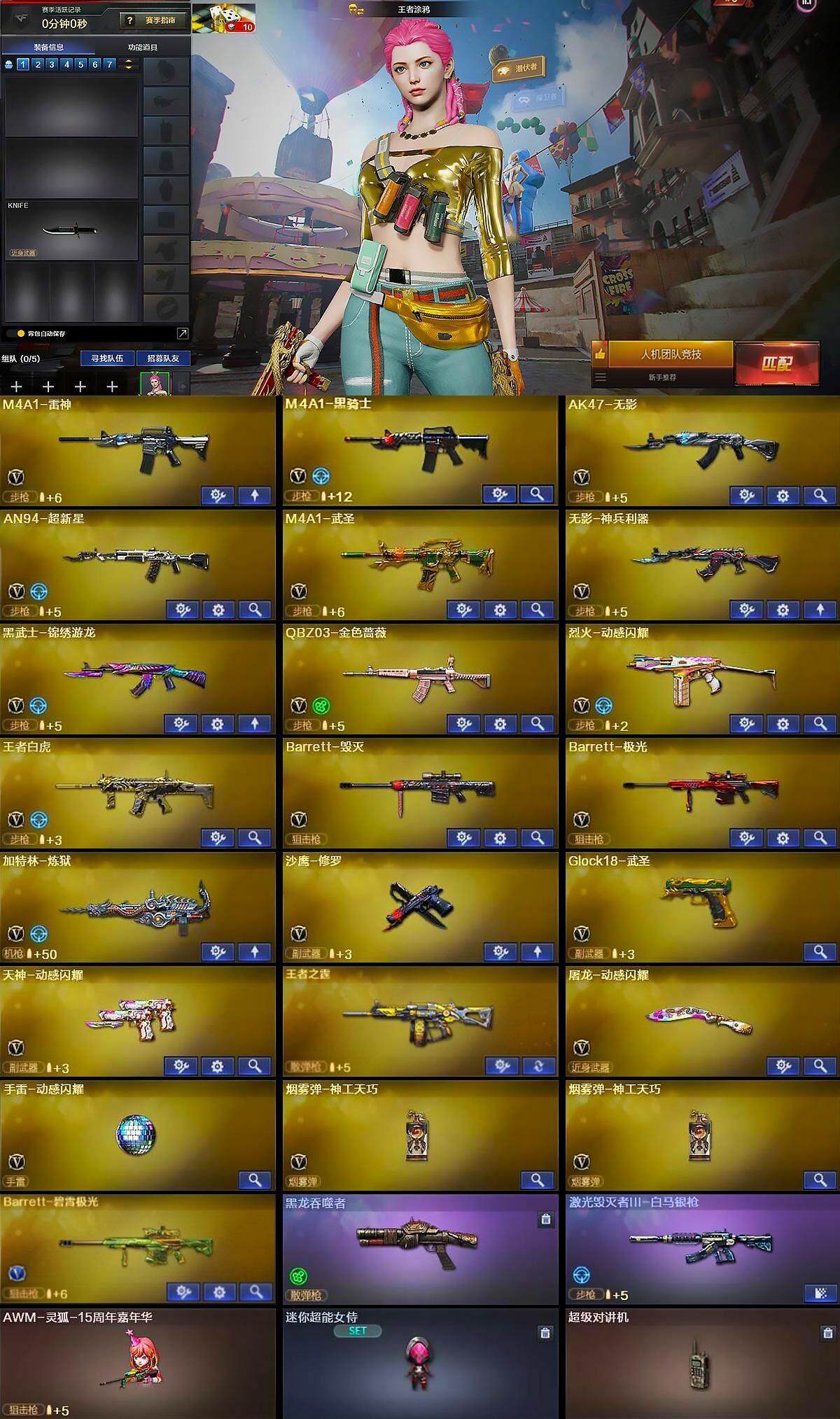 【英雄级武器】:M4A1-雷神,M4A1-黑骑士,AK47-无影,AN94-超新星,M4A1-武圣,无影-神兵利器,黑武士-锦绣游龙,QBZ03-金色蔷薇,烈火-动感闪耀,王者白虎-觉醒版,Barrett-毁灭,Barrett-极光,加特林-炼狱,沙鹰-修罗,Glock18-武圣,天神-动感闪耀,屠龙-动感闪耀,手雷-动感闪耀,烟雾弹-神工天巧*2,Barrett-碧霄极光