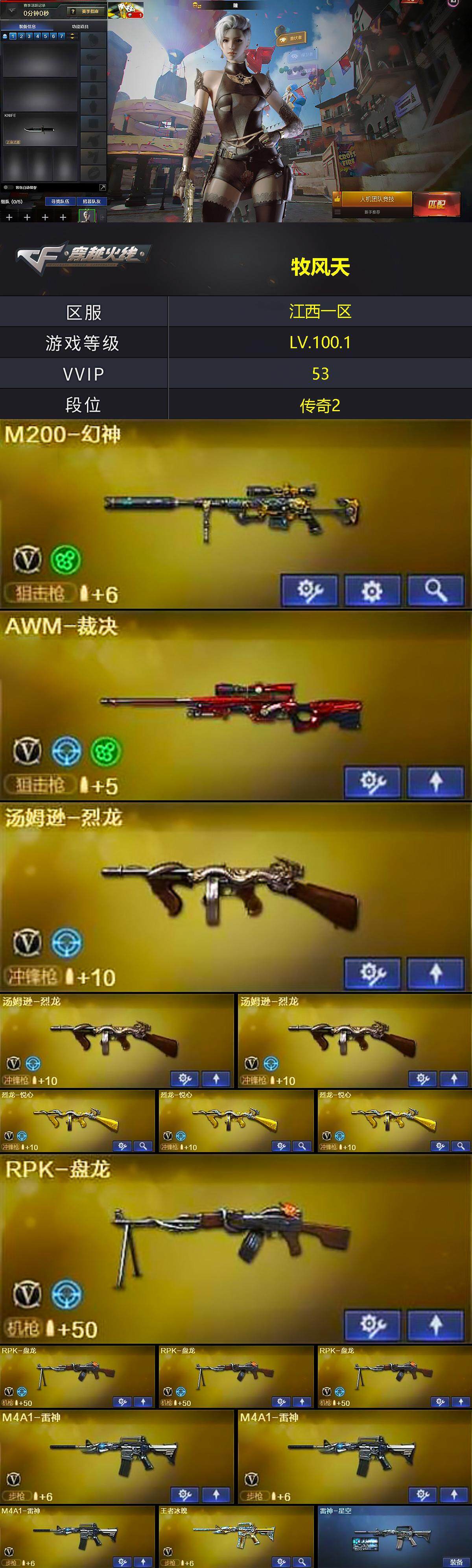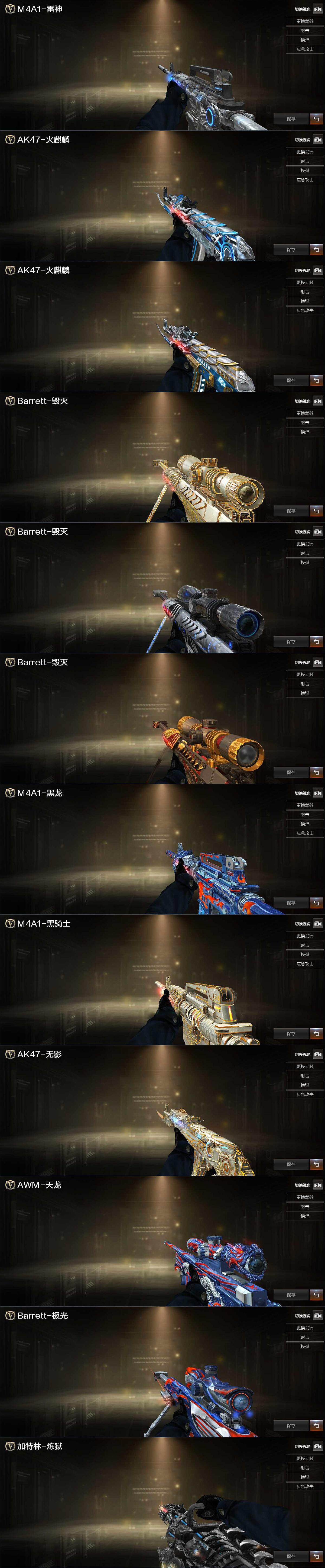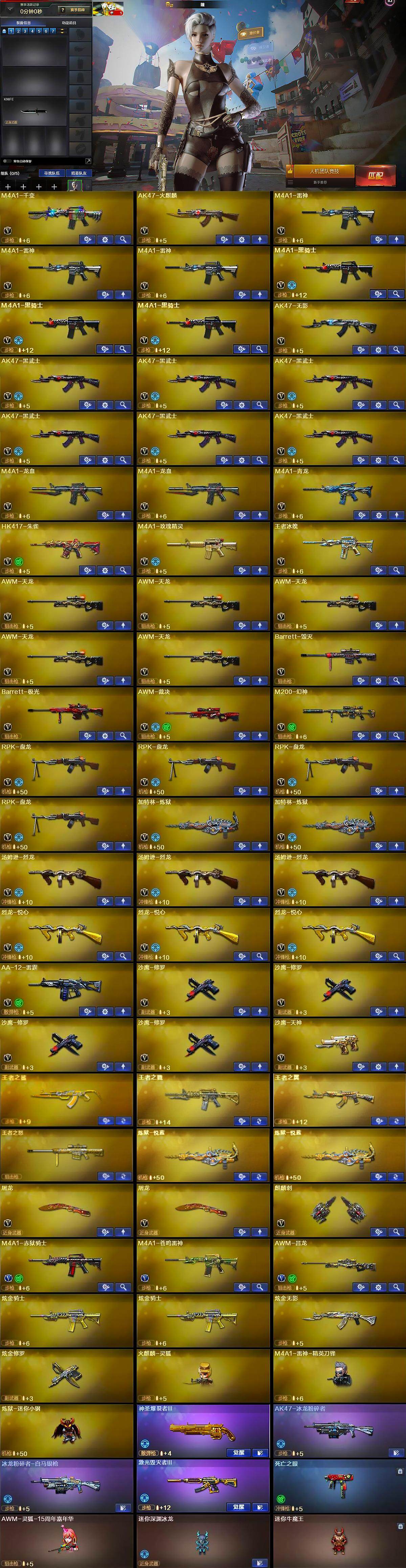 【英雄级武器】:M4A1-千变,AK47-火麒麟,M4A1-雷神*3,M4A1-黑骑士*3,AK47-无影,AK47-黑武士*6,M4A1-龙血*2,M4A1-青龙,HK417-朱雀,M4A1-玫瑰精灵,王者冰魄-觉醒版,AWM-天龙*5,Barrett-毁灭,Barrett-极光,AWM-裁决,M200-幻神,RPK-盘龙*4,加特林-炼狱*2,汤姆逊-烈龙*3,烈龙-悦心-觉醒版*3,AA-12-雷霆,沙鹰-修罗*4,沙鹰-天神,屠龙*2,麒麟刺,M4A1-赤狱骑士,M4A1-苍鸣雷神,AWM-昌龙
