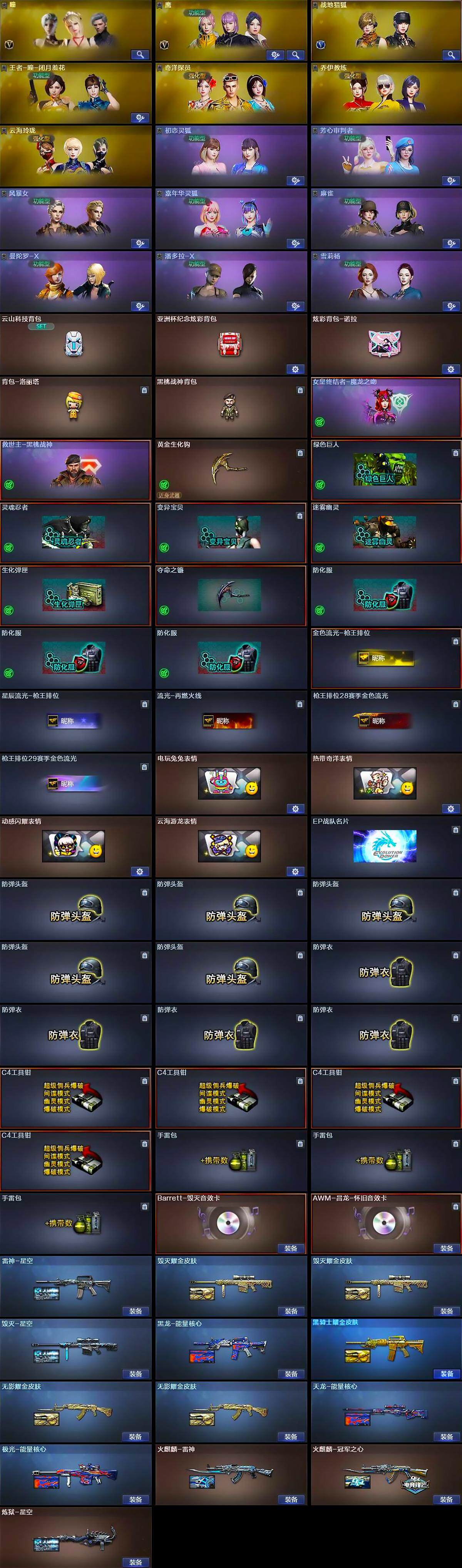 【道具】:云山科技背包,亚洲杯纪念炫彩背包,炫彩背包-诺拉,背包-洛丽塔,黑桃战神背包,女皇终结者-魔龙之吻,救世主-黑桃战神,黄金生化钩,绿色巨人,灵魂忍者,变异宝贝,迷雾幽灵,生化弹匣,夺命之镰,防化服*3,金色流光-枪王排位,星辰流光-枪王排位,流光-再燃火线,枪王排位28赛季金色流光,枪王排位29赛季金色流光,电玩兔兔表情,热带奇洋表情,动感闪耀表情,云海游龙表情,EP战队名片,防弹头盔*5,防弹衣*4,C4工具钳*4,手雷包