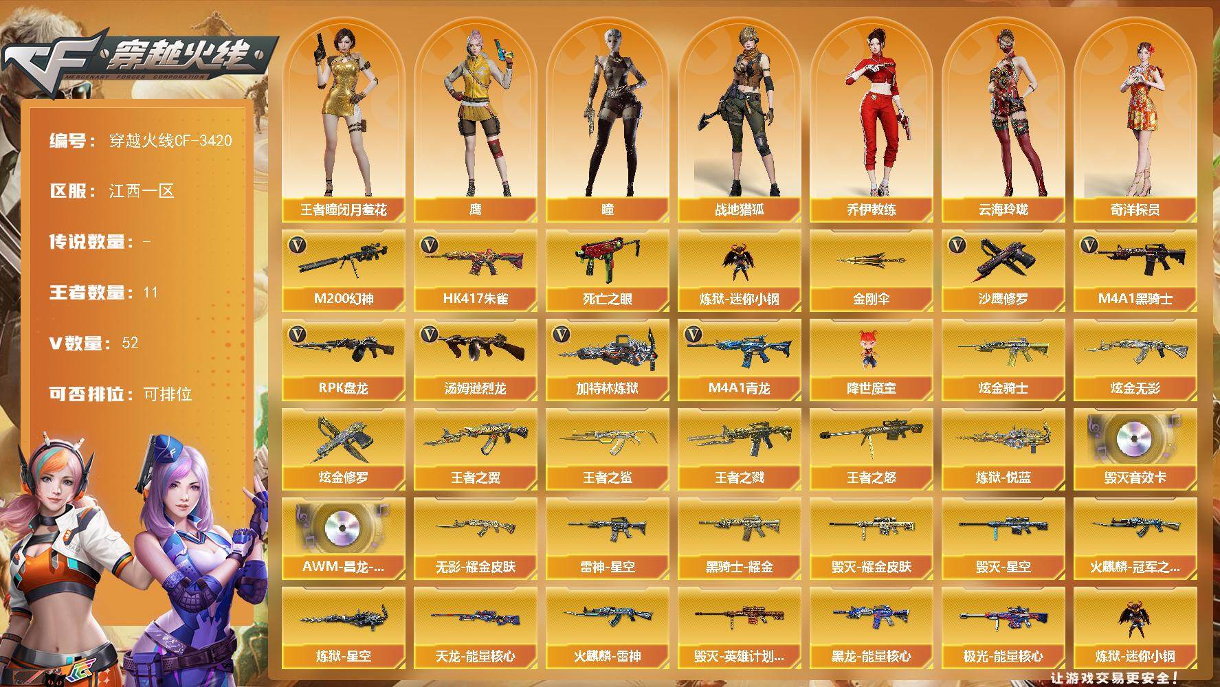 [13653929]江西一区-52V-11王者-4炫金 【热门武器】:HK417-朱雀,M4A1-青龙,M200-幻神,死亡之眼,炼狱-迷你小钢,M4A1-黑骑士*3,汤姆逊-烈龙*3,RPK-盘龙*4,加特林-炼狱*2,降世魔童,沙鹰-修罗*4,金刚伞 【王者炫金武器】:王者之鲨,王者之戮,王者之翼,王者之怒,炼狱-悦蓝*2,炫金骑士*2,炫金无影,炫金修罗 【音效卡】:Barrett-毁灭音效卡,AWM-昌龙-怀旧音效卡 【皮肤】:雷神-星空,火麒麟-雷神,火麒麟-冠军之心,毁灭耀金皮肤*2,毁灭-星空,毁灭-英雄计划 皮肤,黑龙-能量核心,黑骑士耀金皮肤,无影耀金皮肤*2,天龙-能量核心,极光-能量核心,炼狱-星空 【角色】:瞳,鹰,战地猎狐,王者-瞳-闭月羞花,奇洋探员,乔伊教练,云海玲珑,初恋灵狐,芳心审判者,风暴女,嘉年华灵狐,兰-新年限定,麻雀,曼陀罗-X,潘多拉-X,雪莉杨 【人偶武器】:火麒麟-灵狐,M4A1-雷神-精英刀锋,炼狱-迷你小钢,AWM-灵狐-15周年嘉年华,迷你深渊冰龙,迷你牛魔王,灵狐娃娃手雷,降世魔童 【暴走生化】:死亡之眼 【挑战大师】:神圣爆裂者III,AK47-冰龙粉碎者,冰龙粉碎者-白马银枪,激光毁灭者III 【英雄级武器】:M4A1-千变,AK47-火麒麟,M4A1-雷神*3,M4A1-黑骑士*3,AK47-无影,AK47-黑武士*6,M4A1-龙血*2,M4A1-青龙,HK417-朱雀,M4A1-玫瑰精灵,王者冰魄-觉醒版,AWM-天龙*5,Barrett-毁灭,Barrett-极光,AWM-裁决,M200-幻神,RPK-盘龙*4,加特林-炼狱*2,汤姆逊-烈龙*3,烈龙-悦心-觉醒版*3,AA-12-雷霆,沙鹰-修罗*4,沙鹰-天神,屠龙*2,麒麟刺,M4A1-赤狱骑士,M4A1-苍鸣雷神,AWM-昌龙 【道具】:云山科技背包,亚洲杯纪念炫彩背包,炫彩背包-诺拉,背包-洛丽塔,黑桃战神背包,女皇终结者-魔龙之吻,救世主-黑桃战神,黄金生化钩,绿色巨人,灵魂忍者,变异宝贝,迷雾幽灵,生化弹匣,夺命之镰,防化服*3,金色流光-枪王排位,星辰流光-枪王排位,流光-再燃火线,枪王排位28赛季金色流光,枪王排位29赛季金色流光,电玩兔兔表情,热带奇洋表情,动感闪耀表情,云海游龙表情,EP战队名片,防弹头盔*5,防弹衣*4,C4工具钳*4,手雷包