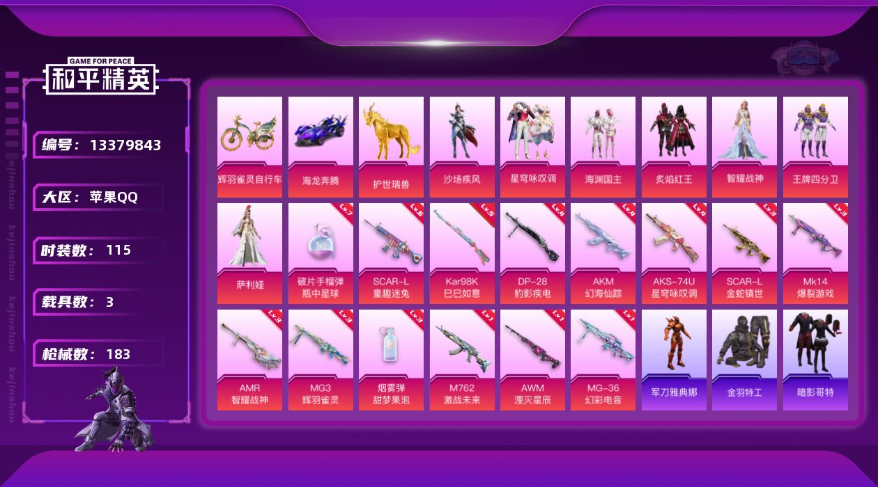 - PX_2081132- 苹果手Q-11王牌印记-11粉装-18特效枪-1载具-93922热力值-195套装-267枪皮-3卓越印记-1传奇印记 【11粉装】,初号机 觉醒Ver.,甜心巧克力,宝贝奶油派,天使彩虹糖,幻彩电音,狂魇小丑,狂花道·不知火舞,复仇流浪者,冰霜白皇,烟云彩露,脉冲星 【18特效枪】AKM-炫紫旋律-4级 AKM-绿萝繁花-5级 SCAR-L-青春物语-5级 M416-电玩