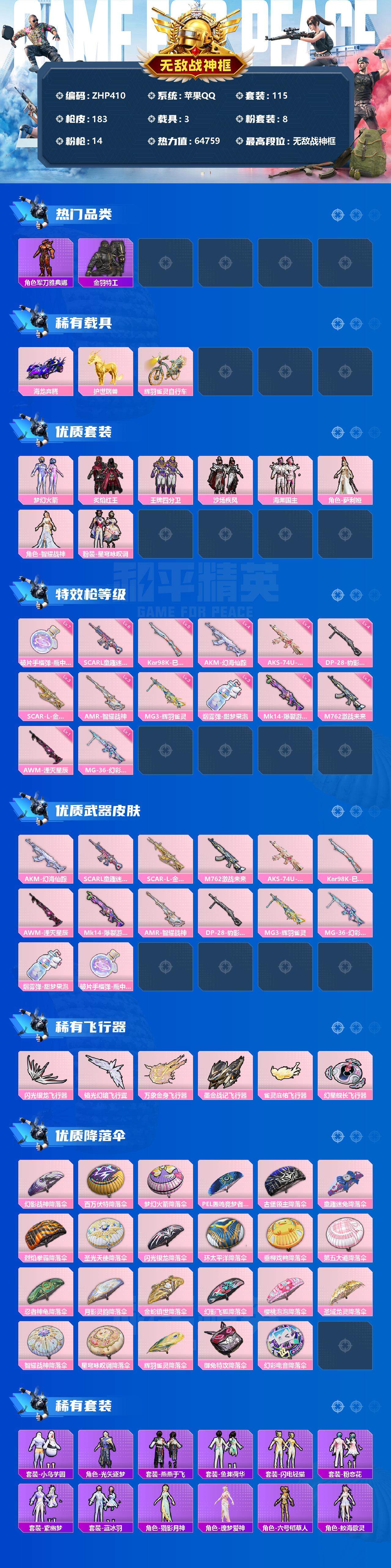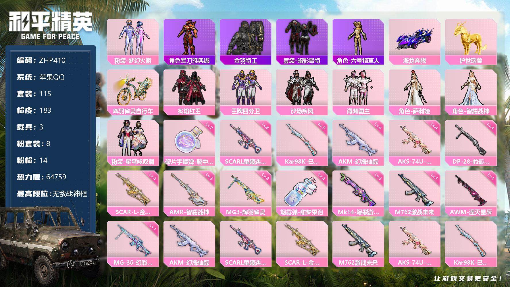 [13379843]可二次【店主推荐捡漏号!可直接换绑】/素材身法号/无敌战神框1 苹果 手Q-无敌战神框-8粉装-14特效枪-3载具-6粉色飞行器-6.4w热力值-9王牌印记-115套装-183枪皮【热门品类】:粉装-梦幻火箭,角色-军刀雅典娜,套装-金羽特工,套装-暗影哥特,角色-六号稻草人【粉色载具】:海龙奔腾,护世瑞兽,辉羽雀灵自行车【粉色套装】:粉装-梦幻火箭,粉装-炙焰红王,粉装-王牌四分卫,粉装-沙场疾风,粉装-海渊国主,角色-萨利娅,角色-智耀战神,粉装-星穹咏叹调【粉色枪皮等级】:AKM-幻海仙踪(四级),SCAR-L-童趣迷兔(六级),SCAR-L-金蛇镇世(三级),M762-激战未来(一级),AKS-74U-星穹咏叹调(四级),Kar98K-巳巳如意(五级),AWM-湮灭星辰(一级),Mk14-爆裂游戏(三级),AMR-智耀战神(三级),DP-28-豹影疾电(四级),MG3-辉羽雀灵(三级),MG-36-幻彩电音(一级),烟雾弹-甜梦果泡(三级),破片手榴弹-瓶中星球(七级)【粉色飞行器】:闪光银龙飞行器,镜光幻境飞行翼,万象金身飞行器,墨金战记飞行器,雀灵庇佑飞行器,幻星舰长飞行器