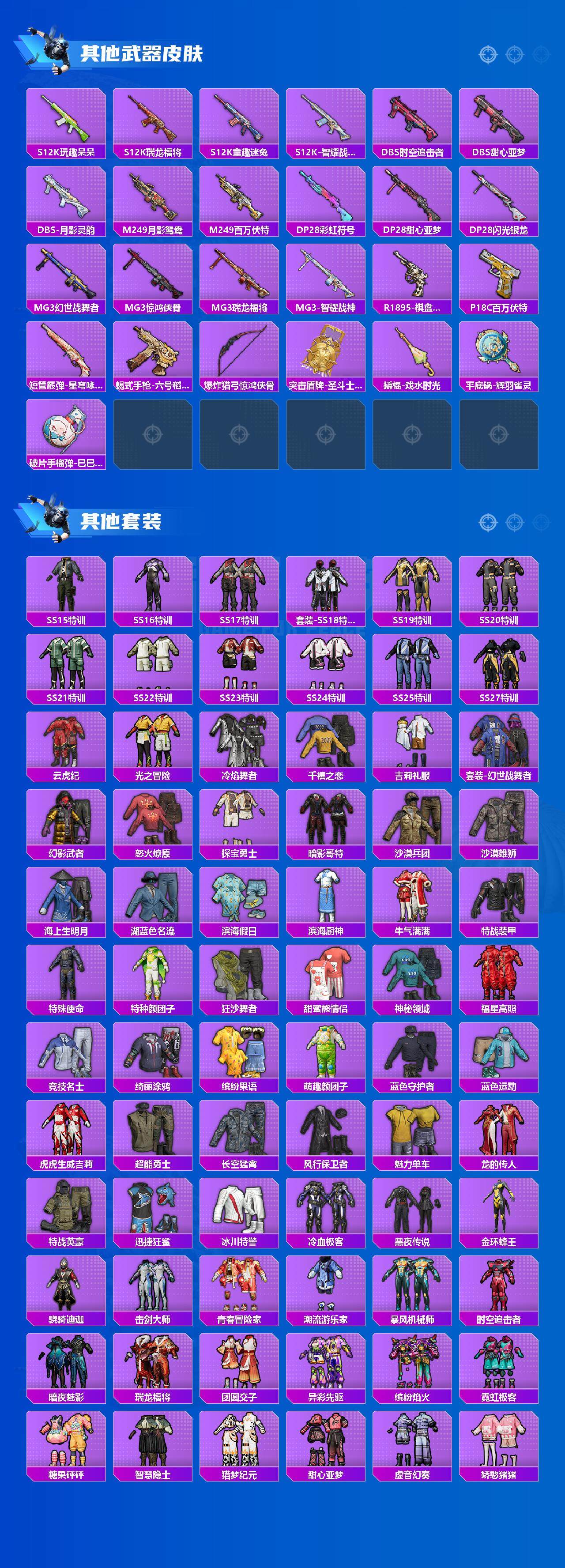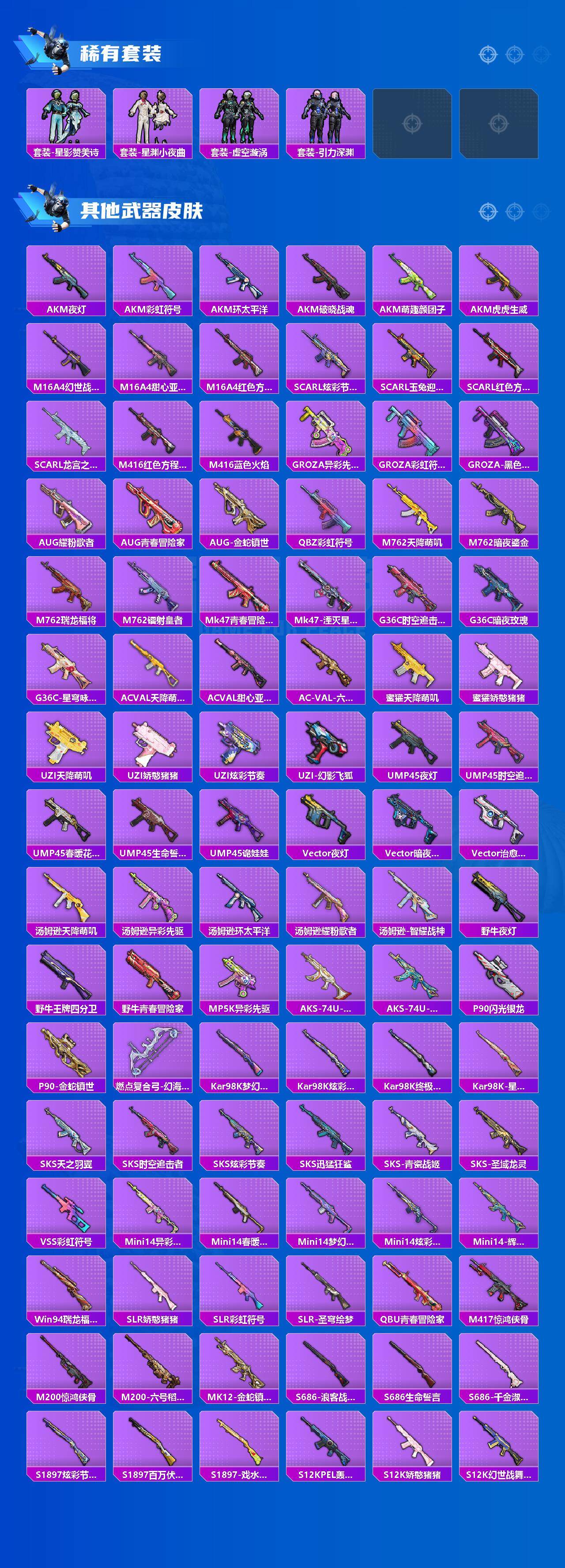 - [11881544]总资产:93.2M 2干员外观 1近战传说 10传说枪械 哈夫币:47.705K 可二次 可修改实名 优质装备:近战-黑海,K416突击步枪-命运(典藏),SCAR-H战斗步枪-电玩高手 烽火地带段位:无段位 全面战场段位:无段位 传说武器皮肤:SCAR-H战斗步枪-水墨云图,725双管霰弹枪-送葬人-无题密令,AK-12突击步枪-夜鹰,M4A1突击步枪-蚀金玫瑰,MP5冲锋枪-黑海,QJB201轻机枪-黑海,CAR-15突击步枪-黑鹰坠落 史诗武器皮肤:MP7冲锋枪-原型机(典藏),PSG-1射手步枪-原型机(典藏),AUG突击步枪-蝮蛇,SG552突击步枪-尖端治疗,M1014霰弹枪-林中猎手,M700狙击步枪-守夜人,Ash-12战斗步枪-守夜人,SR-25射手步枪-尖端治疗,AKM突击步枪-林中猎手,M16A4突击步枪-竞赛选手,M250通用机枪-囚徒,SV-98狙击步枪-林中猎手,PTR-32突击步枪-英雄,AS Val突击步枪-典狱官,PSG-1射手步枪-无垢,PKM通用机枪-荒野求生,S12K霰弹枪-曙光 干员外观:红狼-蚀金玫瑰,骇爪-水墨云图