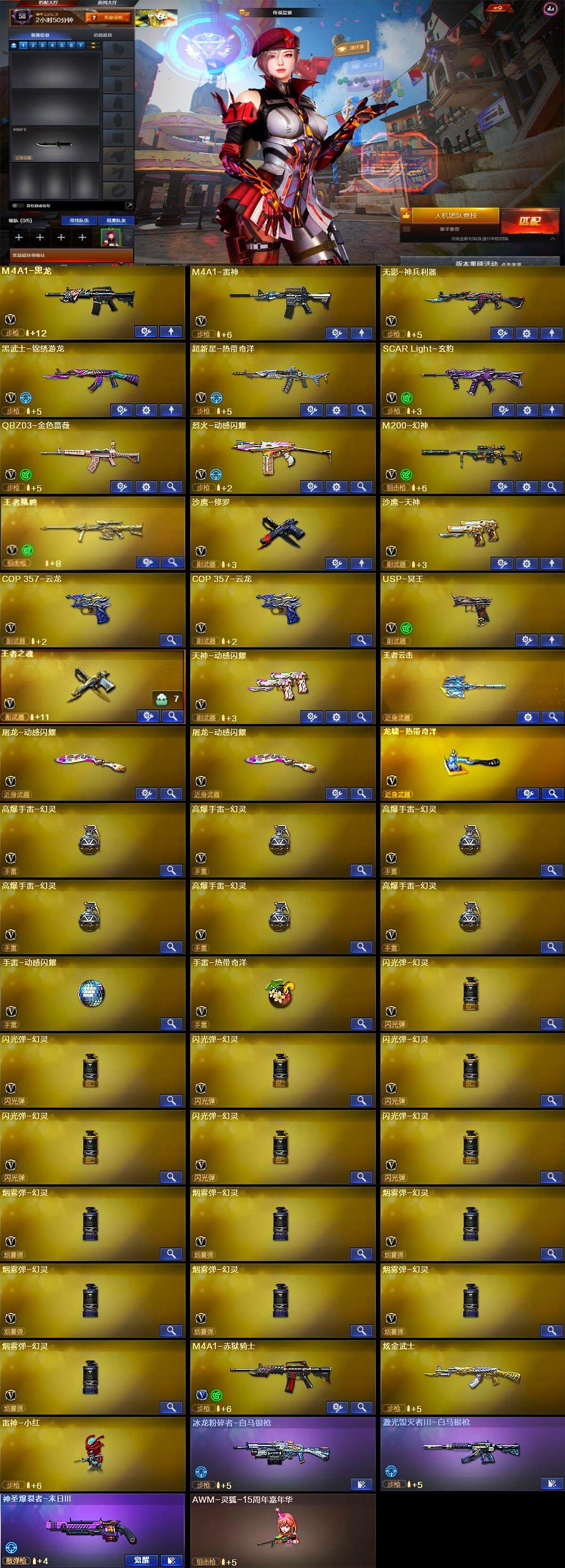 【英雄级武器】:M4A1-黑龙,M4A1-雷神,无影-神兵利器,黑武士-锦绣游龙,超新星-热带奇洋,SCAR Light-玄豹,QBZ03-金色蔷薇,烈火-动感闪耀,M200-幻神,王者凰鸣-觉醒版,沙鹰-修罗,沙鹰-天神,COP 357-云龙*2,USP-冥王,王者之魂-觉醒版,天神-动感闪耀,屠龙-动感闪耀*2,龙啸-热带奇洋,高爆手雷-幻灵*6,手雷-动感闪耀,手雷-热带奇洋,闪光弹-幻灵*7,烟雾弹-幻灵*7,M4A1-赤狱骑士