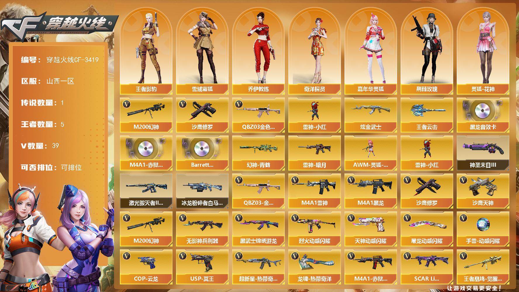 [13654049]山西一区-39V-5王者-1炫金 【传说角色】:传说星骇 【热门武器】:QBZ03-金色蔷薇,M200-幻神,雷神-小红,沙鹰-修罗 【王者炫金武器】:王者云击,炫金武士 【音效卡】:M4A1-黑龙音效卡,M4A1-赤狱骑士-怀旧音效卡,Barrett-碧霄极光音效卡 【皮肤】:幻神-青鹤,雷神-暗月 【角色】:王者影豹,雪域霜狐,奇洋探员,乔伊教练,嘉年华灵狐,荆棘玫瑰,灵狐-花神,曼陀罗-礼服,斯沃特-X,游珑儿 【人偶武器】:雷神-小红,AWM-灵狐-15周年嘉年华 【挑战大师】:冰龙粉碎者-白马银枪,激光毁灭者III-白马银枪,神圣爆裂者-末日III 【英雄级武器】:M4A1-黑龙,M4A1-雷神,无影-神兵利器,黑武士-锦绣游龙,超新星-热带奇洋,SCAR Light-玄豹,QBZ03-金色蔷薇,烈火-动感闪耀,M200-幻神,王者凰鸣-觉醒版,沙鹰-修罗,沙鹰-天神,COP 357-云龙*2,USP-冥王,王者之魂-觉醒版,天神-动感闪耀,屠龙-动感闪耀*2,龙啸-热带奇洋,高爆手雷-幻灵*6,手雷-动感闪耀,手雷-热带奇洋,闪光弹-幻灵*7,烟雾弹-幻灵*7,M4A1-赤狱骑士 【道具】:奇洋探员-海龟背包,女皇终结者-背包,热带奇洋炫彩背包,雪域霜狐炫彩背包,女皇终结者-魔龙之吻,救世主-黑桃战神,生化弹匣,夺命之镰,防化服,金色流光-枪王排位*2,星辰流光-枪王排位,枪王排位28赛季金色流光,枪王排位29赛季金色流光,语音特效-怀旧,雪域霜狐表情,热带奇洋表情,动感闪耀表情,防弹头盔*2,防弹衣*2,C4工具钳*2,手雷包*2 【特殊枪械】: