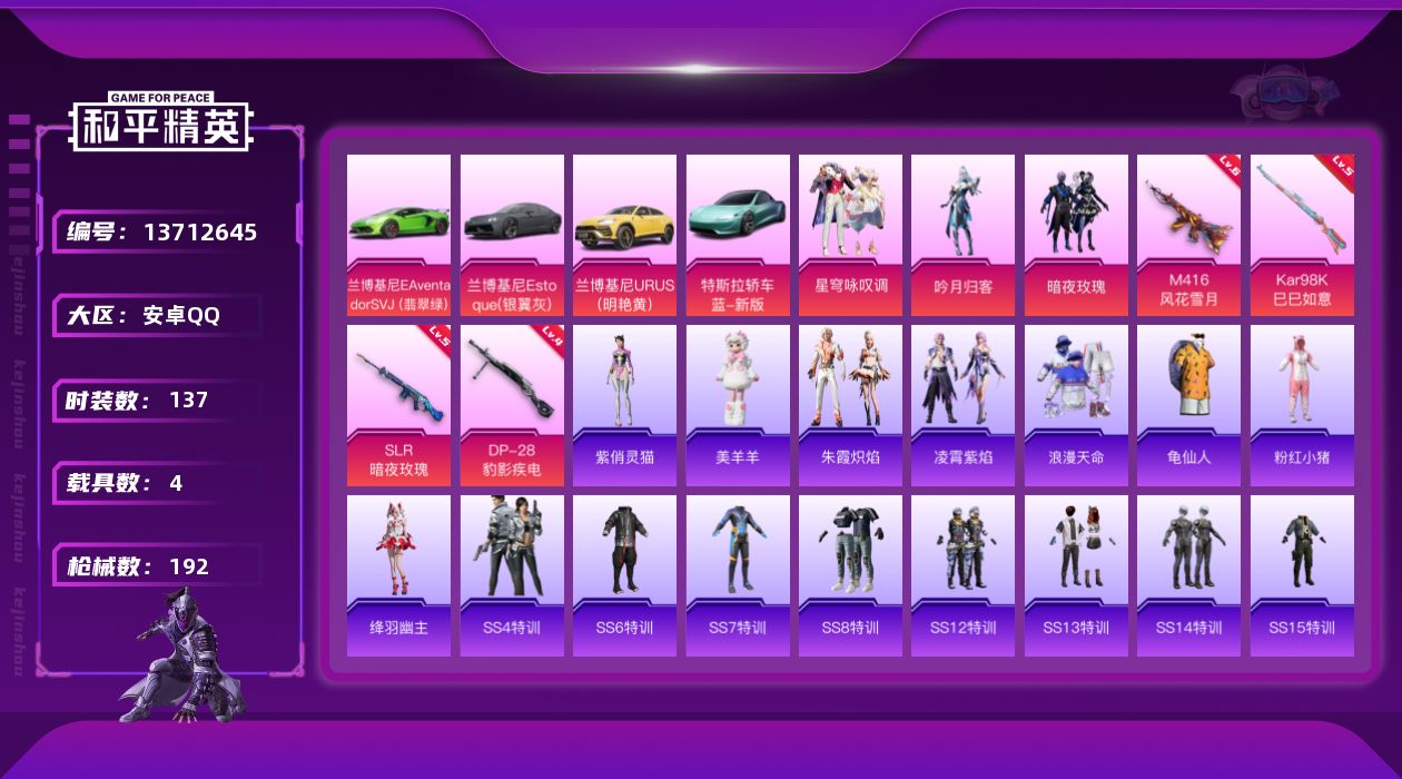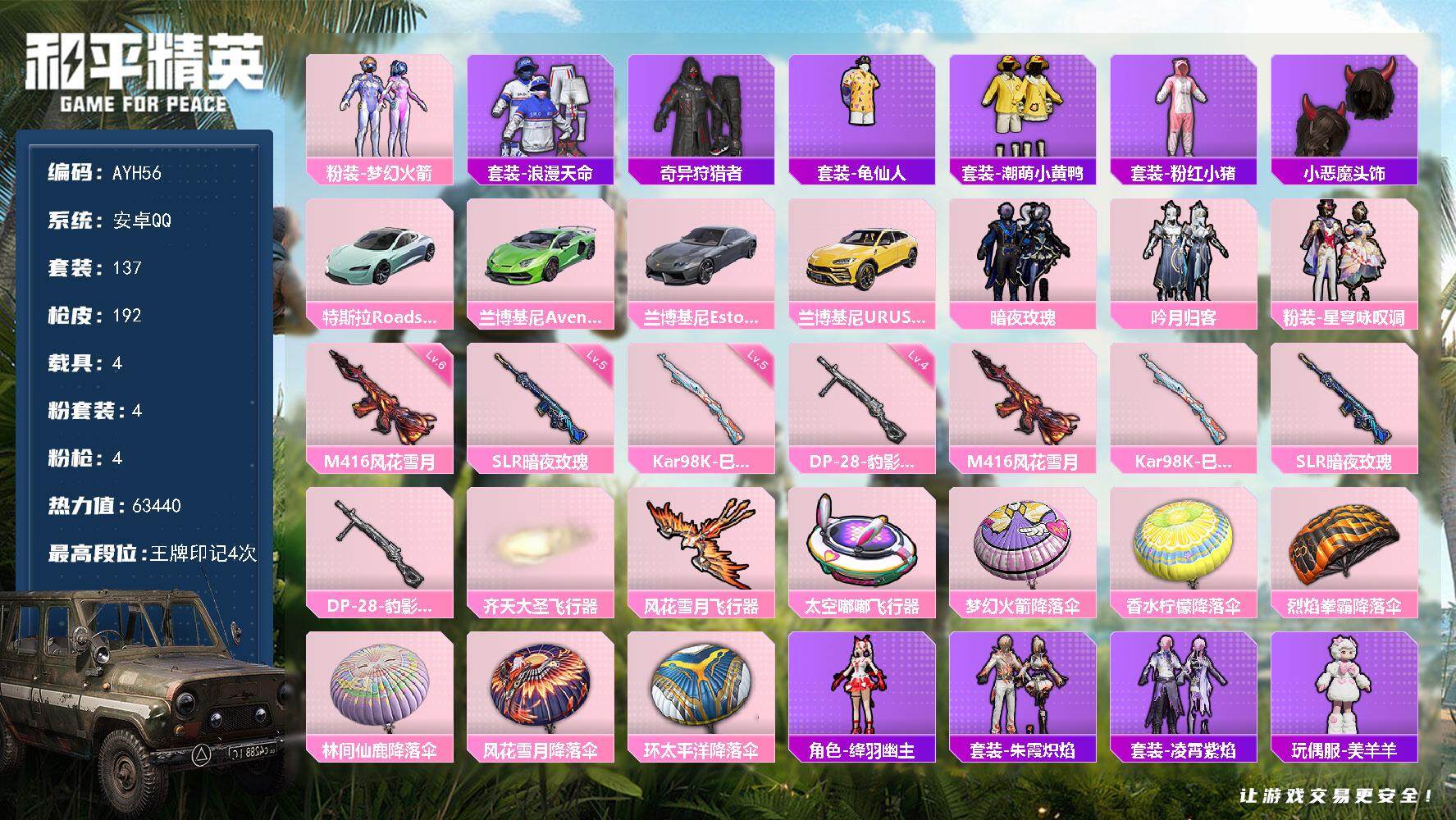 [13712645]【店主推荐捡漏号!可直接换绑】地铁满天赋安卓 手Q-4粉装-4特效枪-4载具-3粉色飞行器-63440热力值-4王牌印记-137套装-192枪皮热门品类】:粉装-梦幻火箭,套装-浪漫天命,套装-奇异狩猎者,套装-龟仙人,套装-潮萌小黄鸭,套装-粉红小猪,小恶魔头饰【粉色载具】:特斯拉Roadster(水滴蓝),兰博基尼Aventador SVJ(翡翠绿),兰博基尼Estoque(银翼灰),兰博基尼URUS(明艳黄)【粉色套装】:粉装-梦幻火箭,粉装-暗夜玫瑰,粉装-吟月归客,粉装-星穹咏叹调【粉色枪皮等级】:M416-风花雪月(六级),Kar98K-巳巳如意(五级),SLR-暗夜玫瑰(五级),DP-28-豹影疾电(四级)【粉色枪皮】:M416-风花雪月,Kar98K-巳巳如意,SLR-暗夜玫瑰,DP-28-豹影疾电【粉色飞行器】:齐天大圣飞行器,风花雪月飞行器,太空嘟嘟飞行器