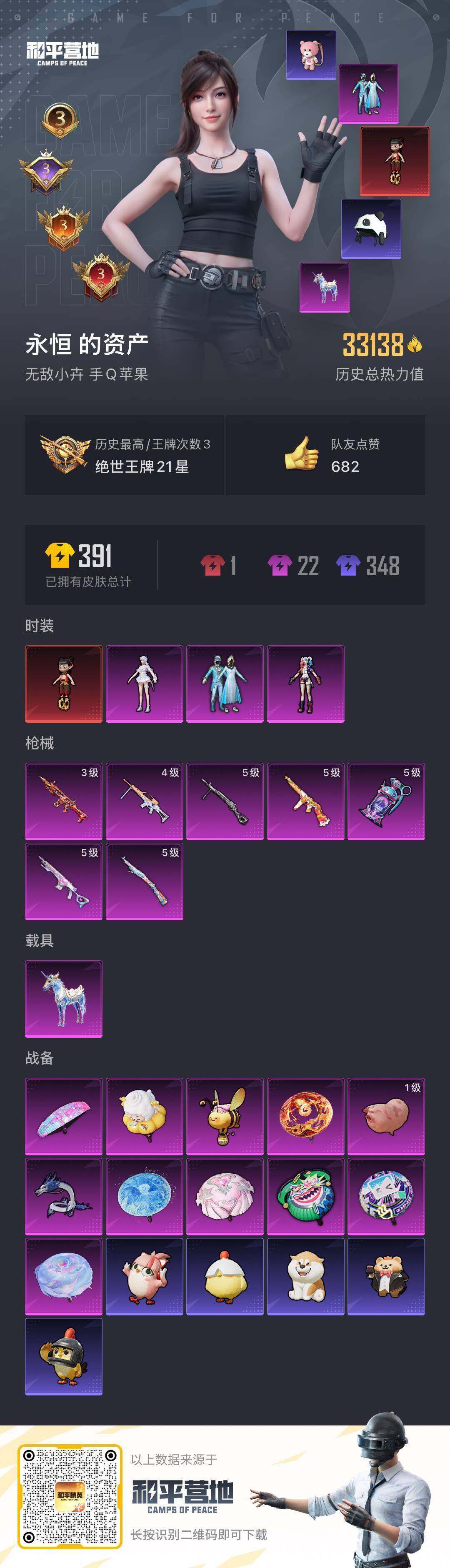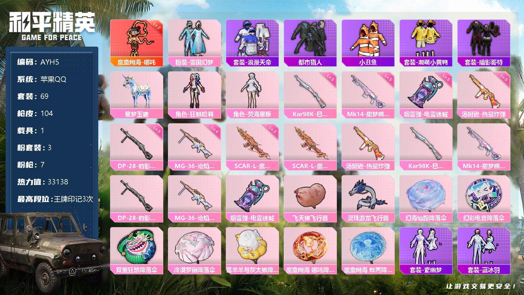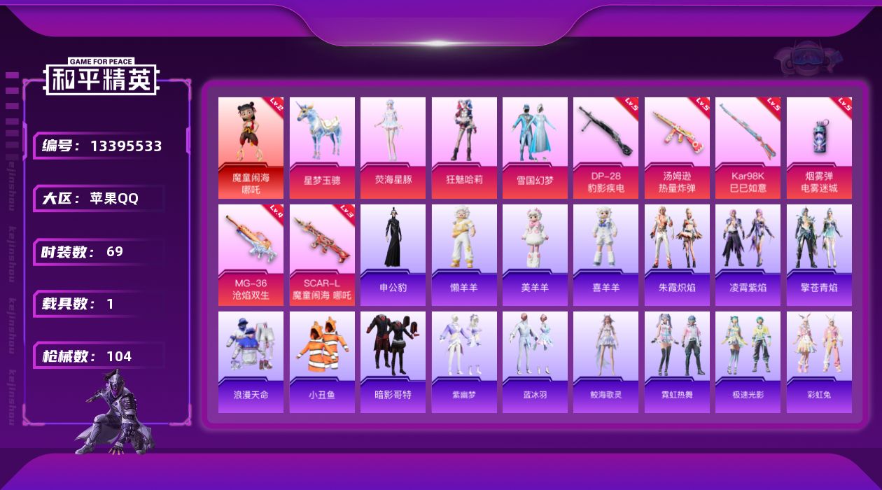[13395533]【店主推荐捡漏号!可直接换绑】苹果 手Q-1神装-3粉装-7特效枪-1载具-3粉色飞行器-33138热力值-3王牌印记-69套装-104枪皮【红色神装等级】:魔童闹海-哪吒(二级)【红色角色神装】:魔童闹海-哪吒【热门品类】:粉装-雪国幻梦,套装-浪漫天命,套装-都市猎人,套装-小丑鱼,套装-潮萌小黄鸭,套装-暗影哥特【粉色载具】:星梦玉骢【粉色套装】:粉装-雪国幻梦,角色-狂魅哈莉,角色-荧海星豚【粉色枪皮等级】:SCAR-L-魔童闹海 哪吒(三级),汤姆逊-热量炸弹(五级),Kar98K-巳巳如意(五级),Mk14-甜梦熊击(五级),DP-28-豹影疾电(五级),MG-36-沧焰双生(四级),烟雾弹-电雾迷城(五级)【粉色枪皮】:SCAR-L-魔童闹海 哪吒,汤姆逊-热量炸弹,Kar98K-巳巳如意,Mk14-甜梦熊击,DP-28-豹影疾电,MG-36-沧焰双生,烟雾弹-电雾迷城【粉色飞行器】:飞天猪飞行器,灵珠游龙飞行器